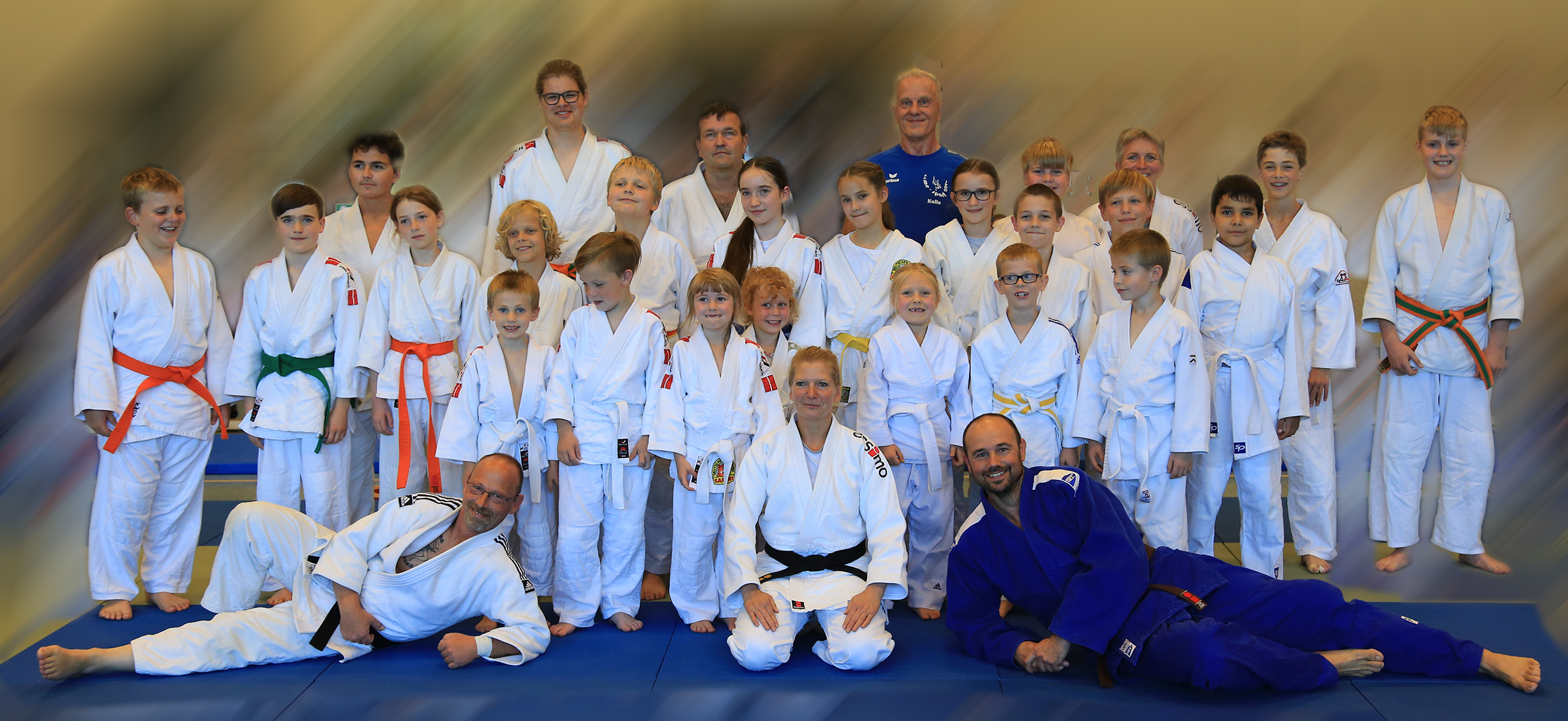 Gruppe von zehn Jungen und Mädchen in Judokis mit verschiedenen Gürtel-Farben vor einem blauen Hintergrund.