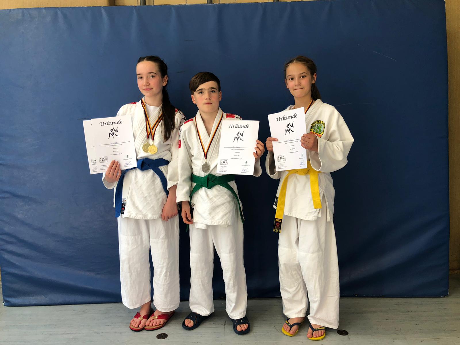 Drei Kinder im Judoanzug halten Urkunden und Medaillen der Bezirksmeisterschaft 2024 U15. Hintergrund in Einfarbig.