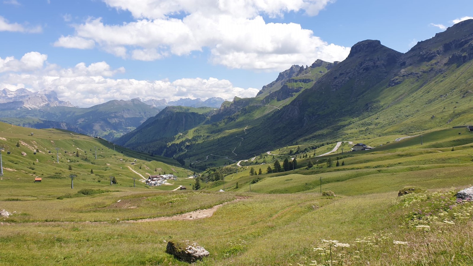 Zwei Radfahrer fahren die Straße hinauf, vorbei an einem Hotel und mehreren Verkehrsschildern zum Mendolapass.