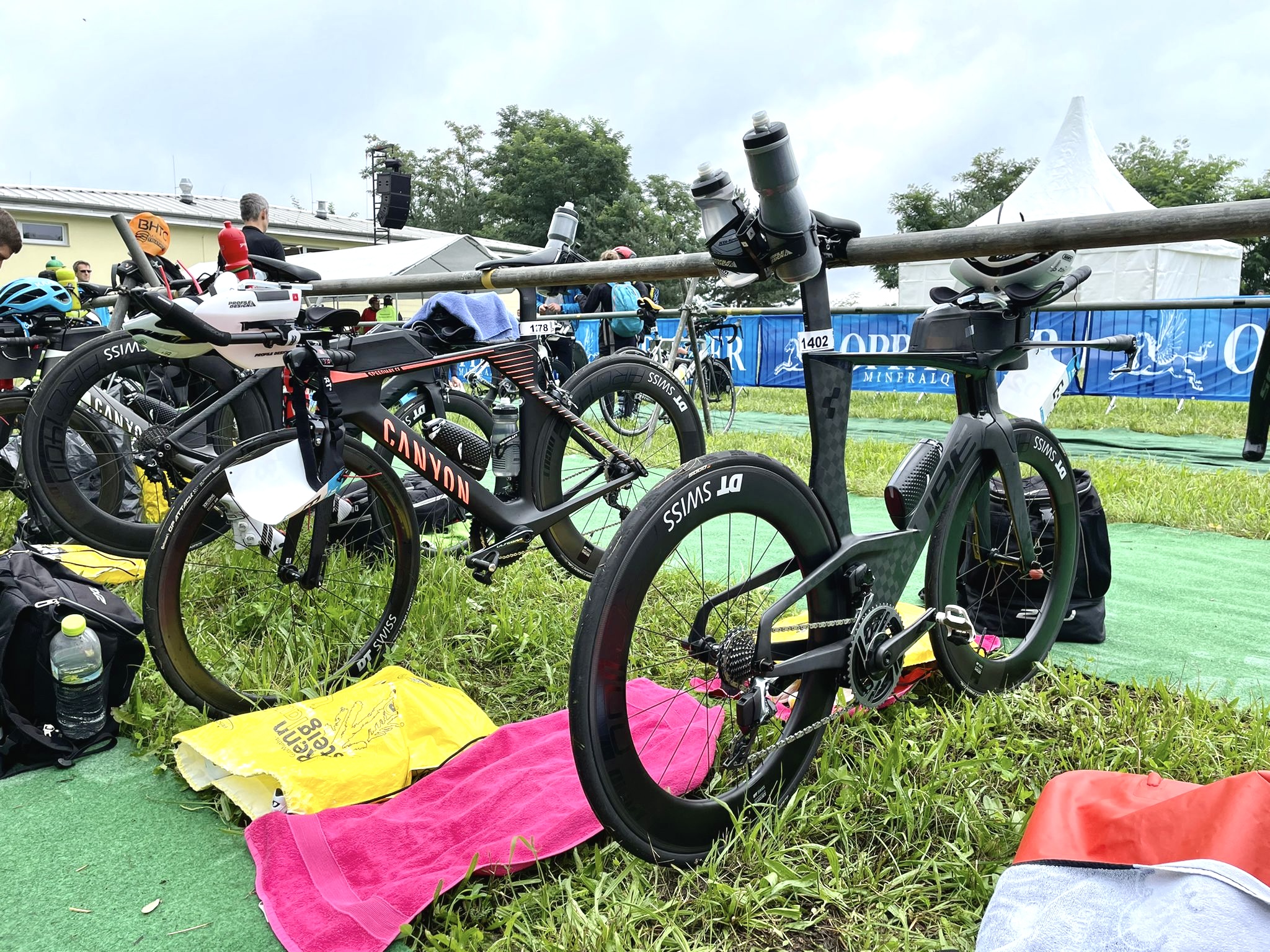 Drei Männer in Radbekleidung stehen unter einem blauen Zelt und lächeln in die Kamera, im Hintergrund sind weitere Personen sichtbar.