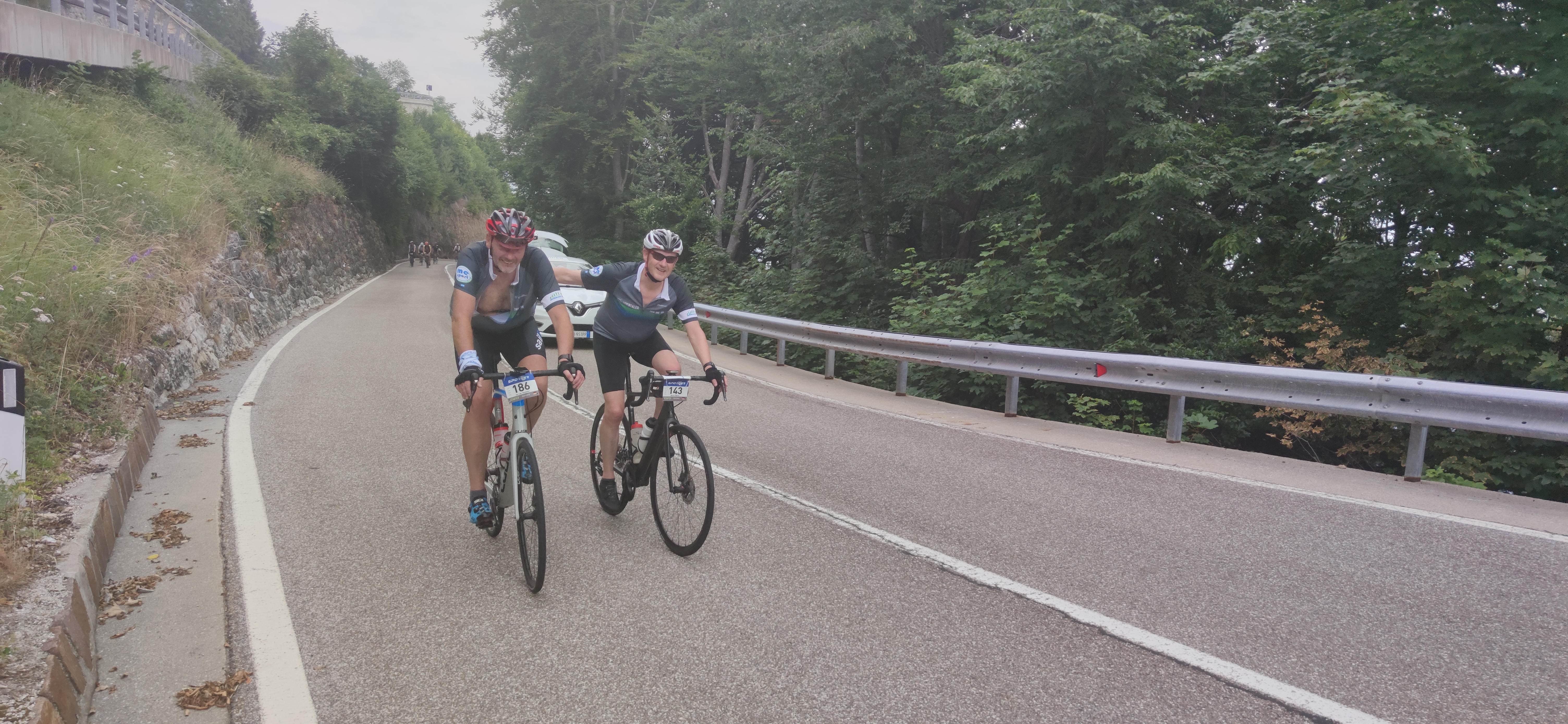 Zwei Radfahrer in Sportbekleidung fahren lächelnd eine kurvenreiche Straße entlang, umgeben von Bäumen.