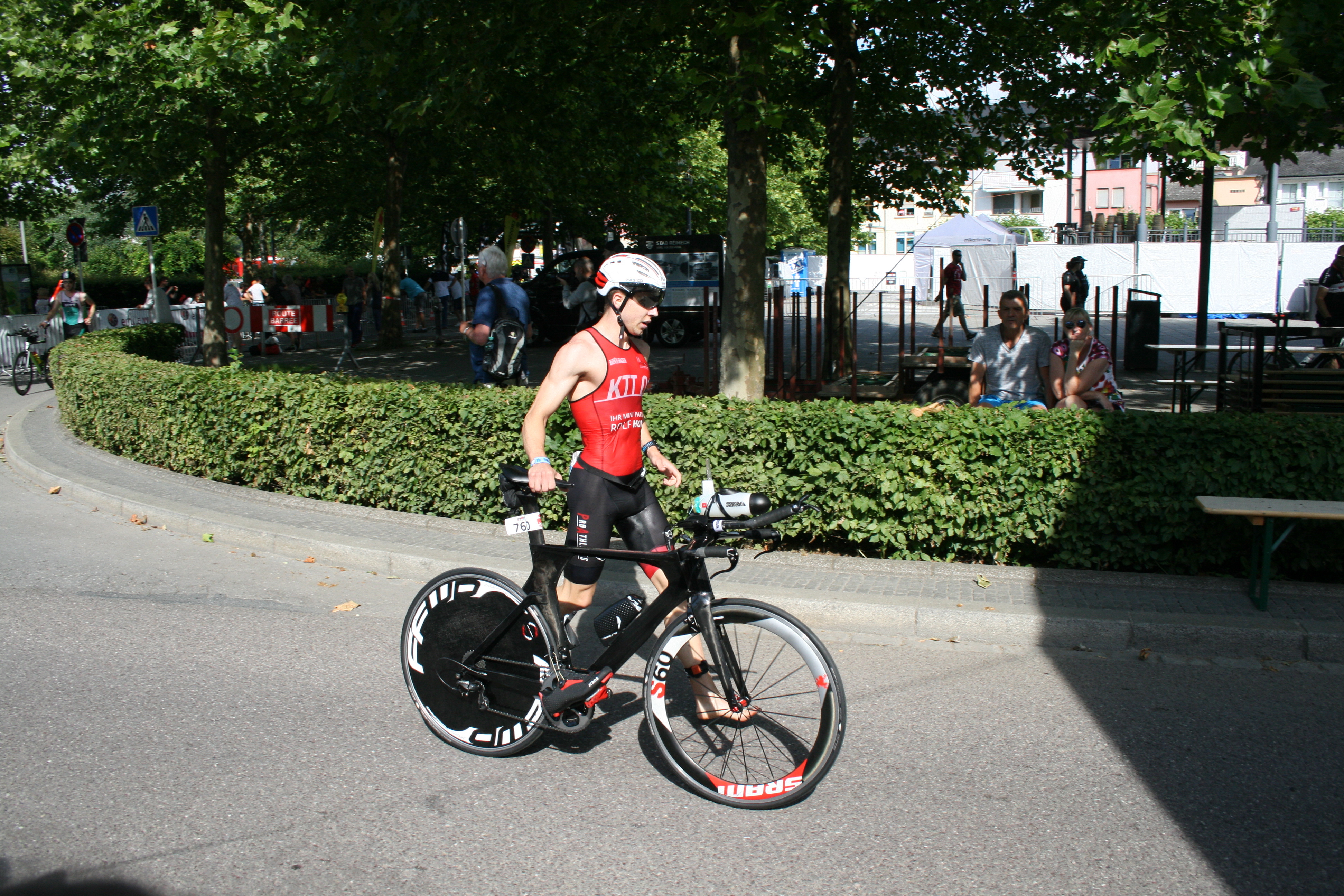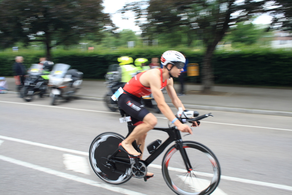 Triathlet in Sportkleidung fährt auf einem Rennrad eine Straße entlang, Zuschauer sitzen am Rand.
