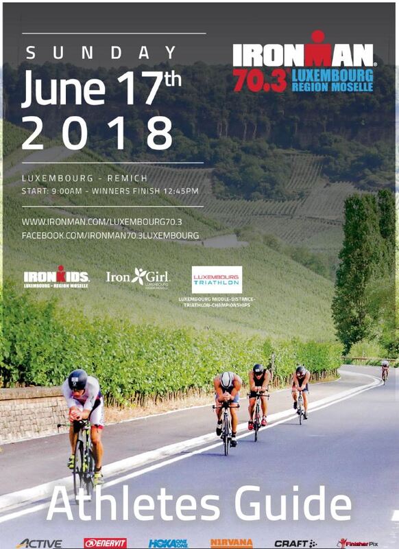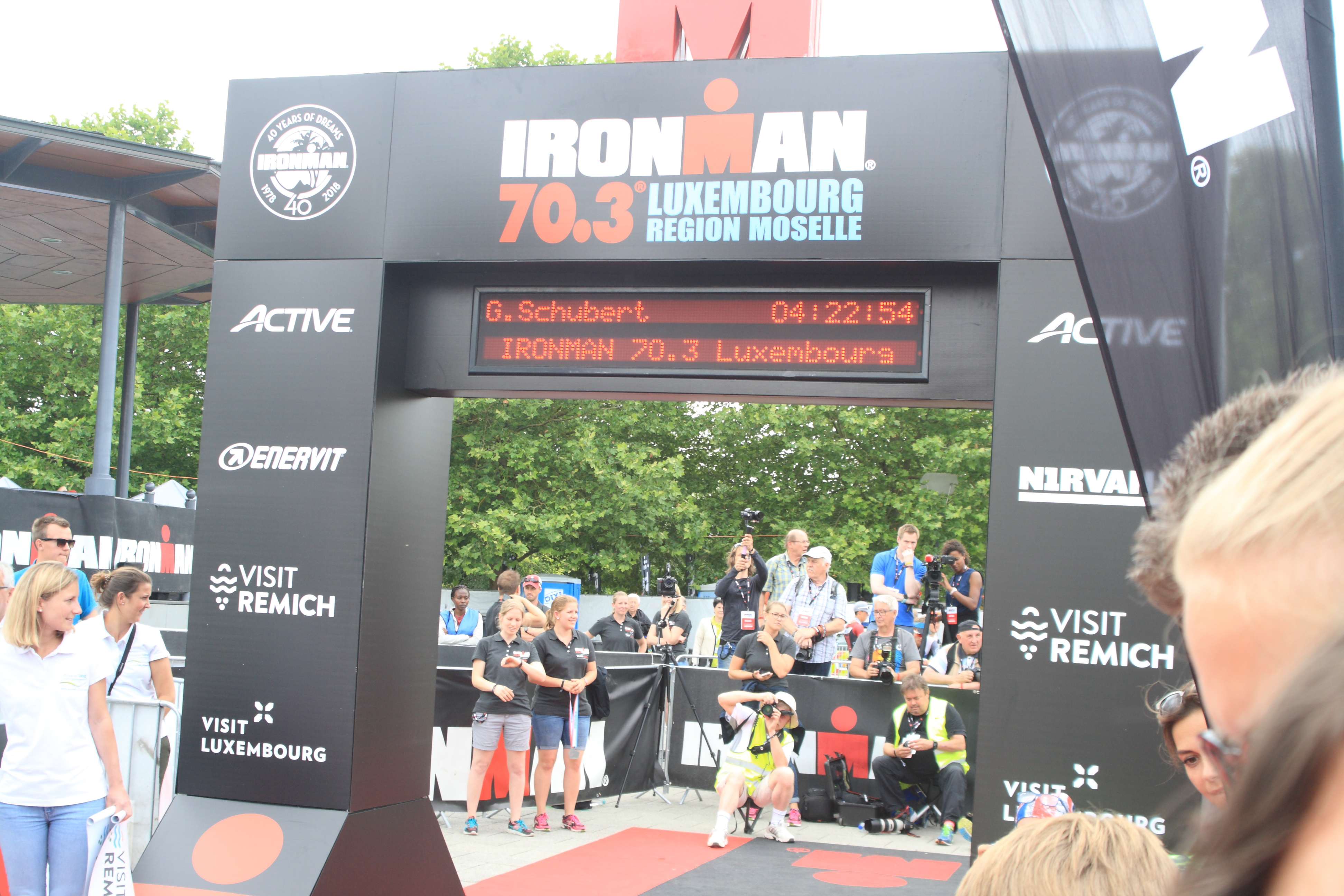Zielbogen des IRONMAN 70.3 Luxembourg mit Zeit und Teilnehmername, umgeben von Zuschauern und Kameraleuten.