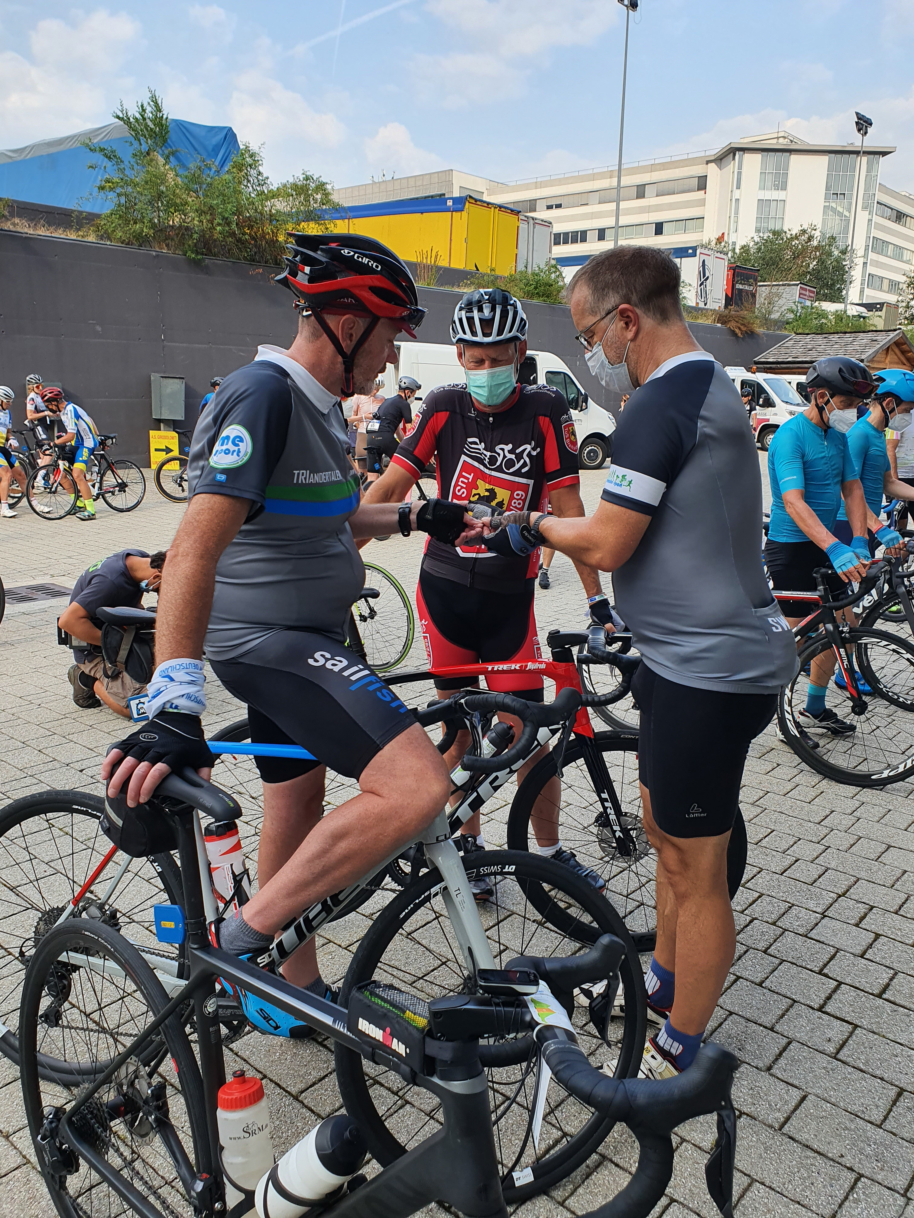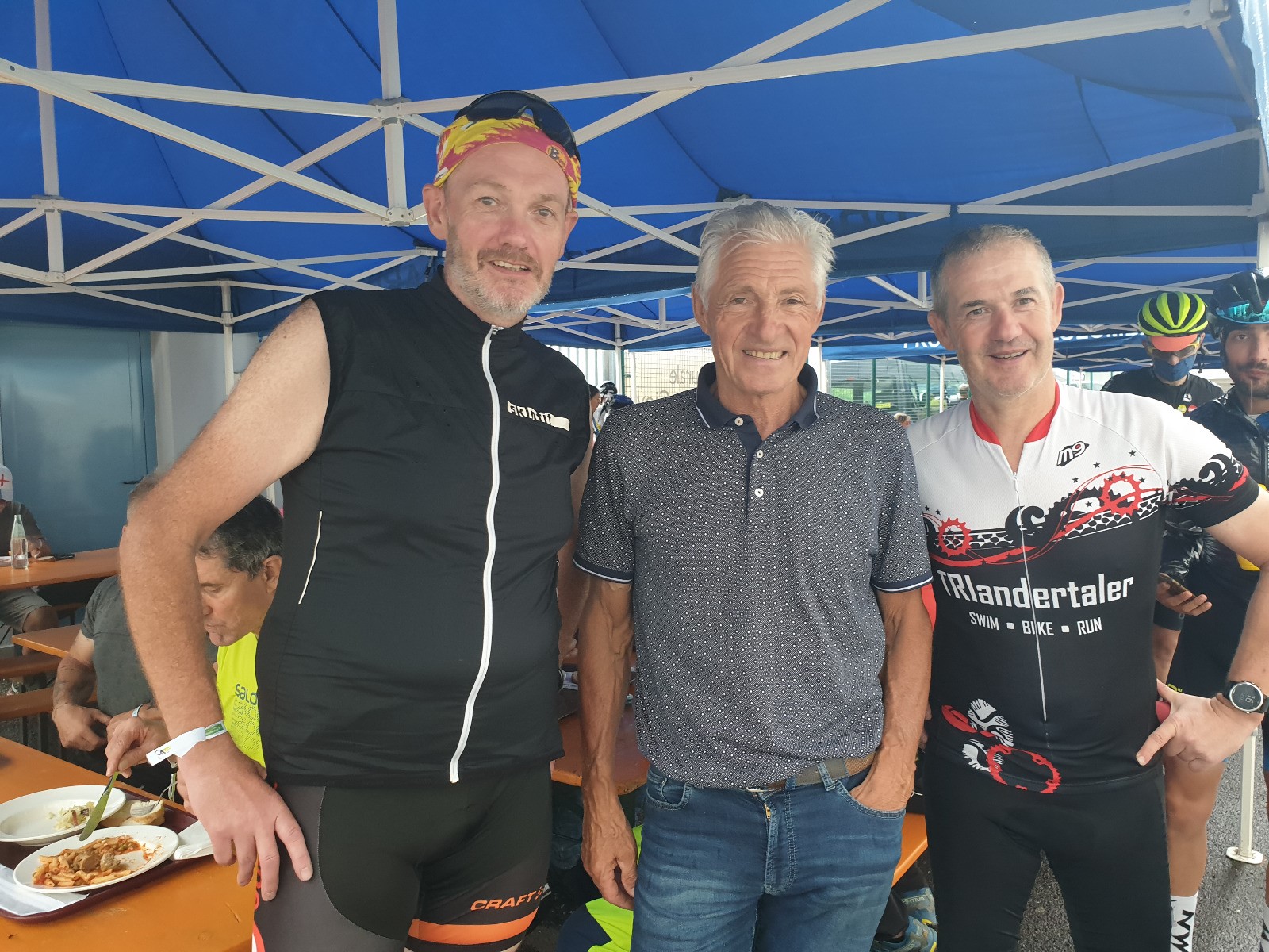 Drei Radfahrer stehen in einer Sportveranstaltung unter einem blauen Zelt und lächeln in die Kamera.
