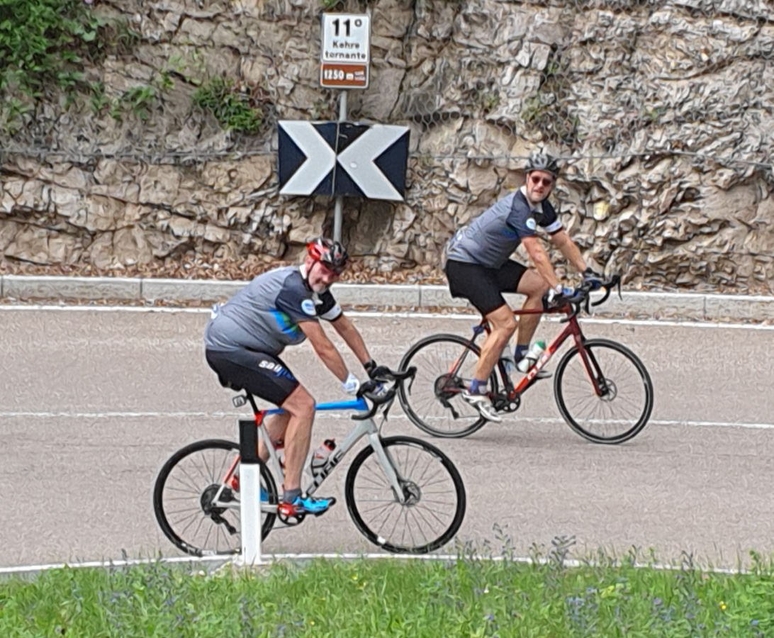 Zwei Radfahrer fahren auf einer Straße vorbei an einem Hotel und Verkehrsschildern zum Pass Mendola.
