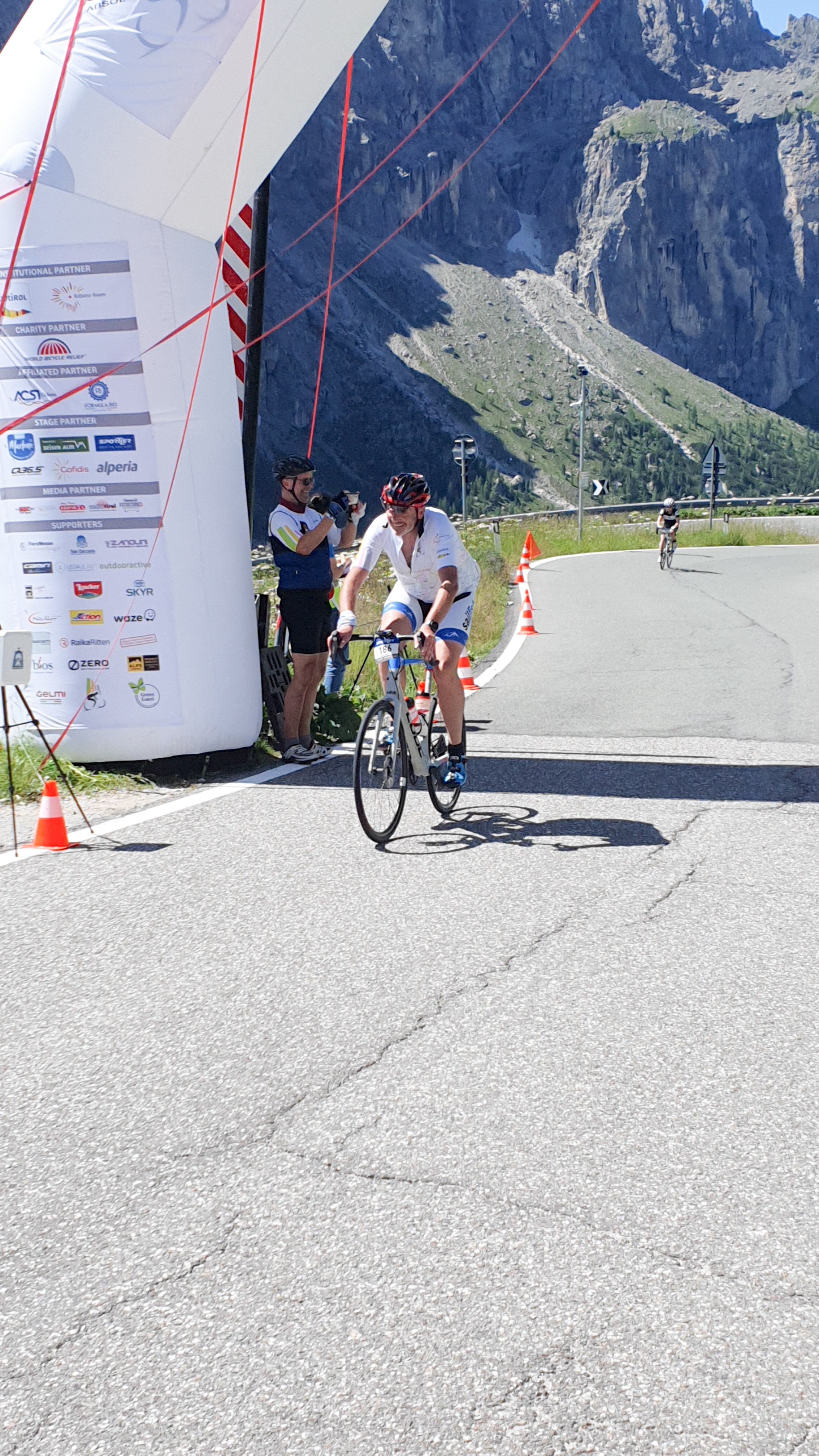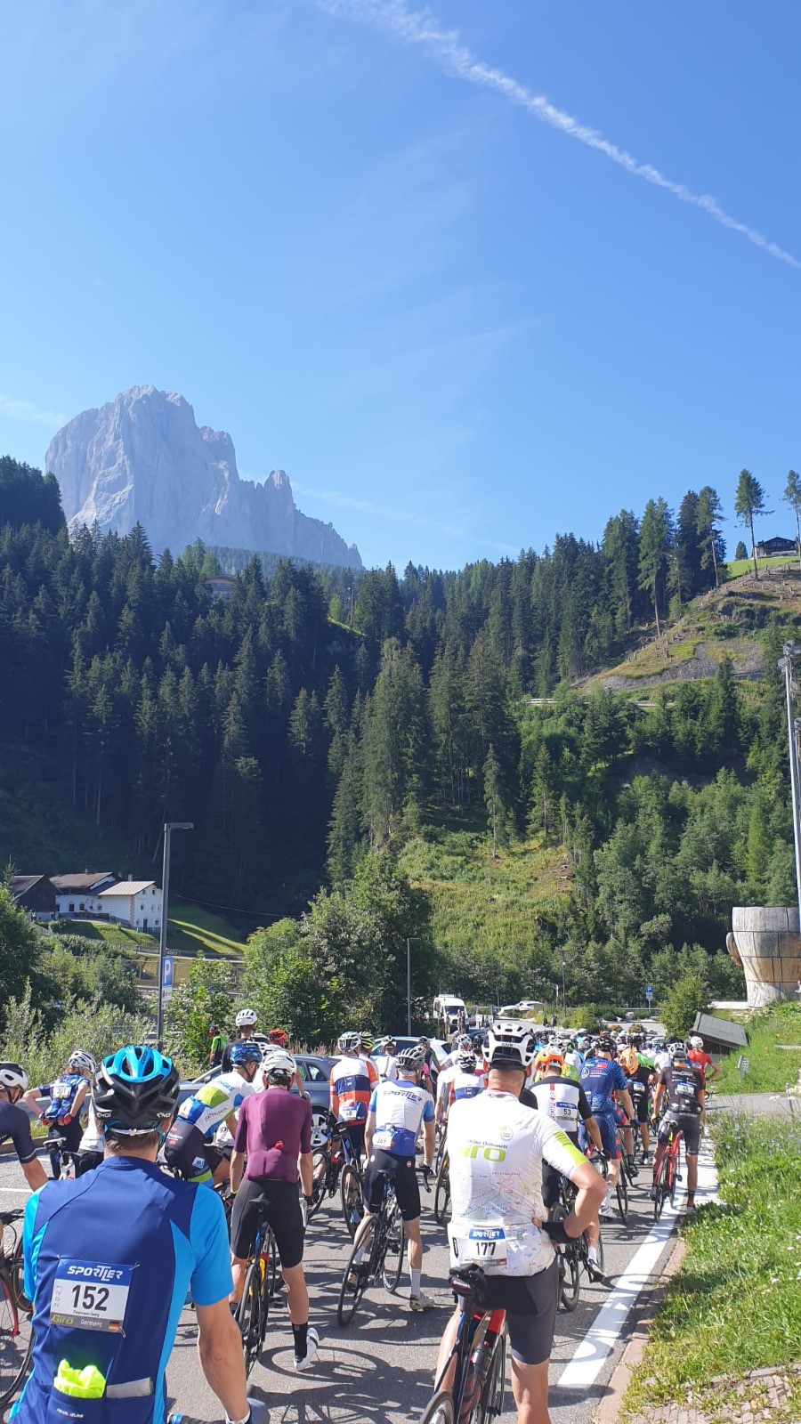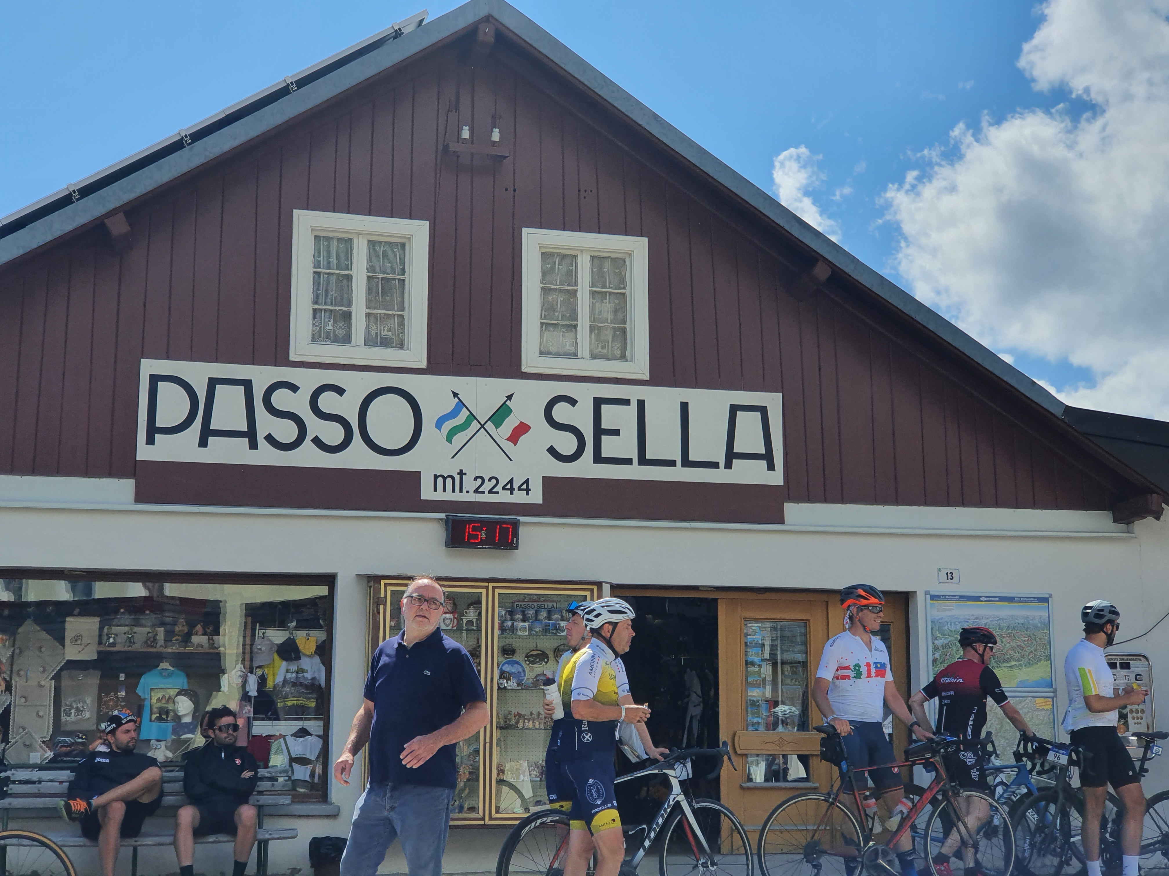 Gruppierung von Radfahrern neben einem Auto vor einer Berglandschaft, beschildert mit "passo Sella".