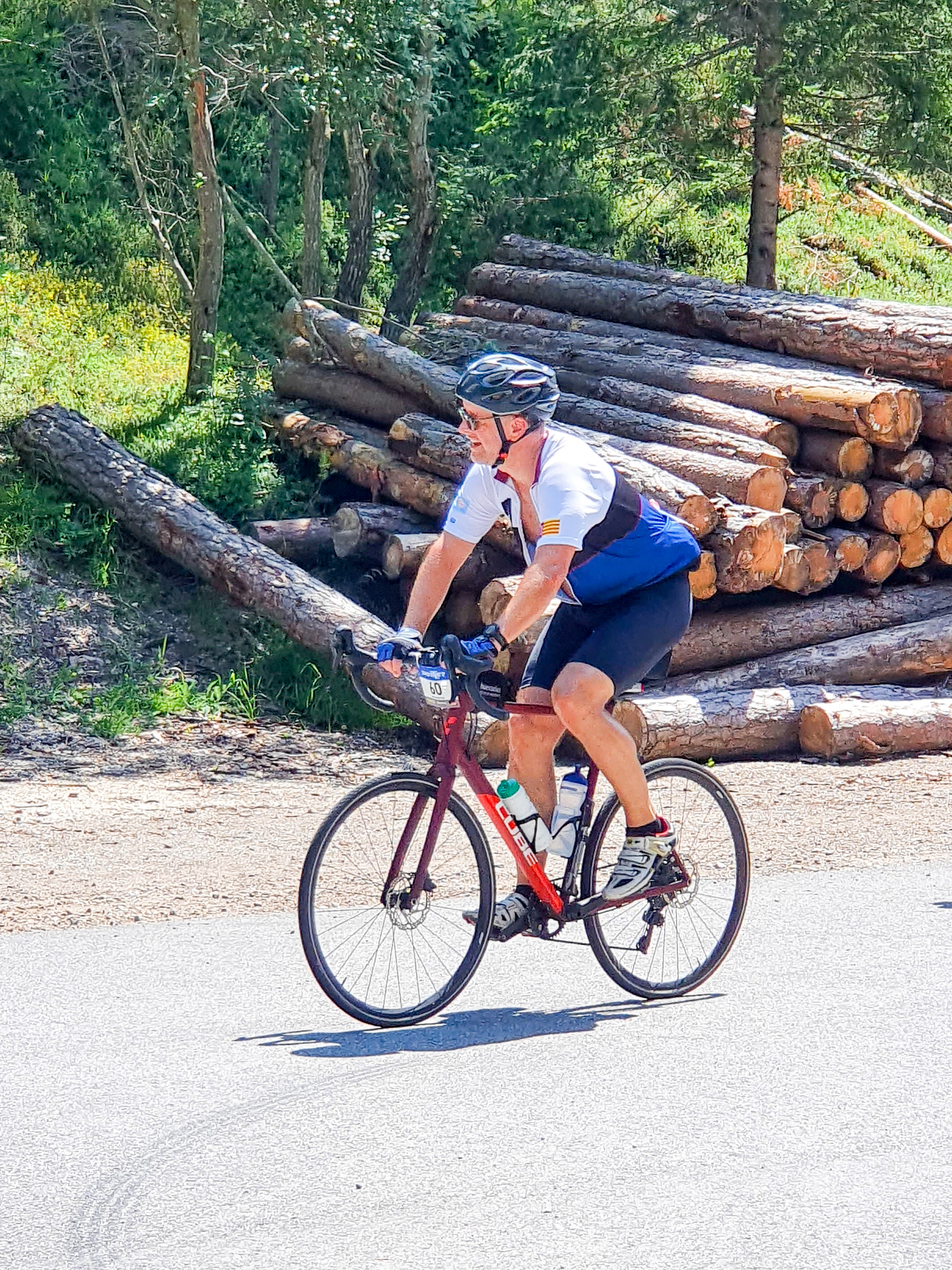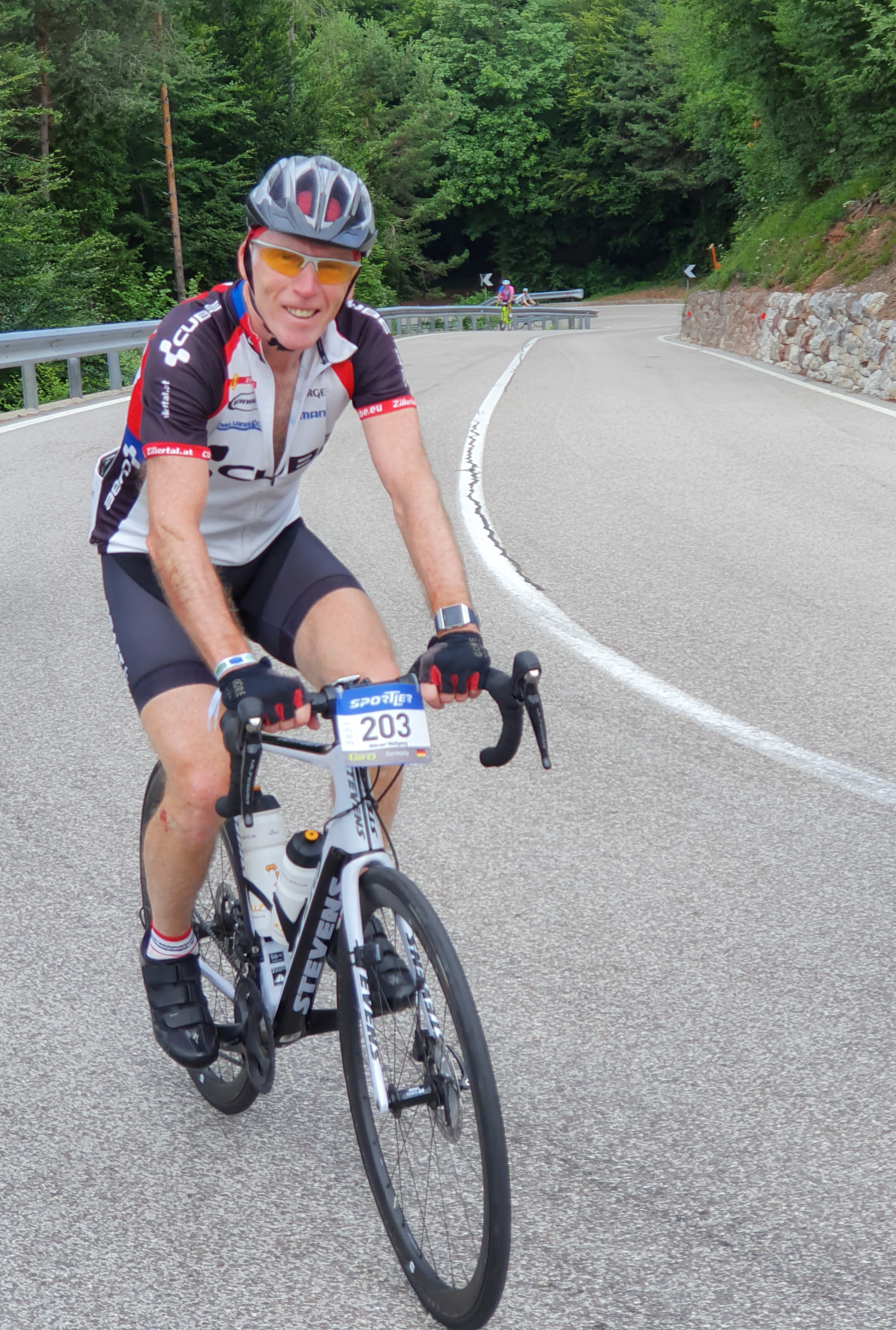 Selbstporträt eines Radfahrers mit Helm und Brille, anderen Radfahrern im Hintergrund und Weinreben unterhalb der Berge.