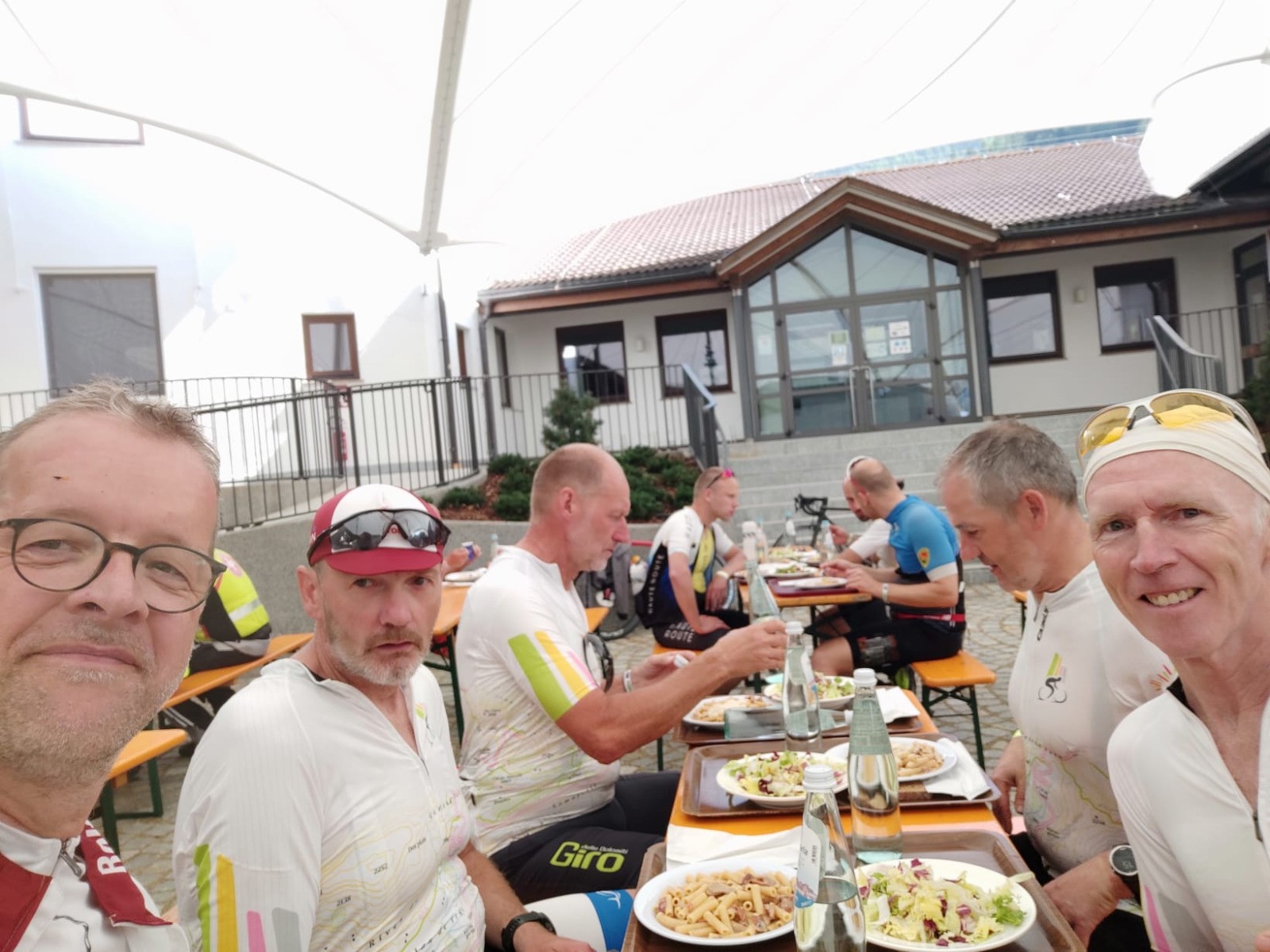 Gruppe von Radfahrern in Sportkleidung steht neben Fahrrädern, umgeben von einer grünen Landschaft und Bergen.