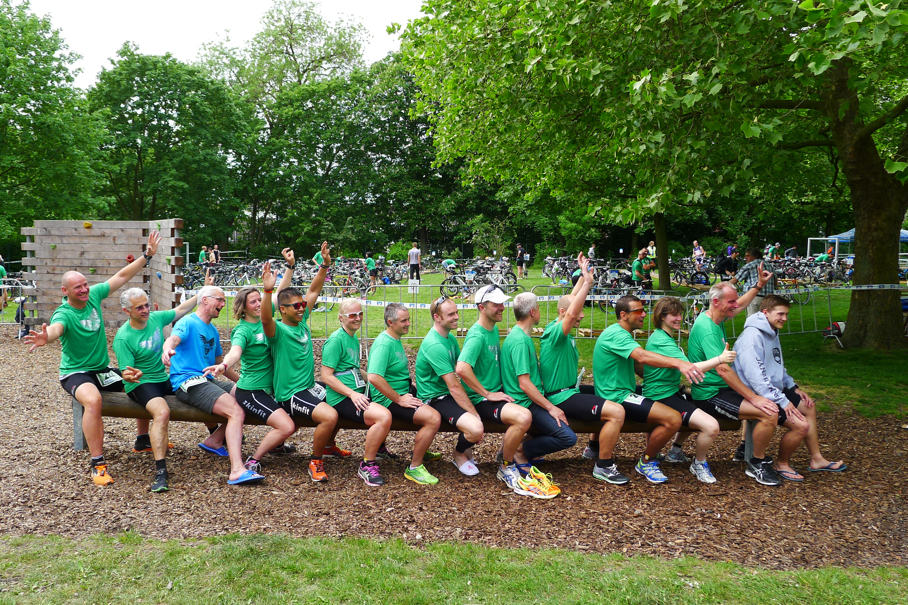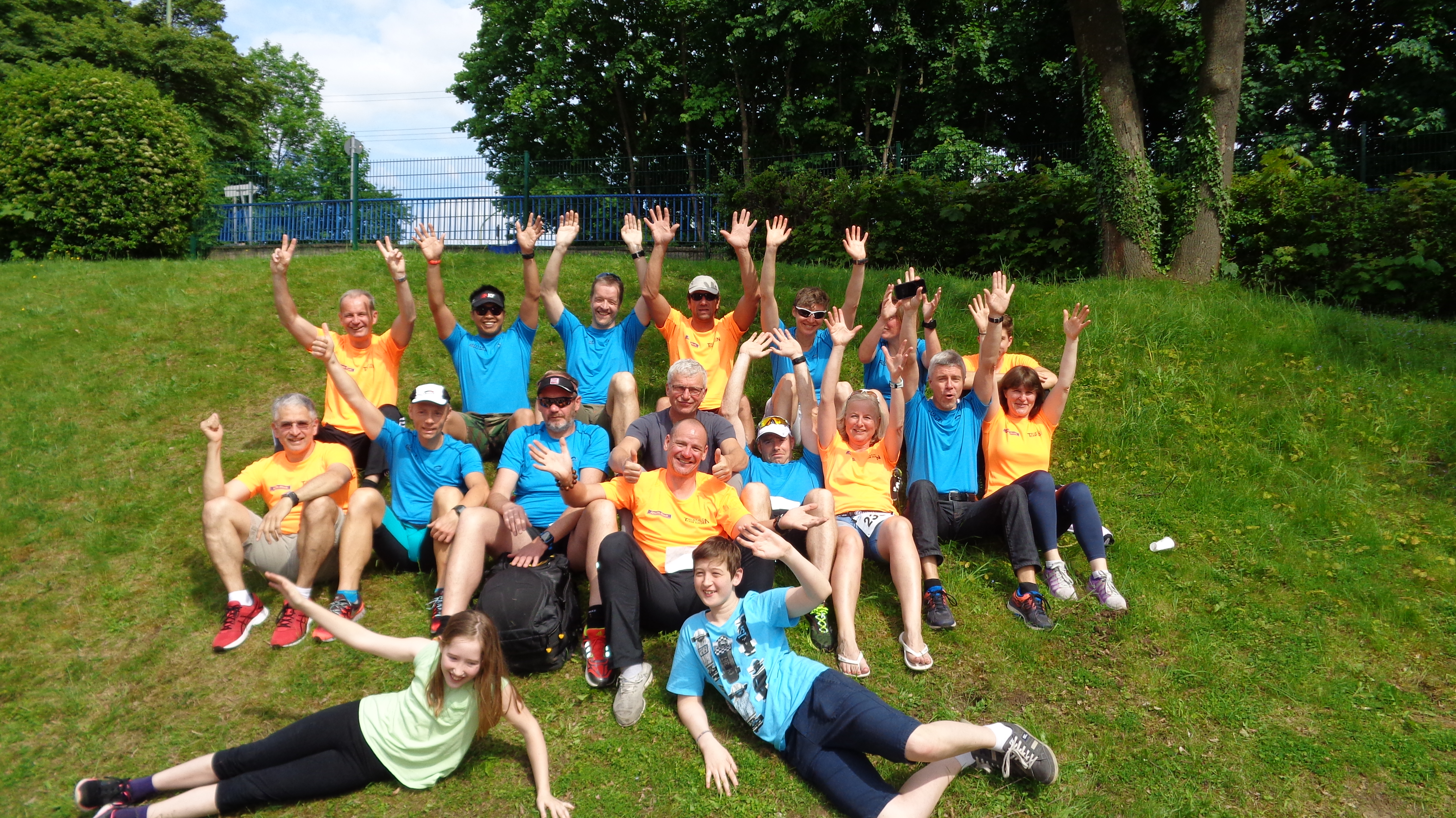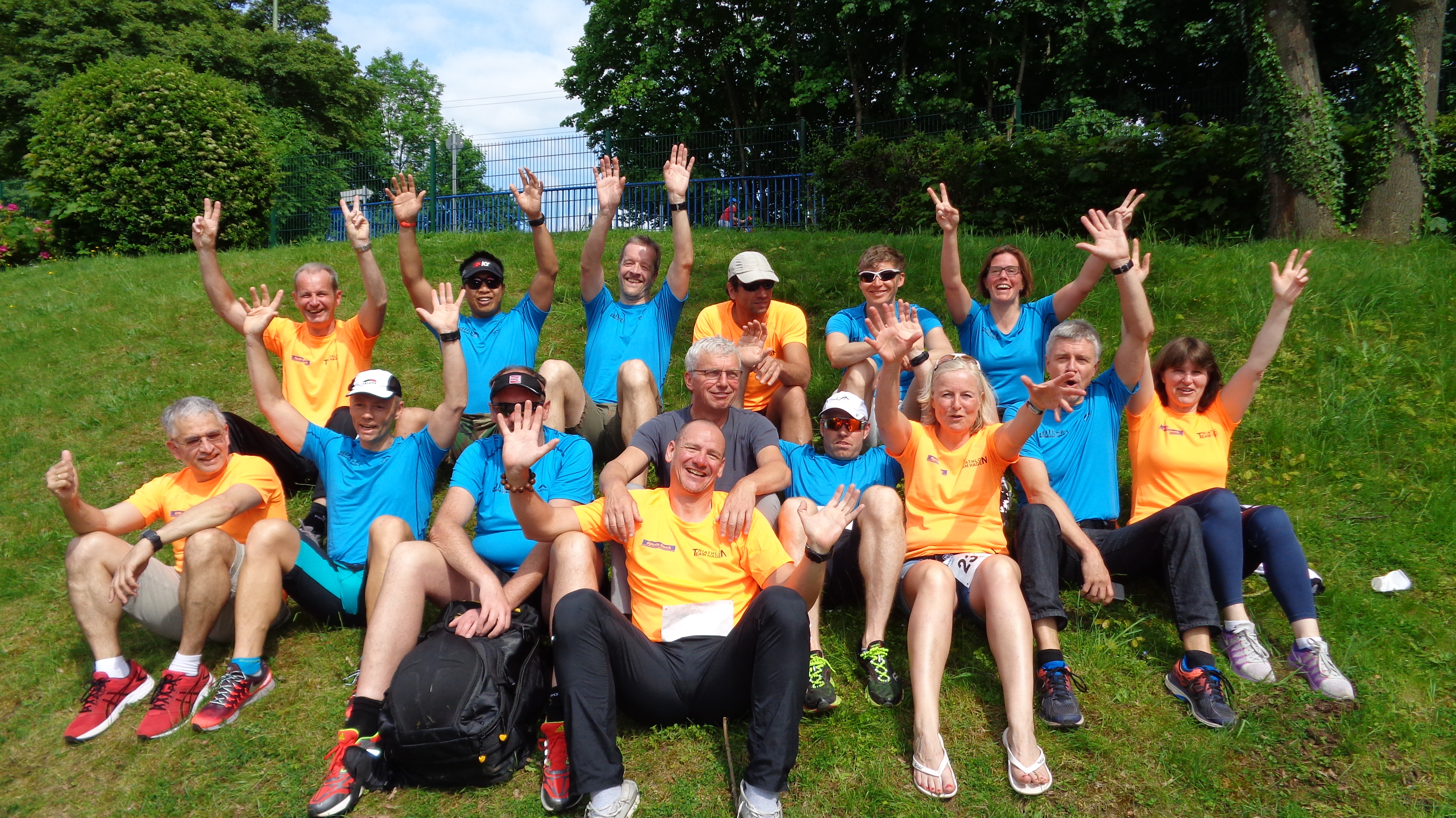 Gruppenselfie von Athleten in Sportanzügen auf einer Wiese, umgeben von Bäumen und Zuschauern im Hintergrund.