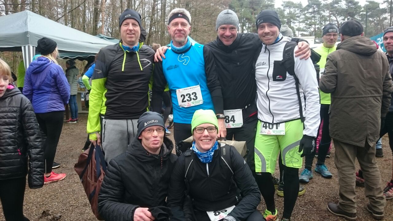 Sechs Teilnehmer eines Laufwettbewerbs posieren nach dem Rennen in sportlicher Kleidung auf einem Veranstaltungsgelände.