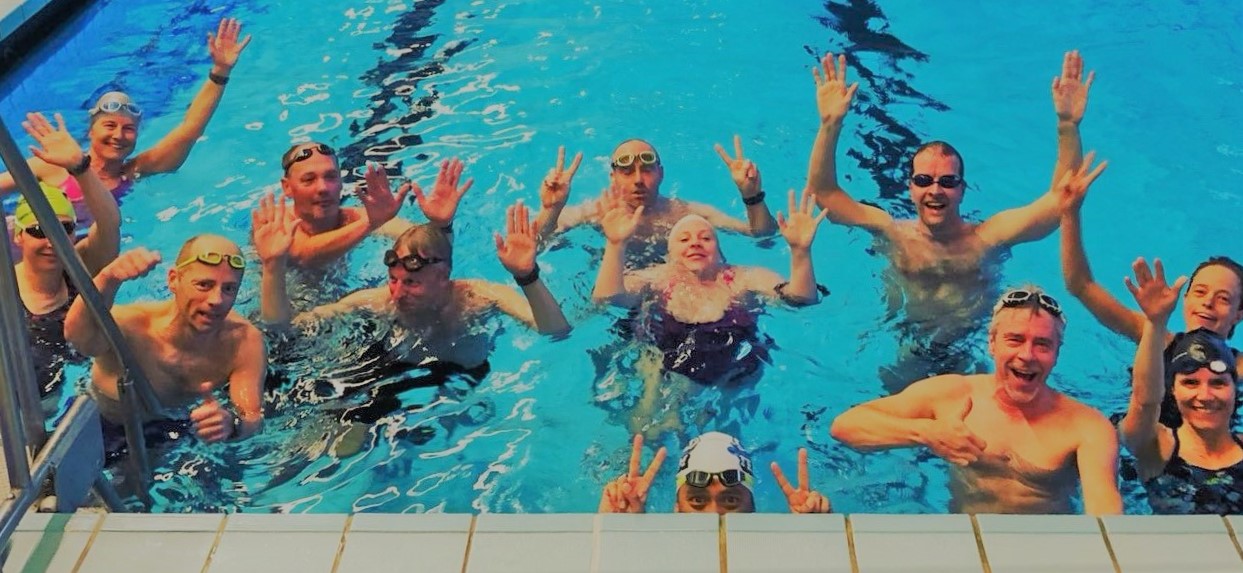 Gruppenselfie von Schwimmern im Wasser, die freundlich in die Kamera winken und zwei Finger hochhalten.