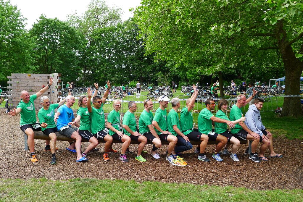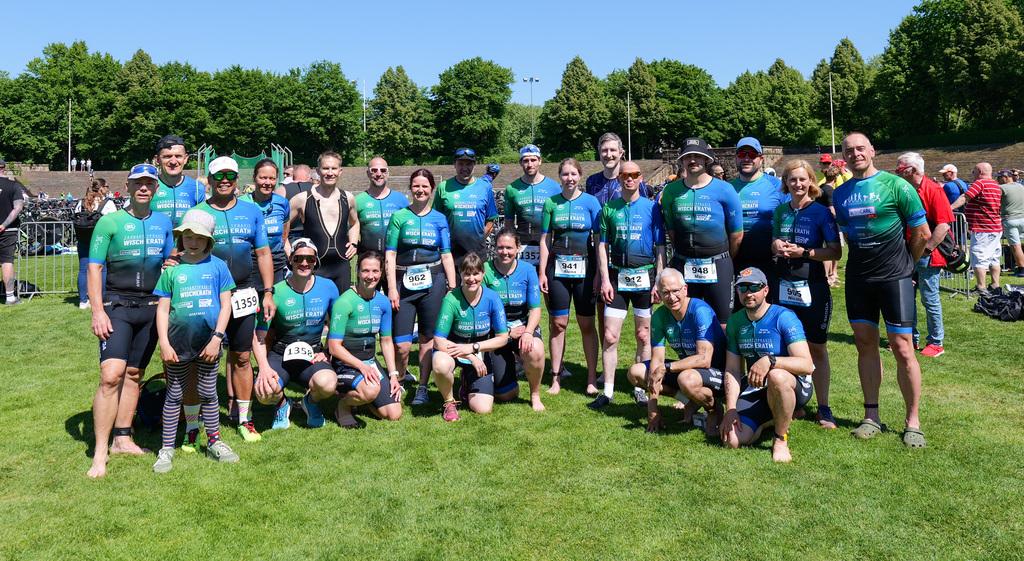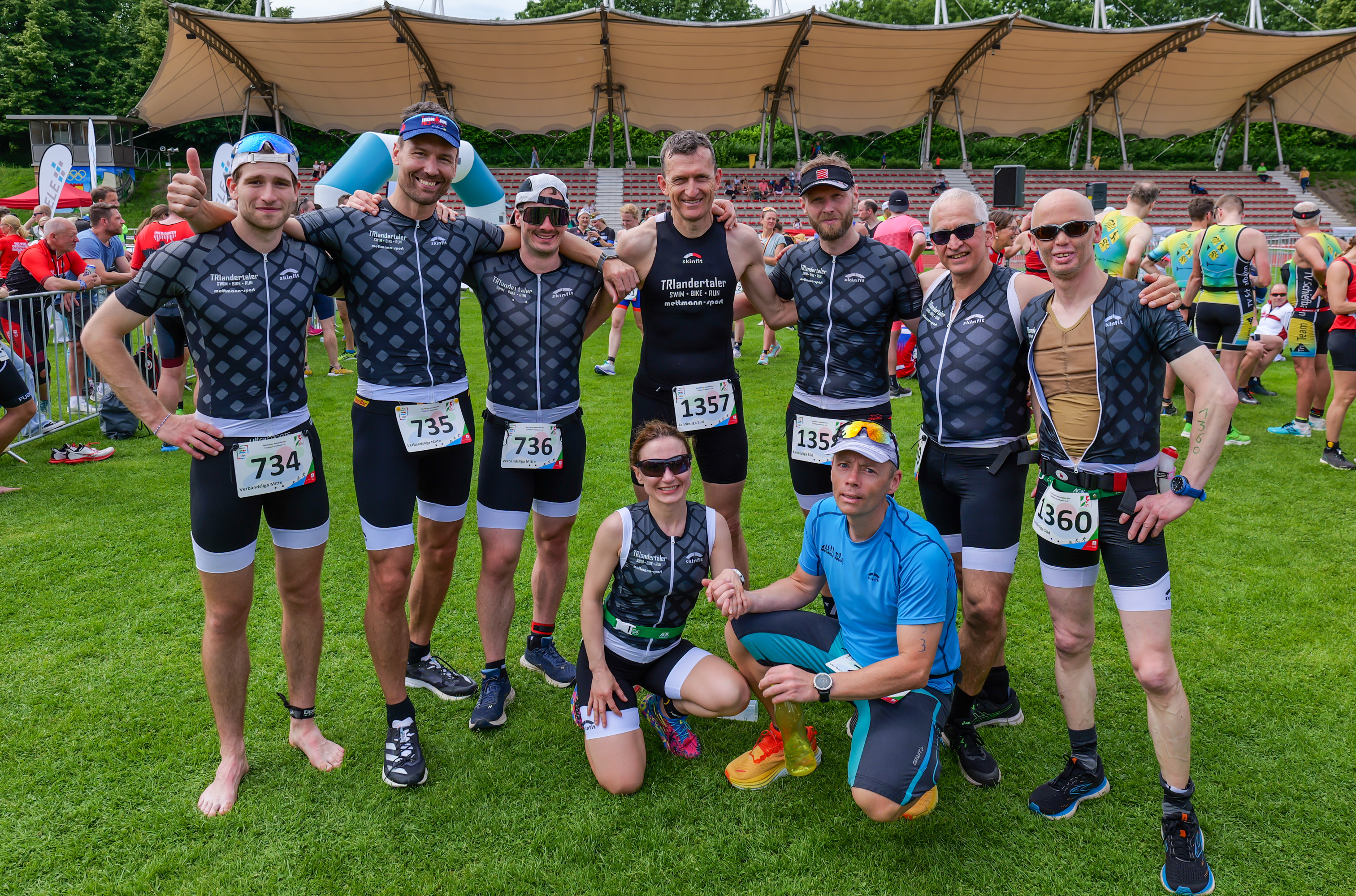 Gruppe von acht Triathleten in Sportoutfits, auf einer Wiese in Sportarena, vor Wettkampfbeginn.