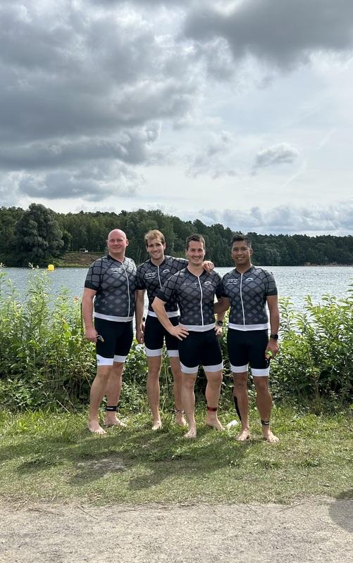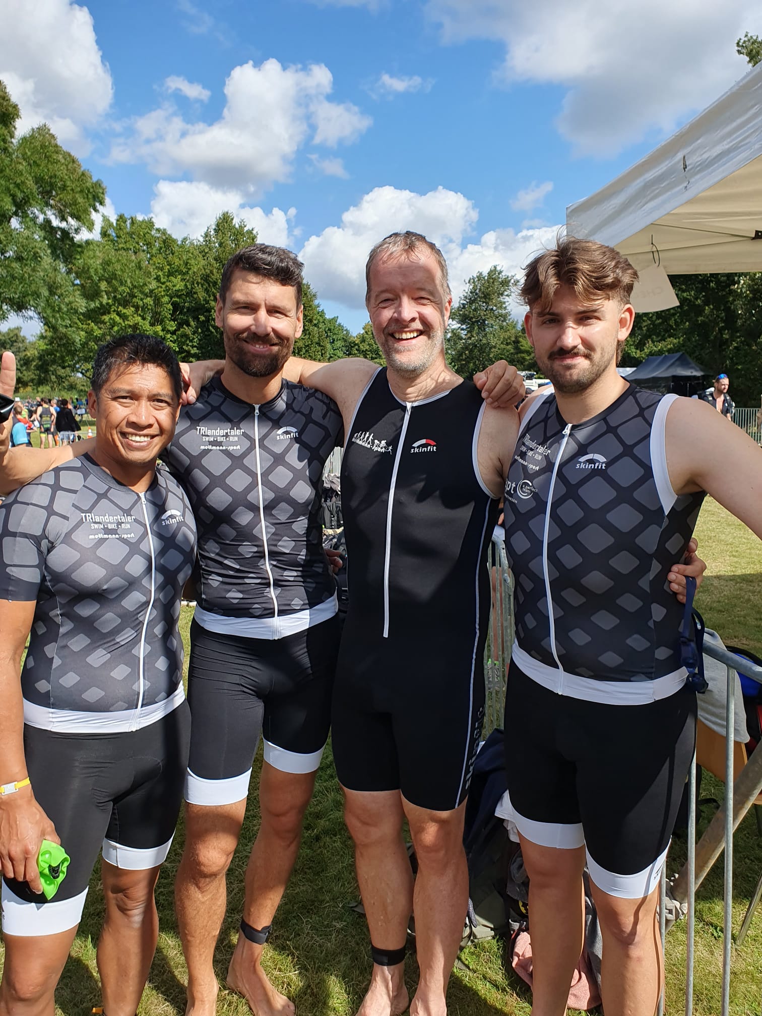 Vier Sportler in enger Triathlonbekleidung posieren im Freien, umgeben von Grünflächen und einem blauen Himmel.