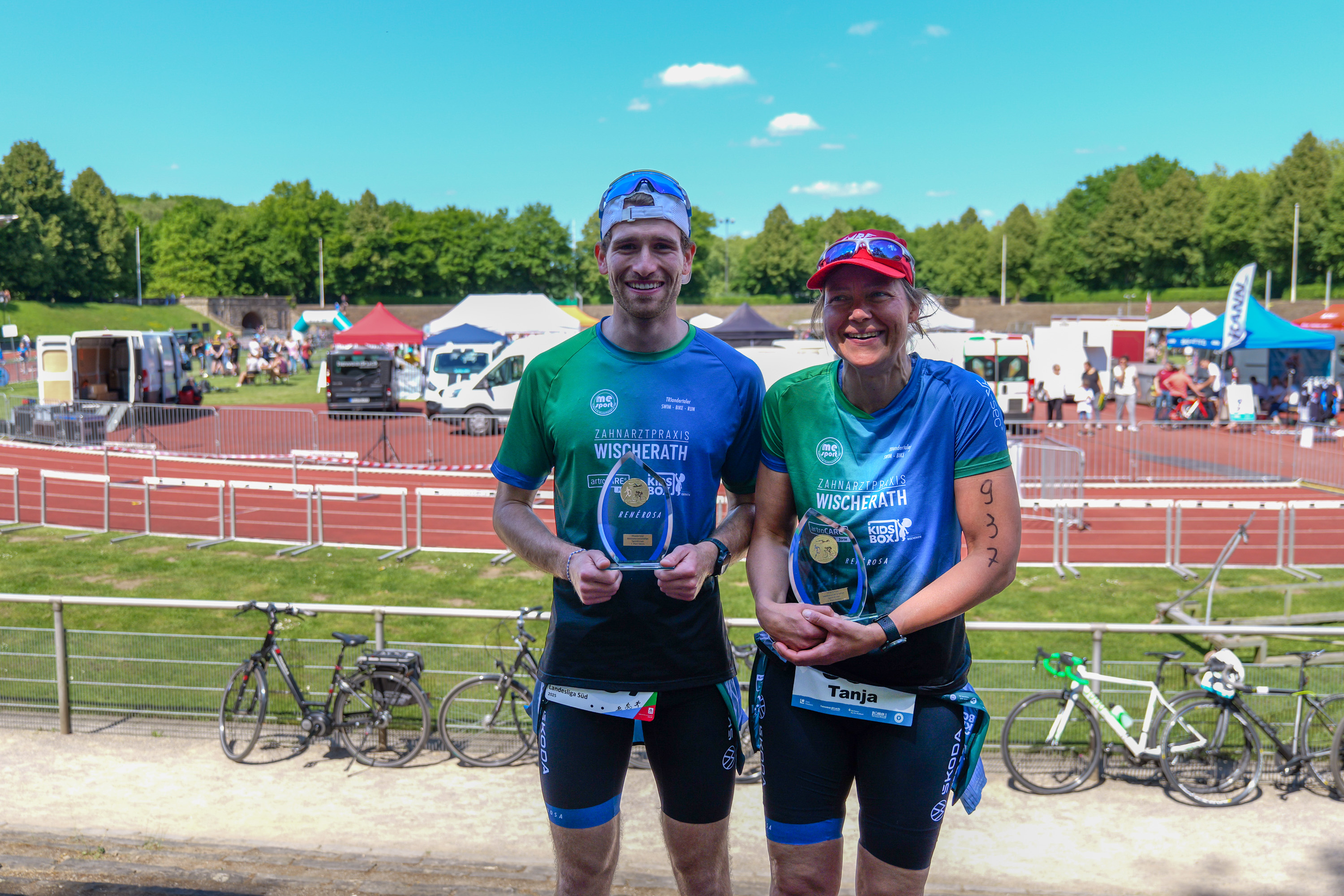 Zwei Athleten mit Medaillen stehen lächelnd auf einer Sportveranstaltung, mit Zuschauerbereichen und Radfahrern im Hintergrund.