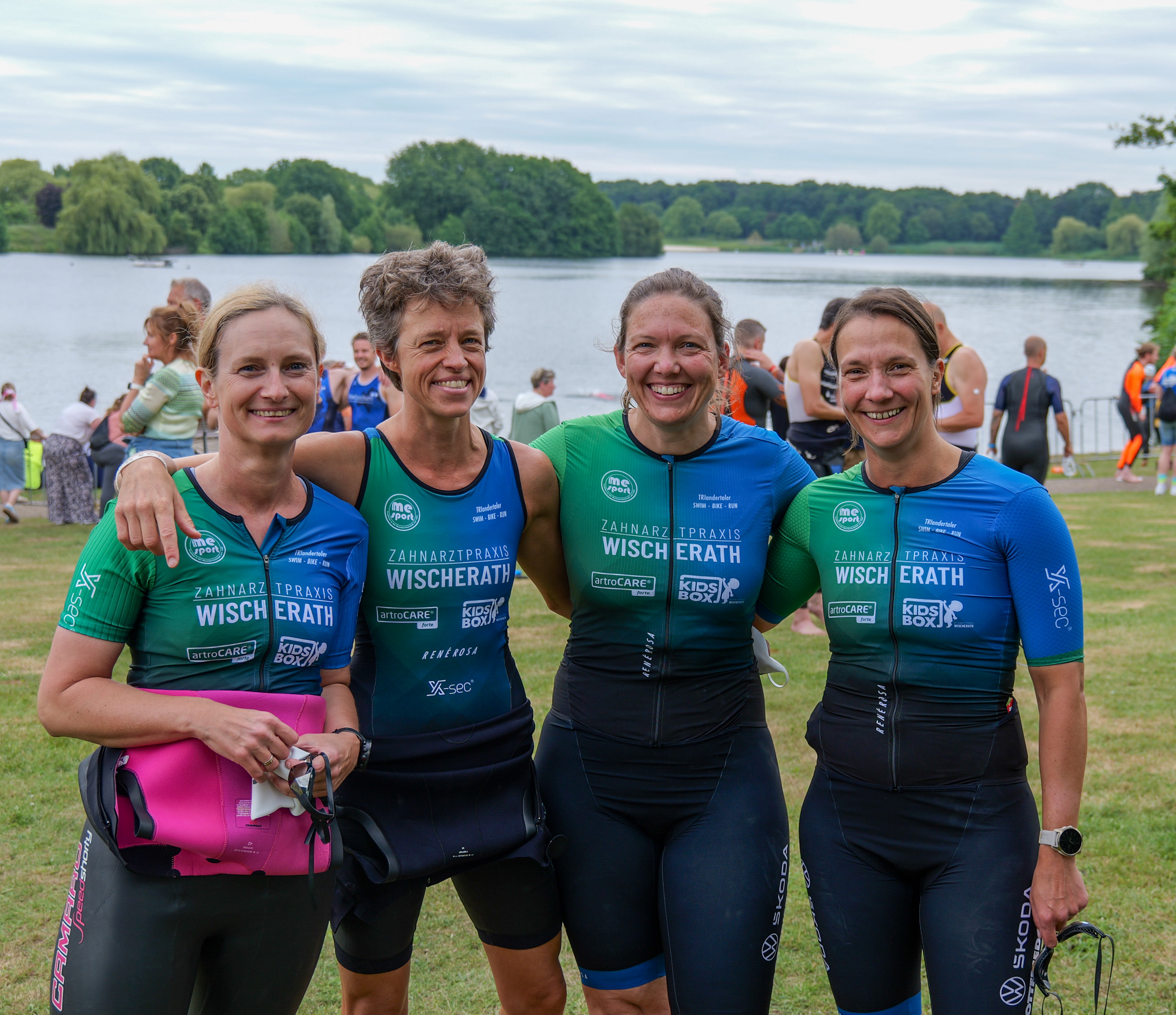 Vier Frauen in Sportanzügen lächeln am Ufer eines Sees, im Hintergrund eine Gruppe von Zuschauern und Teilnehmern.