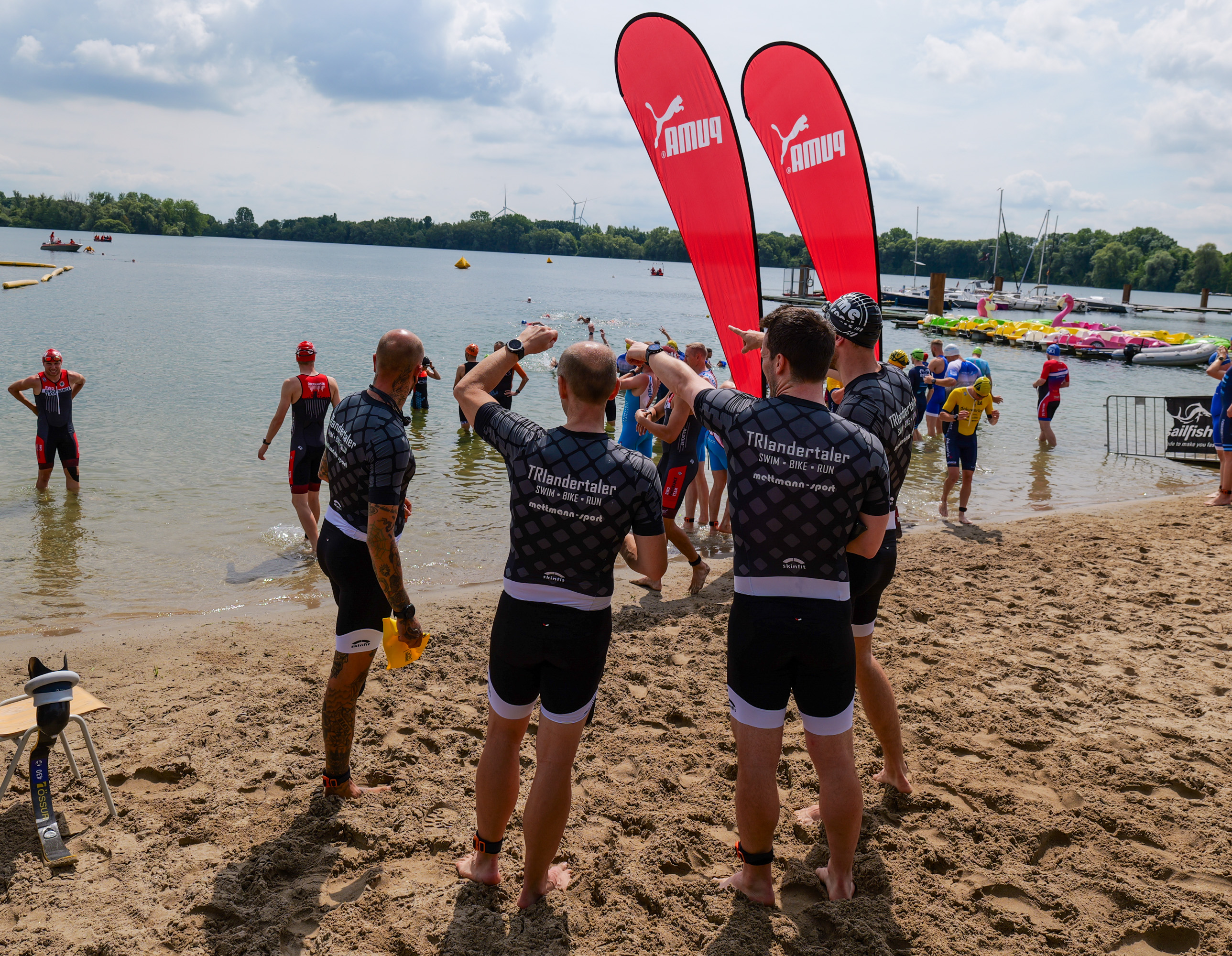 Gruppierung von Schwimmern in Wettkampfanzügen am Sandstrand eines Sees, umgeben von Booten und Flaggen.