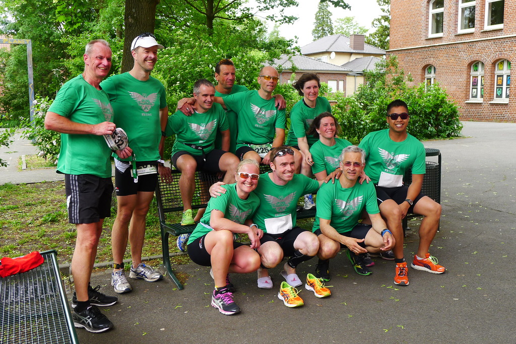 Gruppenshot von 12 Sportlern in Sportkleidung, sitzend und stehend auf einer Wiese vor einem Sportplatz.