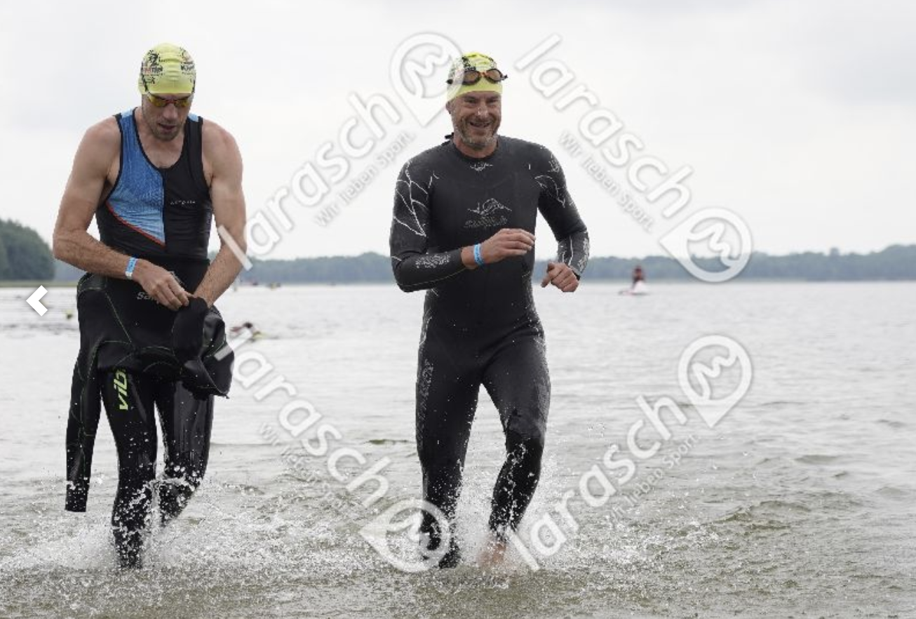 Zwei Schwimmer laufen im Wasser, der eine zieht seinen Neoprenanzug aus, während der andere lächelt.