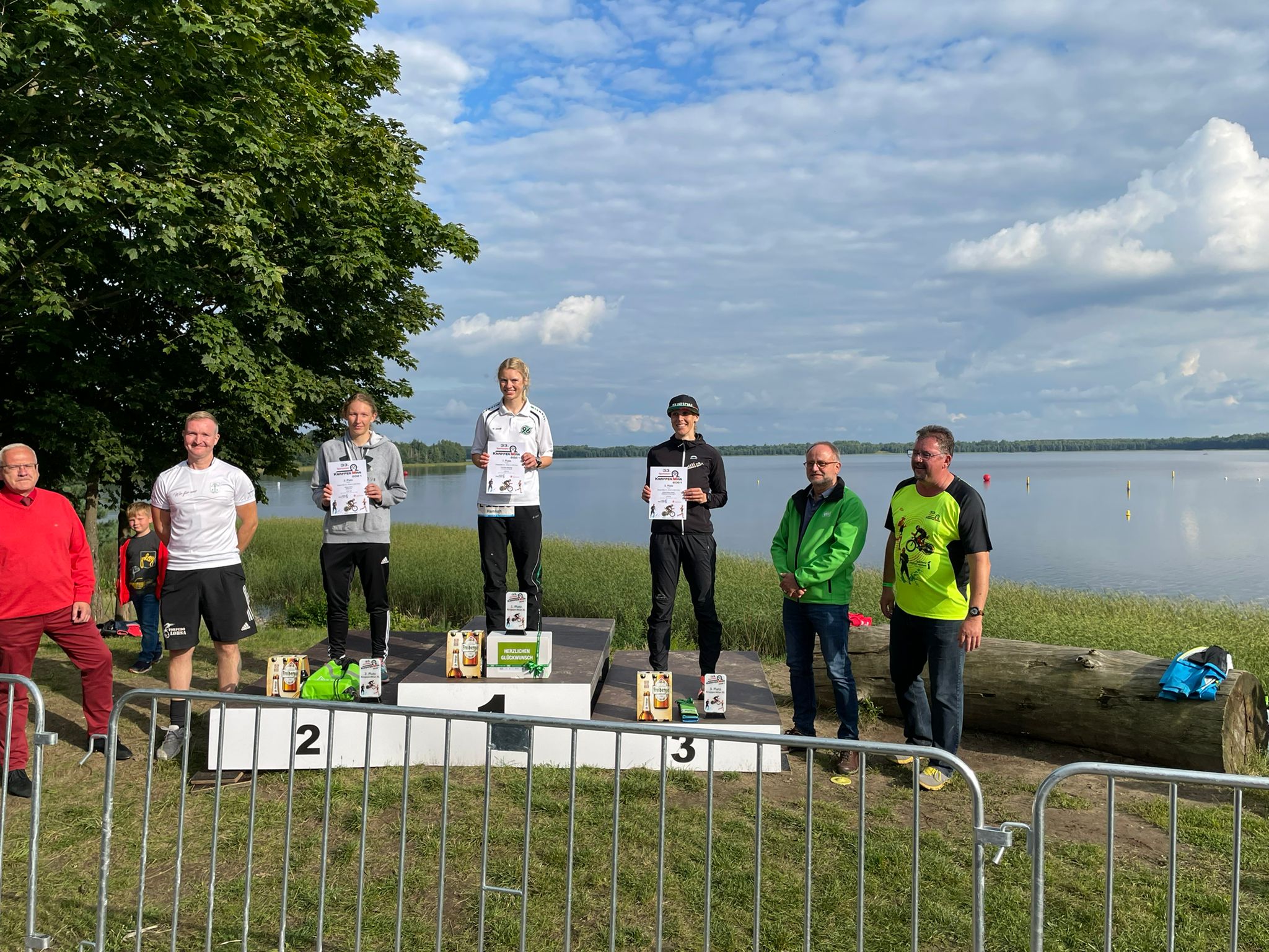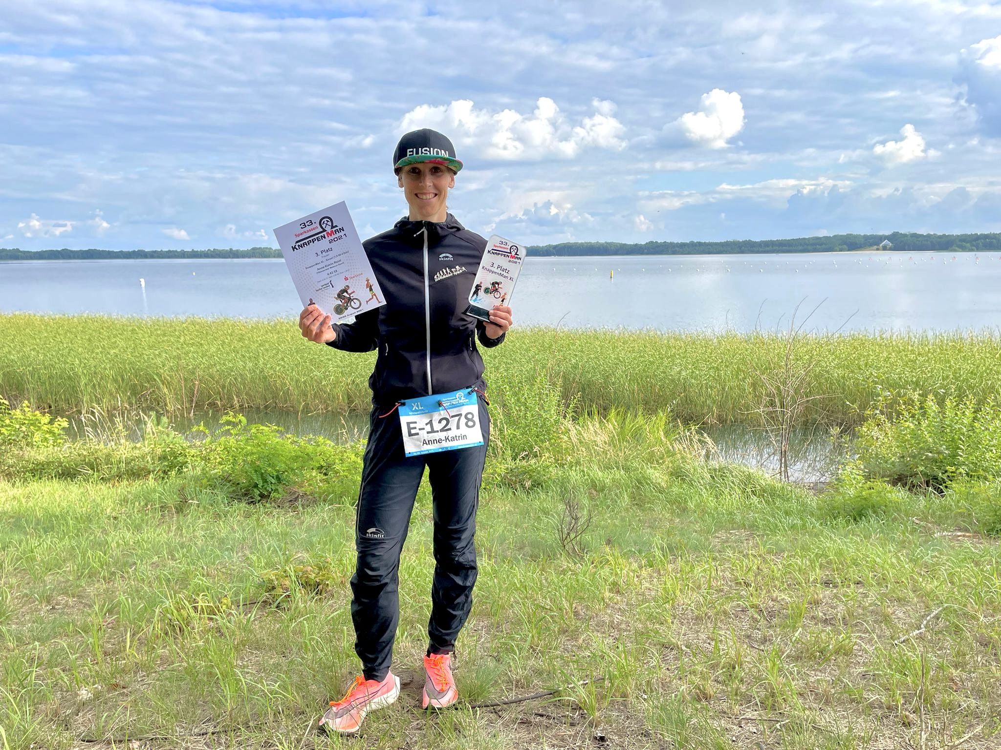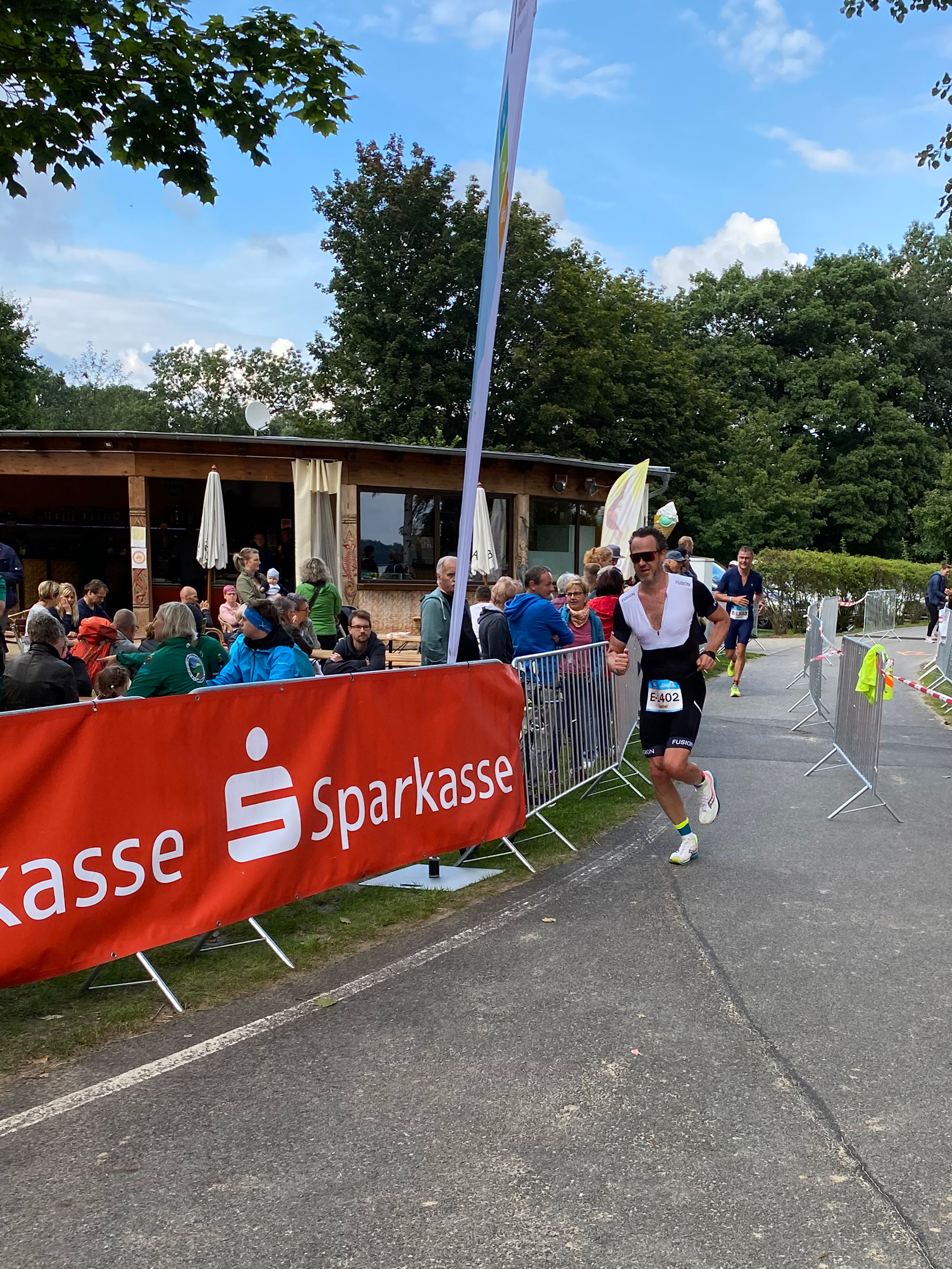 Mann in Sportbekleidung steht neben einem Werbebanner für den KnappenMan Triathlon am Dreiweibernsee.