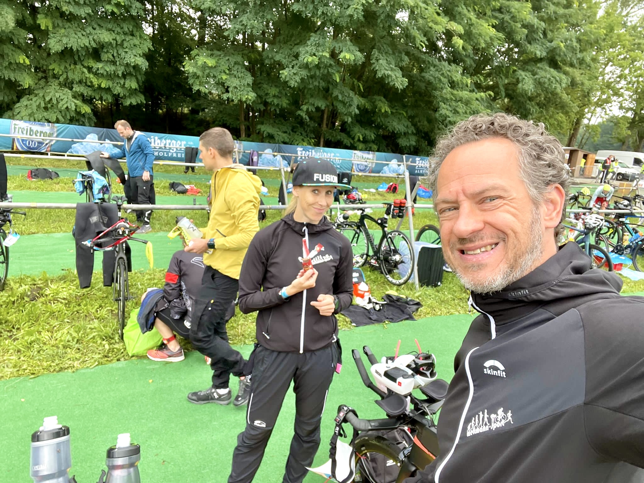 Selbstporträt einer Gruppe von Triathleten in einem Vorbereitungsbereich mit Fahrrädern und Ausrüstung.