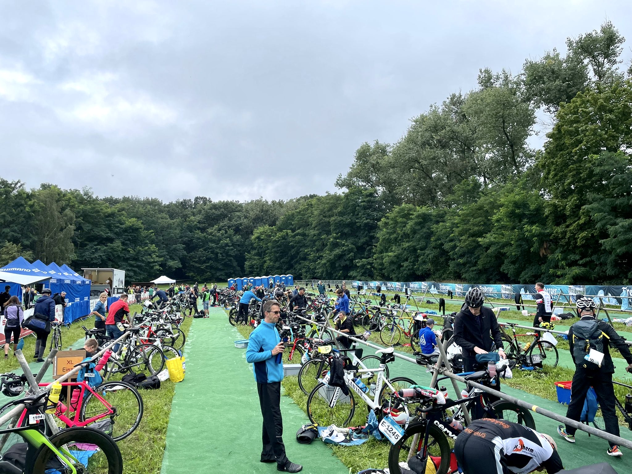 Triage-Zone mit vielen Rennrädern und Teilnehmern auf einem grünen Teppich in einem Park bei bewölktem Wetter.