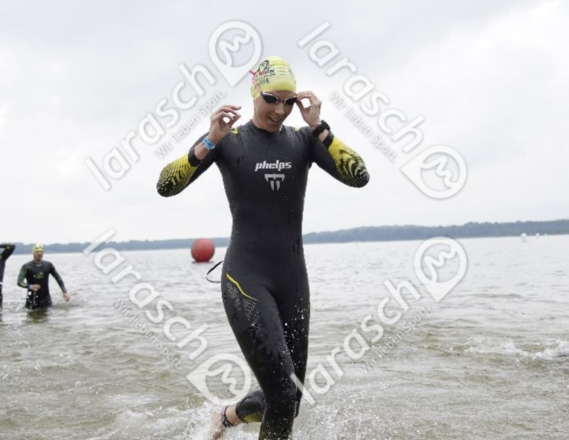 Schwimmer in schwarzem Neoprenanzug und Badekappe verlässt eine Gewässeroberfläche, im Hintergrund weitere Schwimmer.