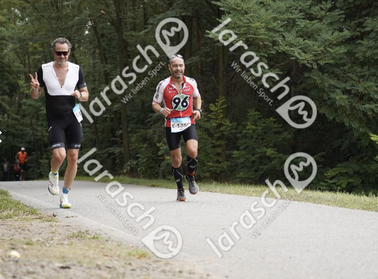 Zwei Männer joggen auf einem Waldweg, einer im schwarzen, der andere im roten Trikot, umgeben von Bäumen.