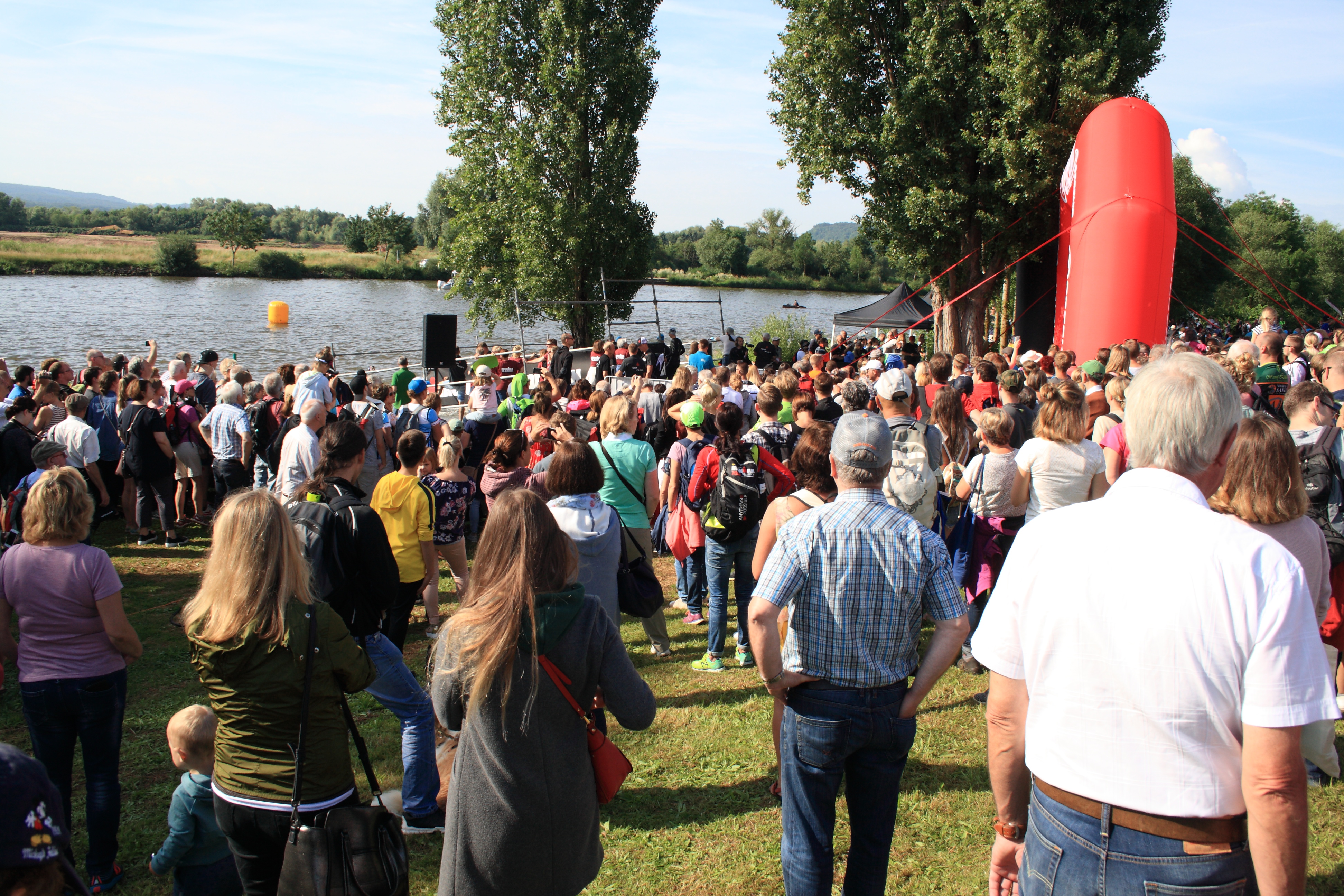 Große Menschenmenge am Ufer eines Flusses, Zuschauer beobachten ein Event mit roten und gelben Markierungen im Hintergrund.
