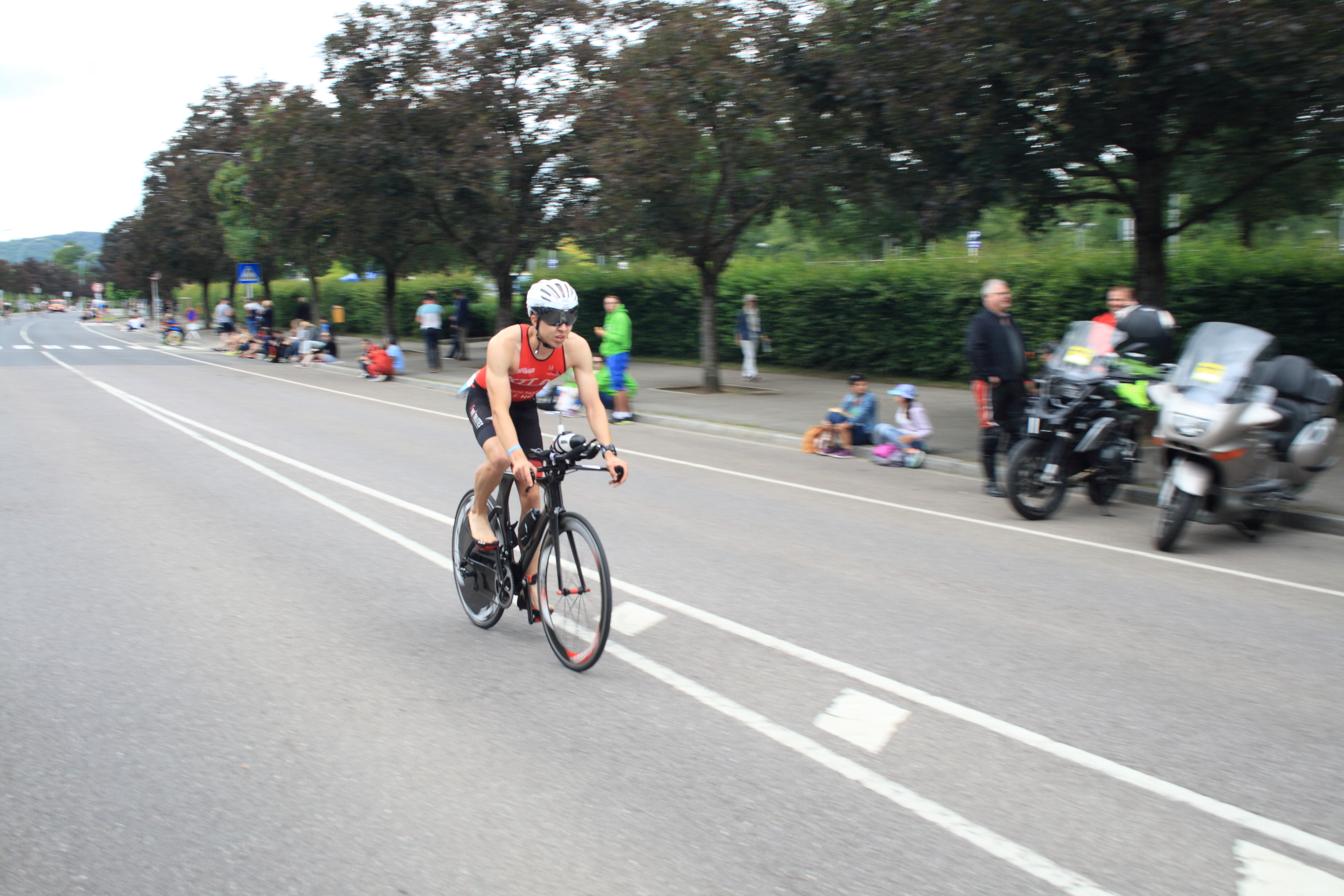 Triathlet in Sportkleidung fährt auf einem Rennrad eine Straße entlang, Zuschauer sitzen am Rand.