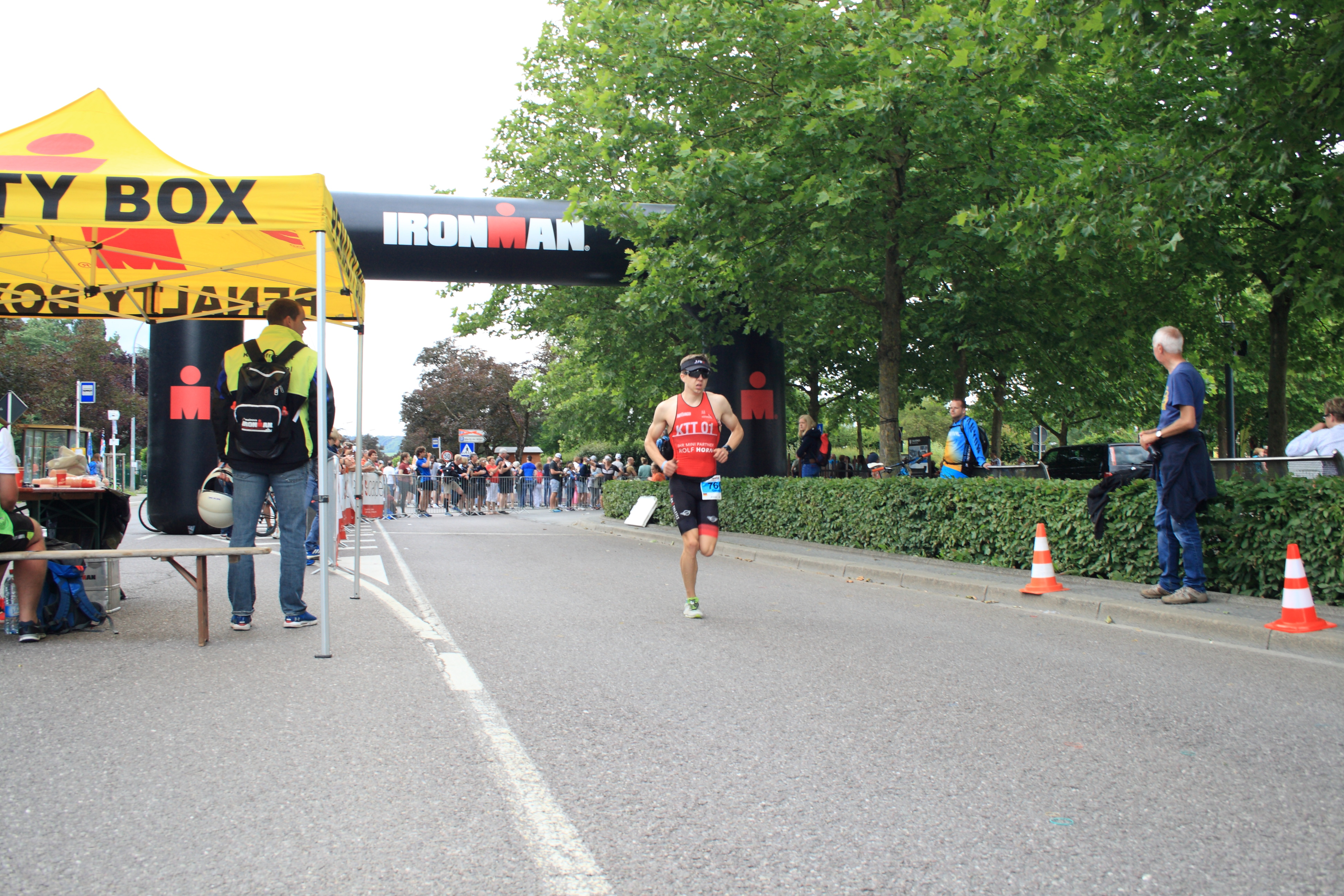 Einathlet läuft bei einem Ironman-Rennen unter einem Banner, umgeben von Zuschauern und Bäumen.