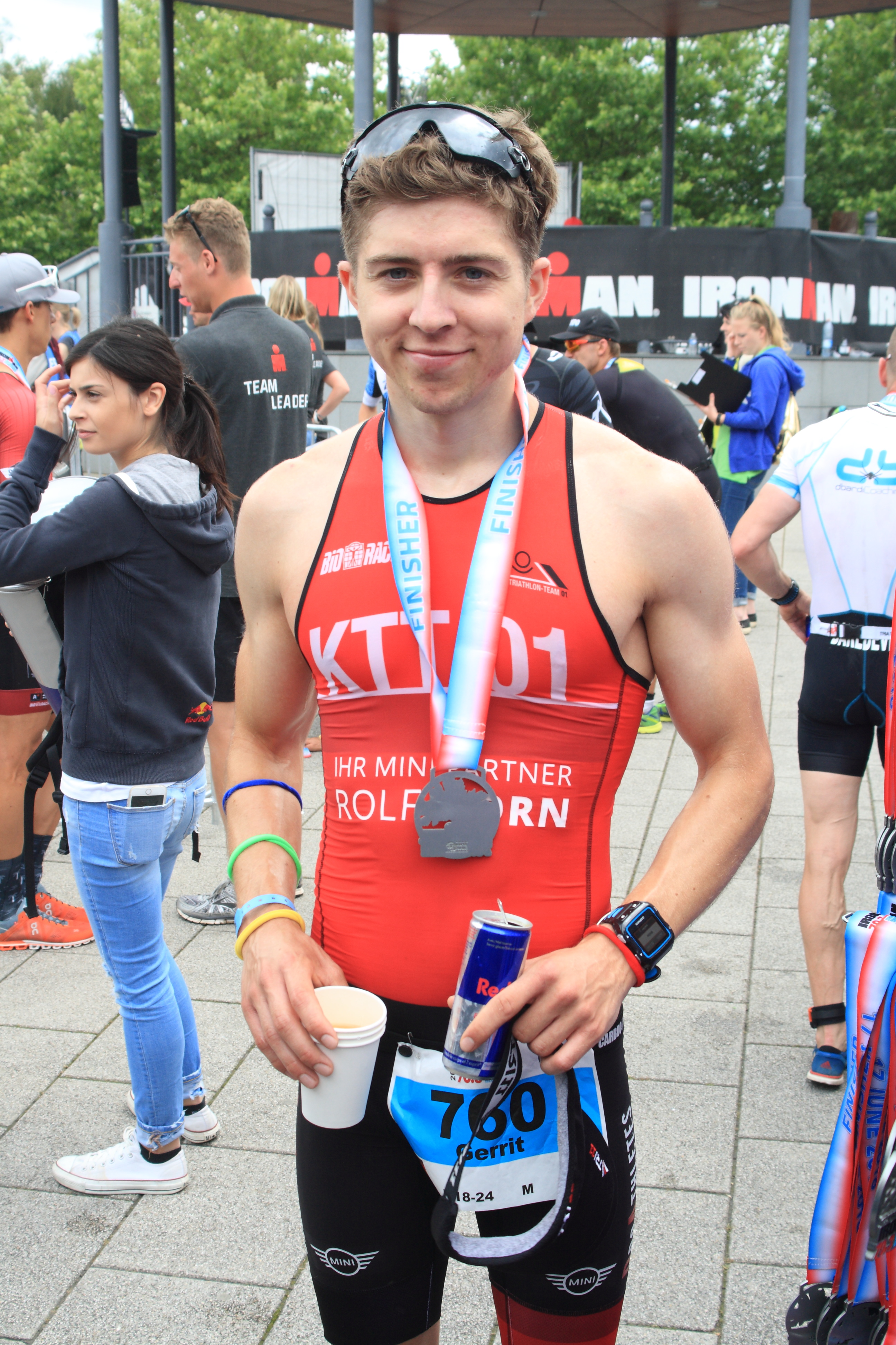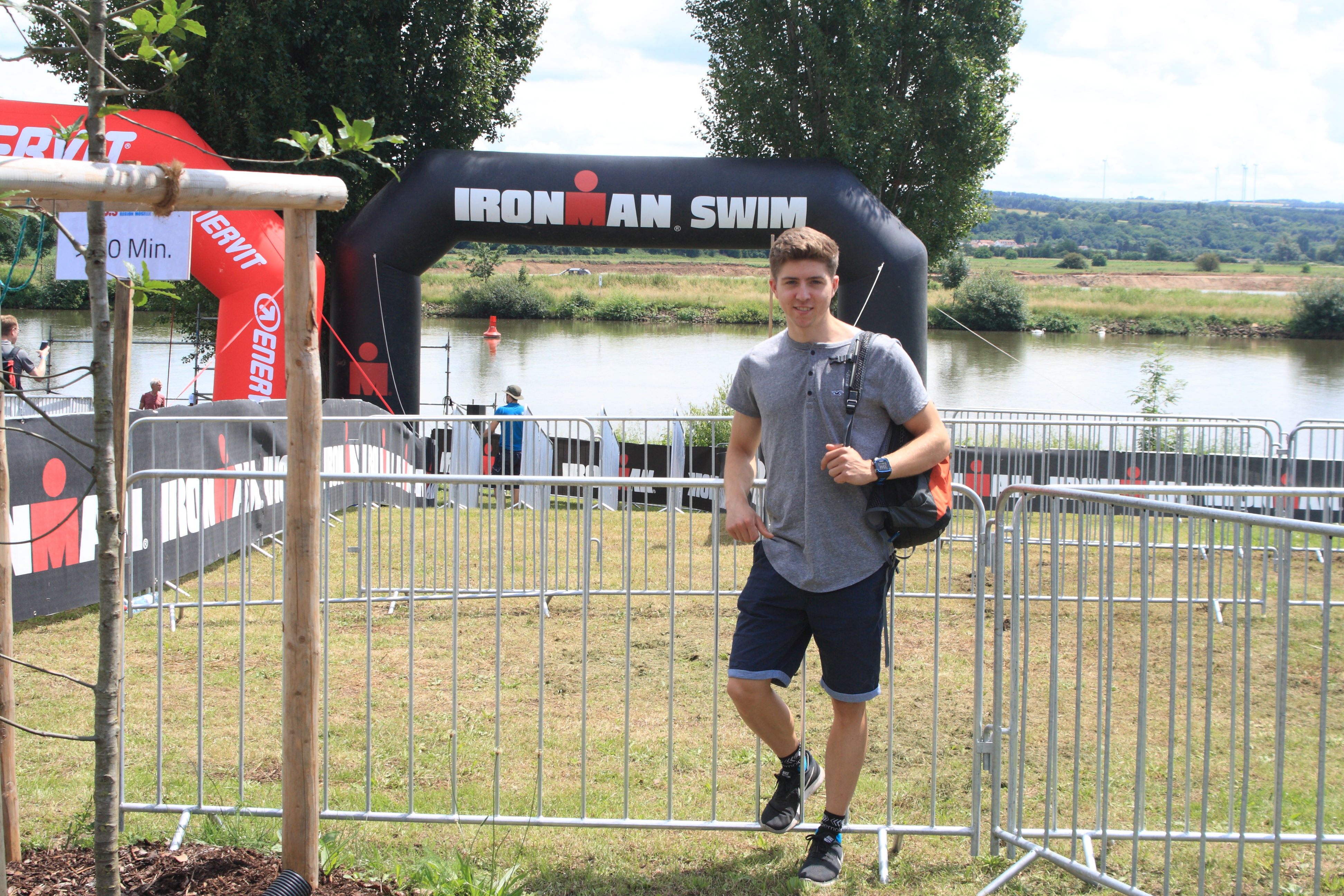 Junger Mann steht vor einem Ironman-Schwimm-Banner, im Hintergrund ist ein Gewässer und Wettkampfbereich sichtbar.