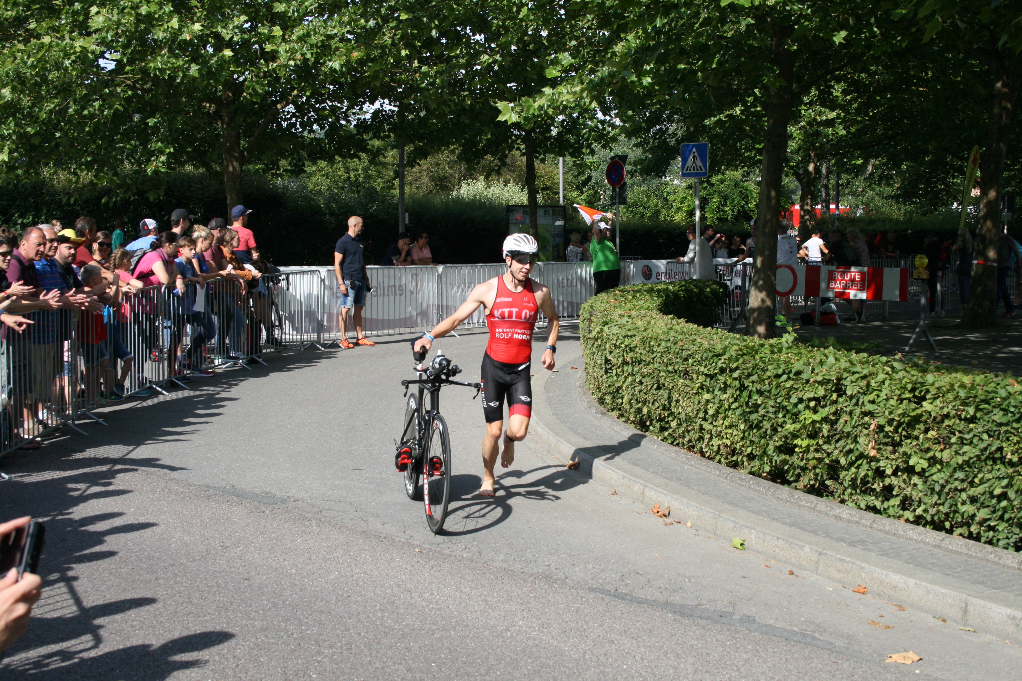 Ein Athlet in rot-schwarzem Trikot schiebt ein Triathlonrad auf einer sonnigen Straße mit Zuschauern im Hintergrund.