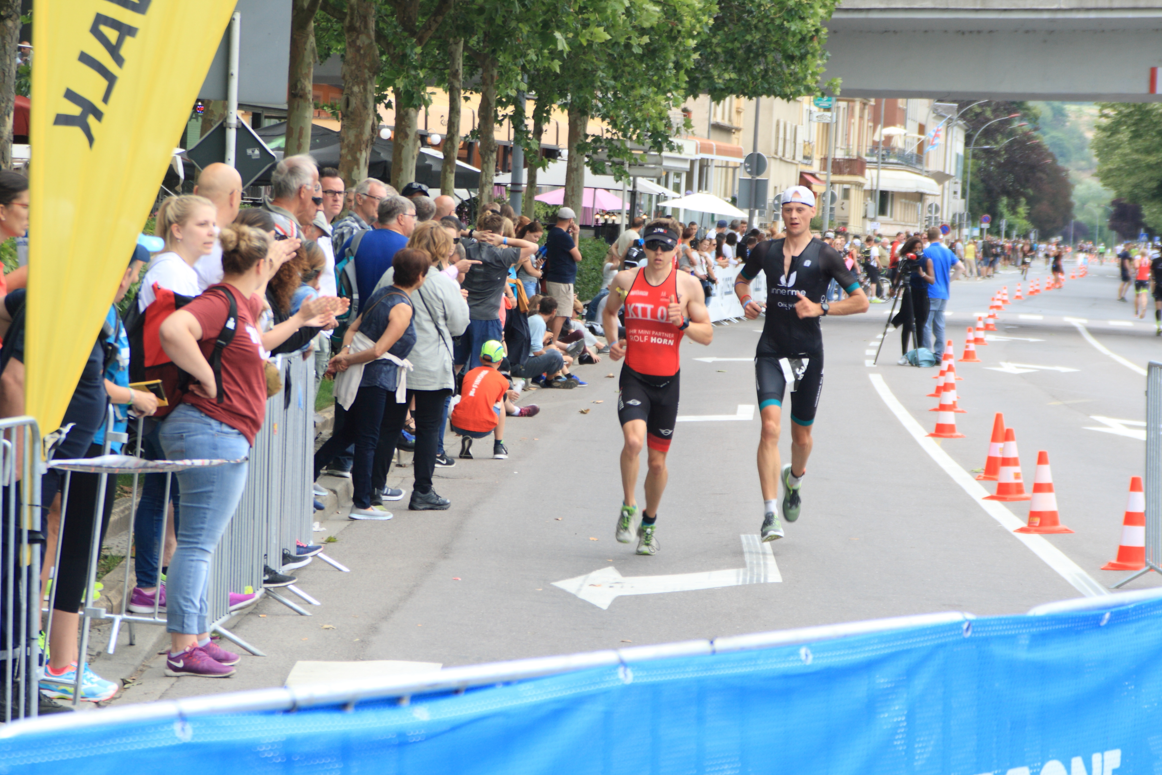 Zwei Athleten in Wettkampfkleidung laufen entlang einer Zuschauerlinie bei einem Triathlon-Event.