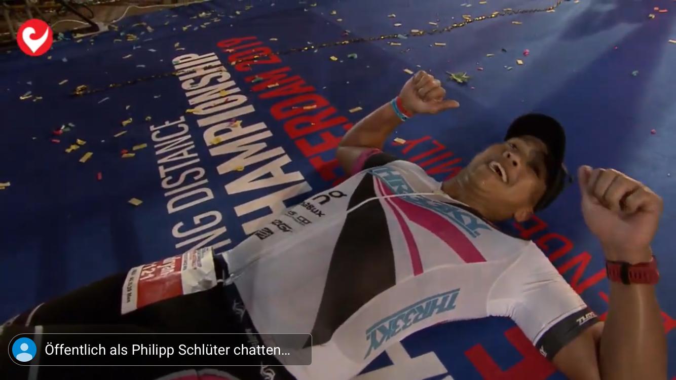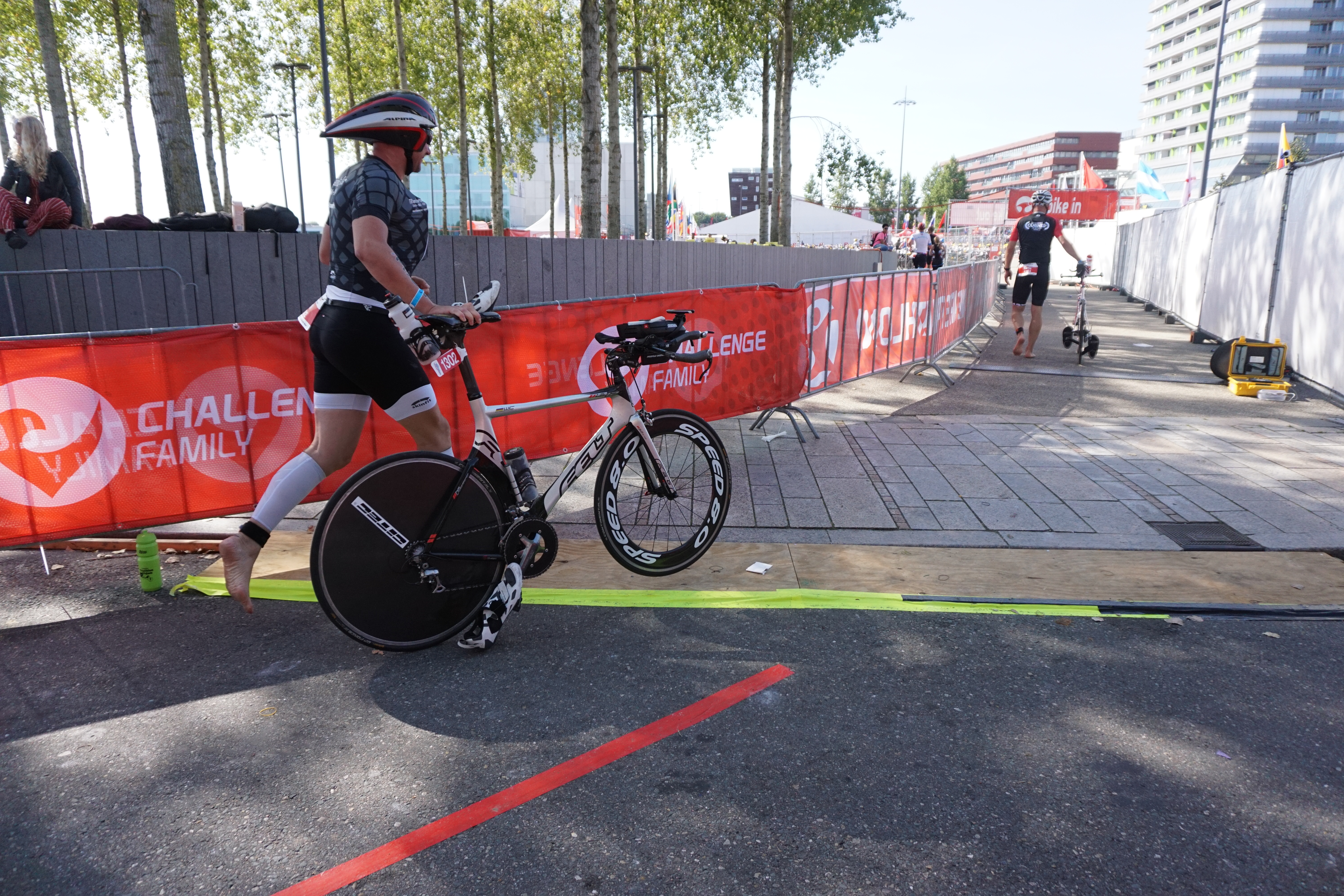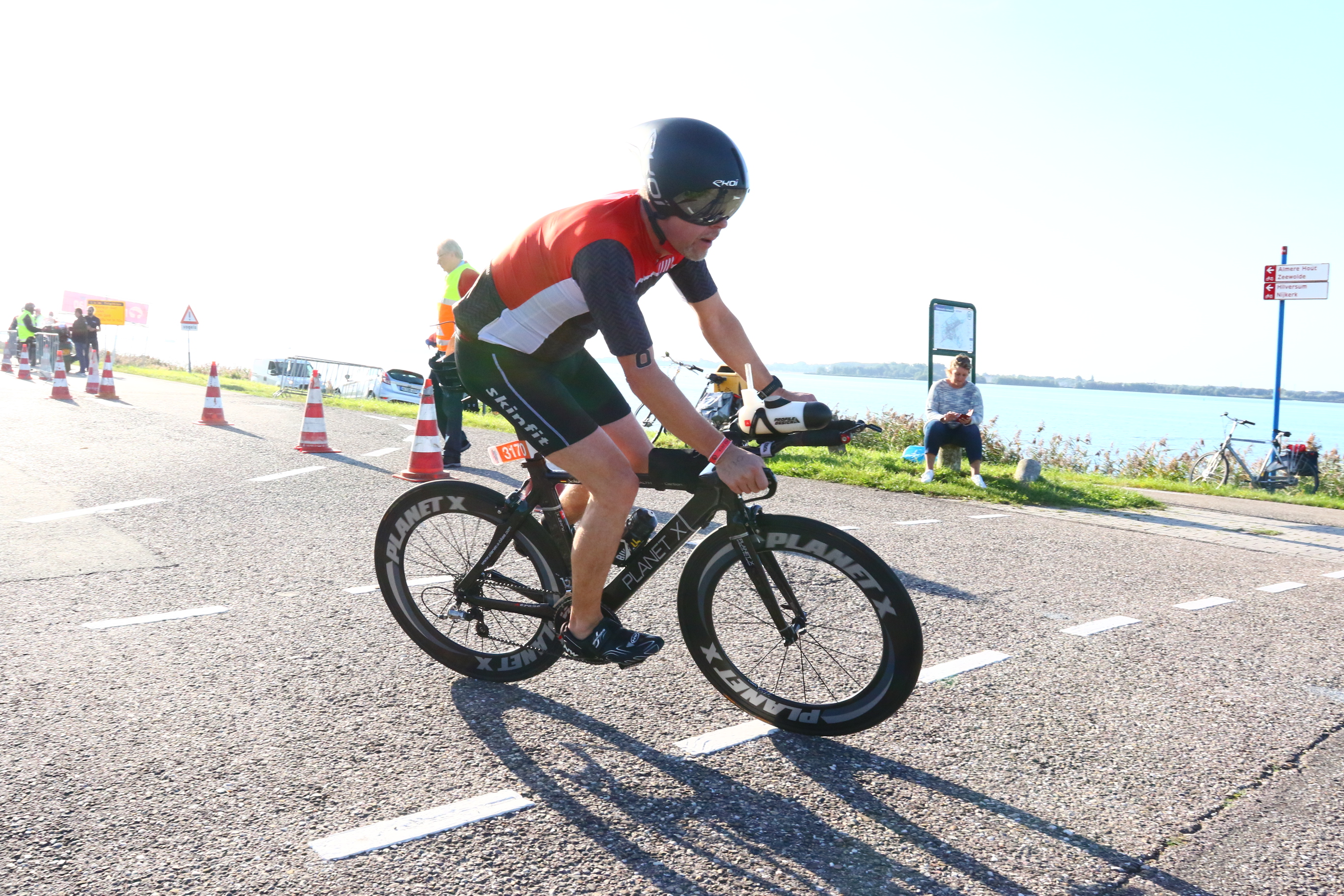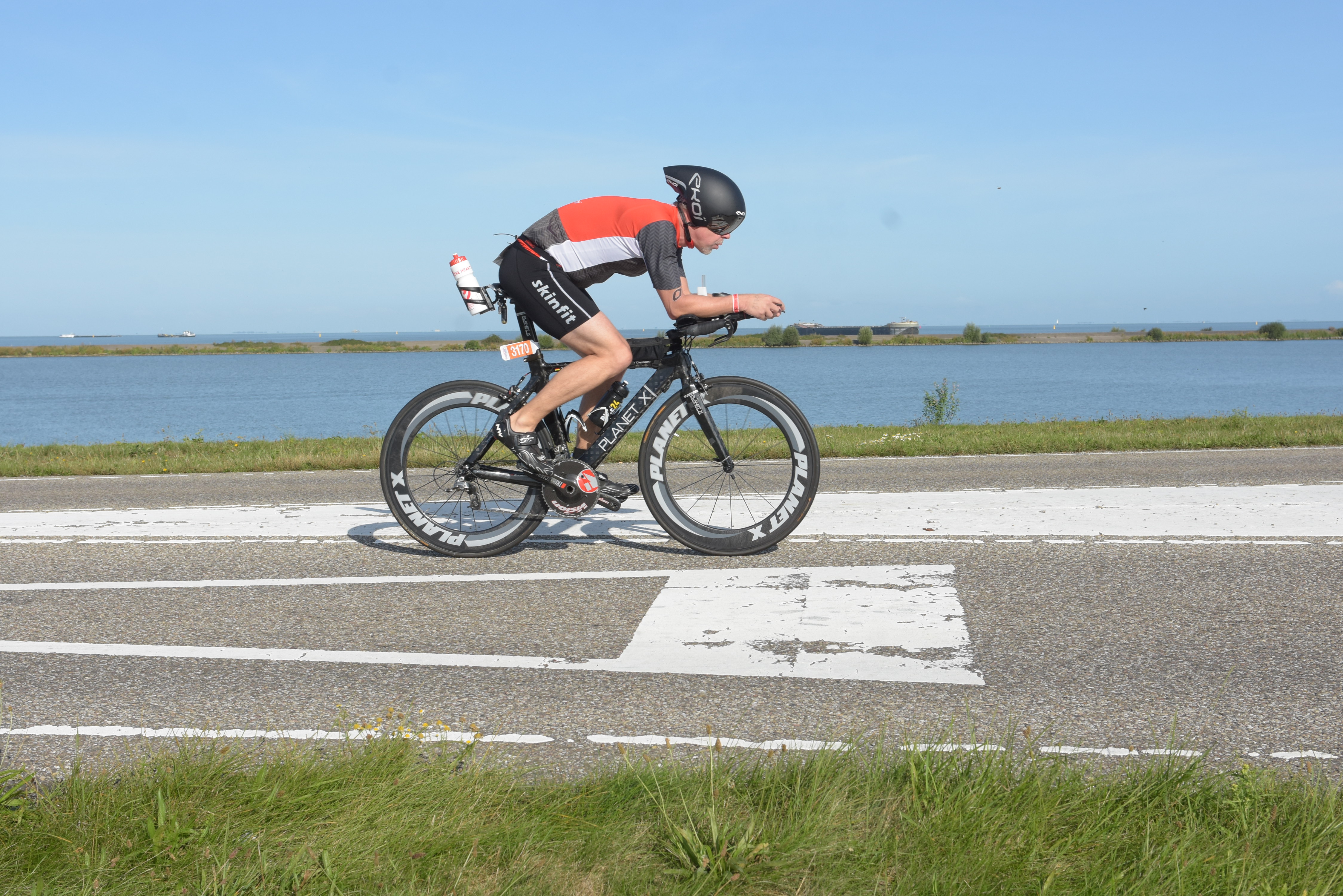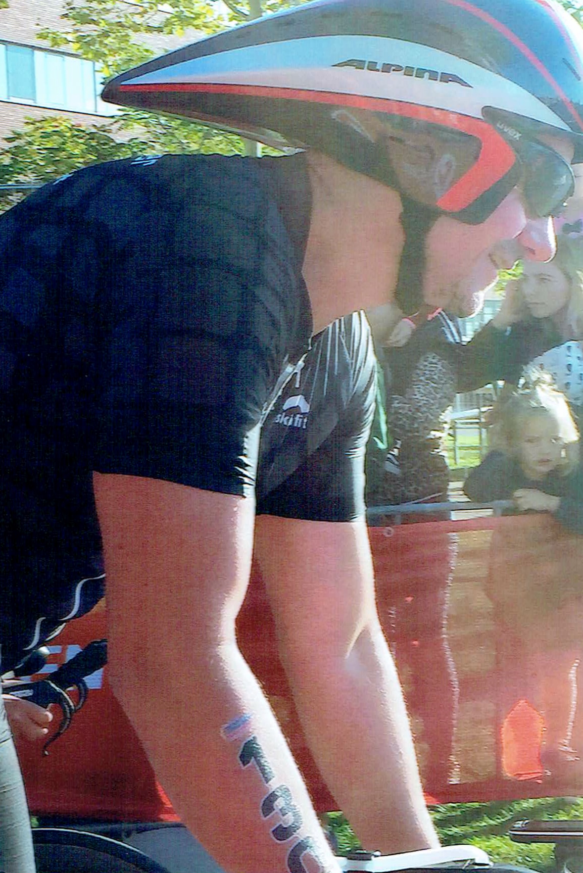 Sportler auf einem Zeitfahrrad in einem Wettkampf, mit einem Wasserbehälter und Zuschauern im Hintergrund.
