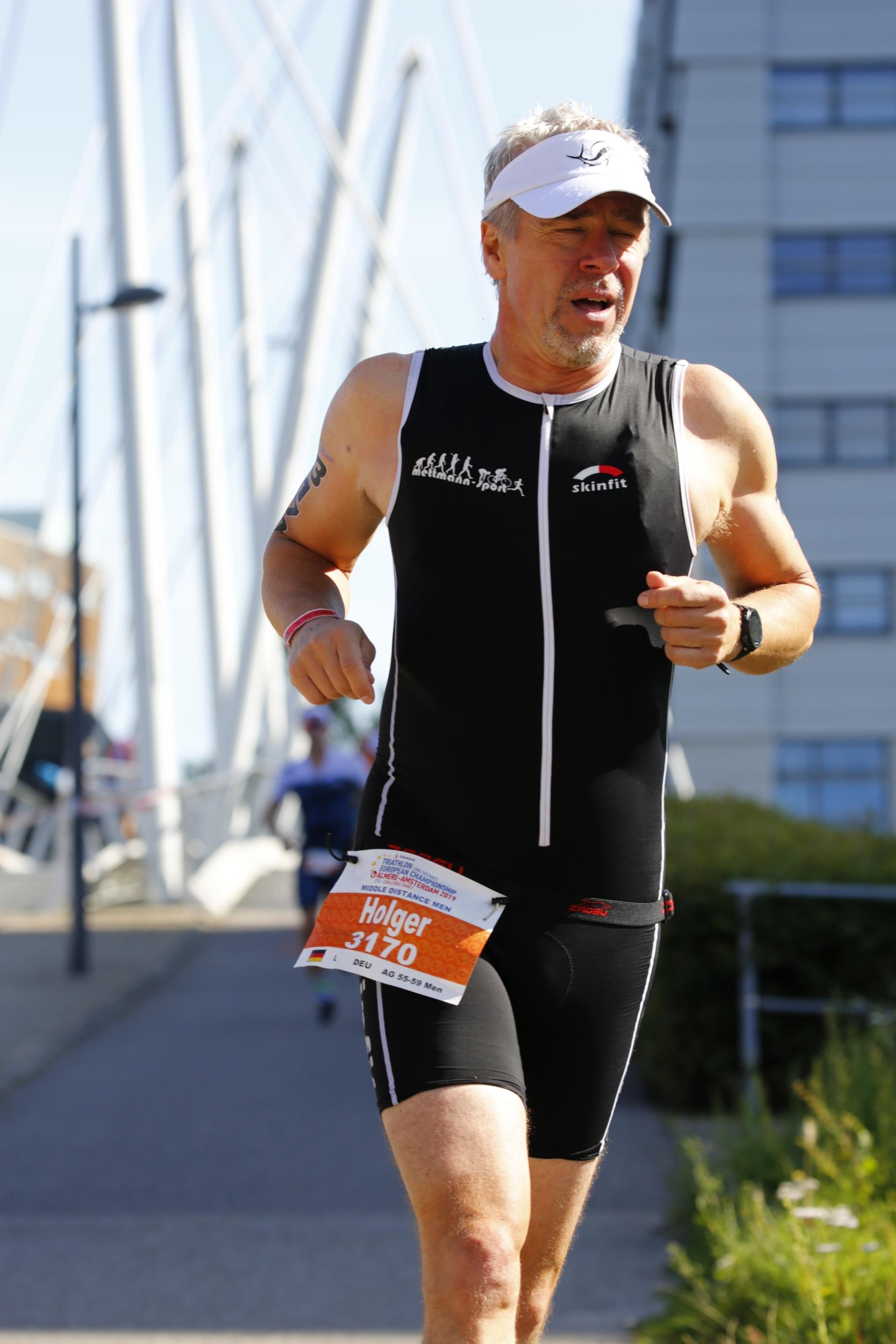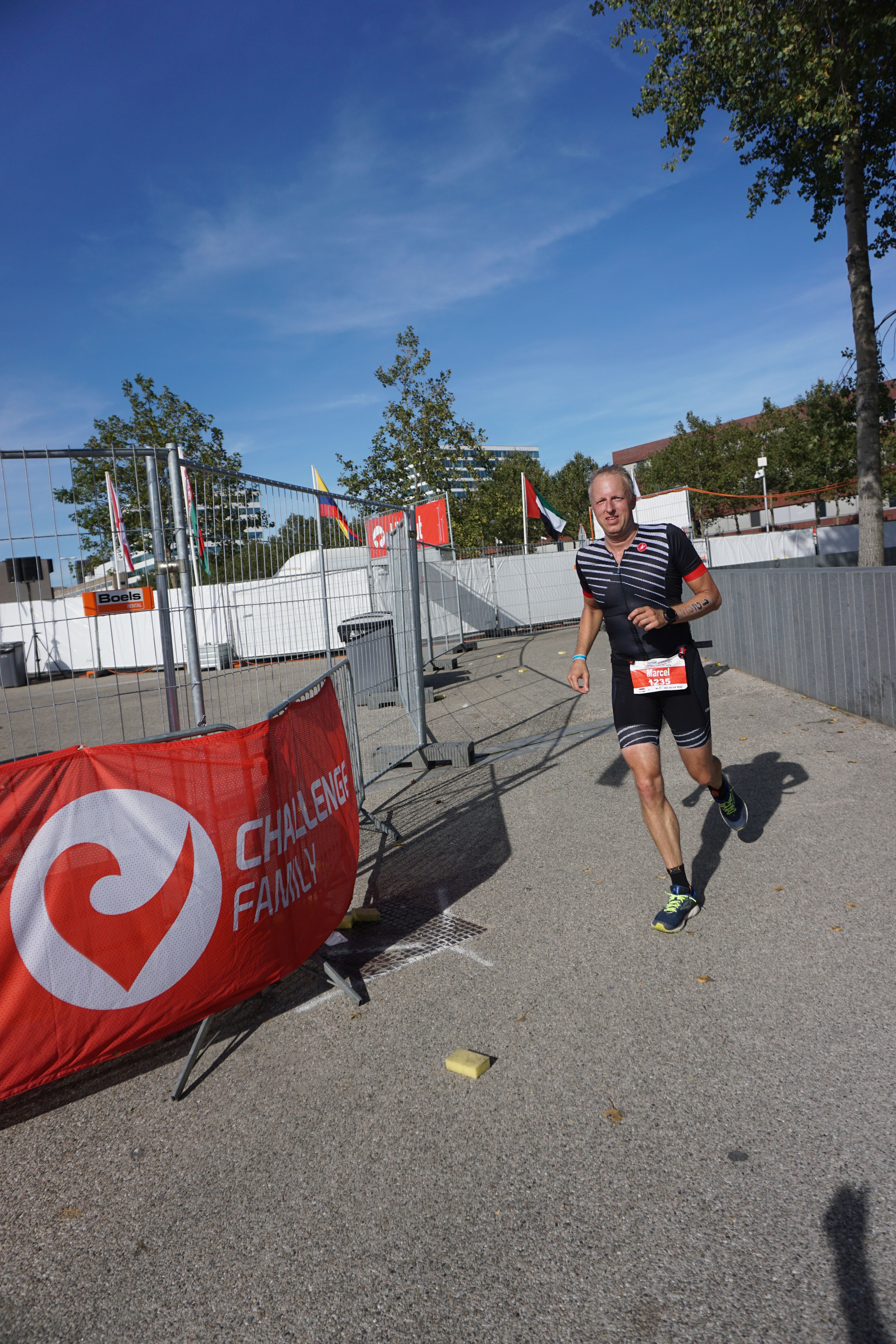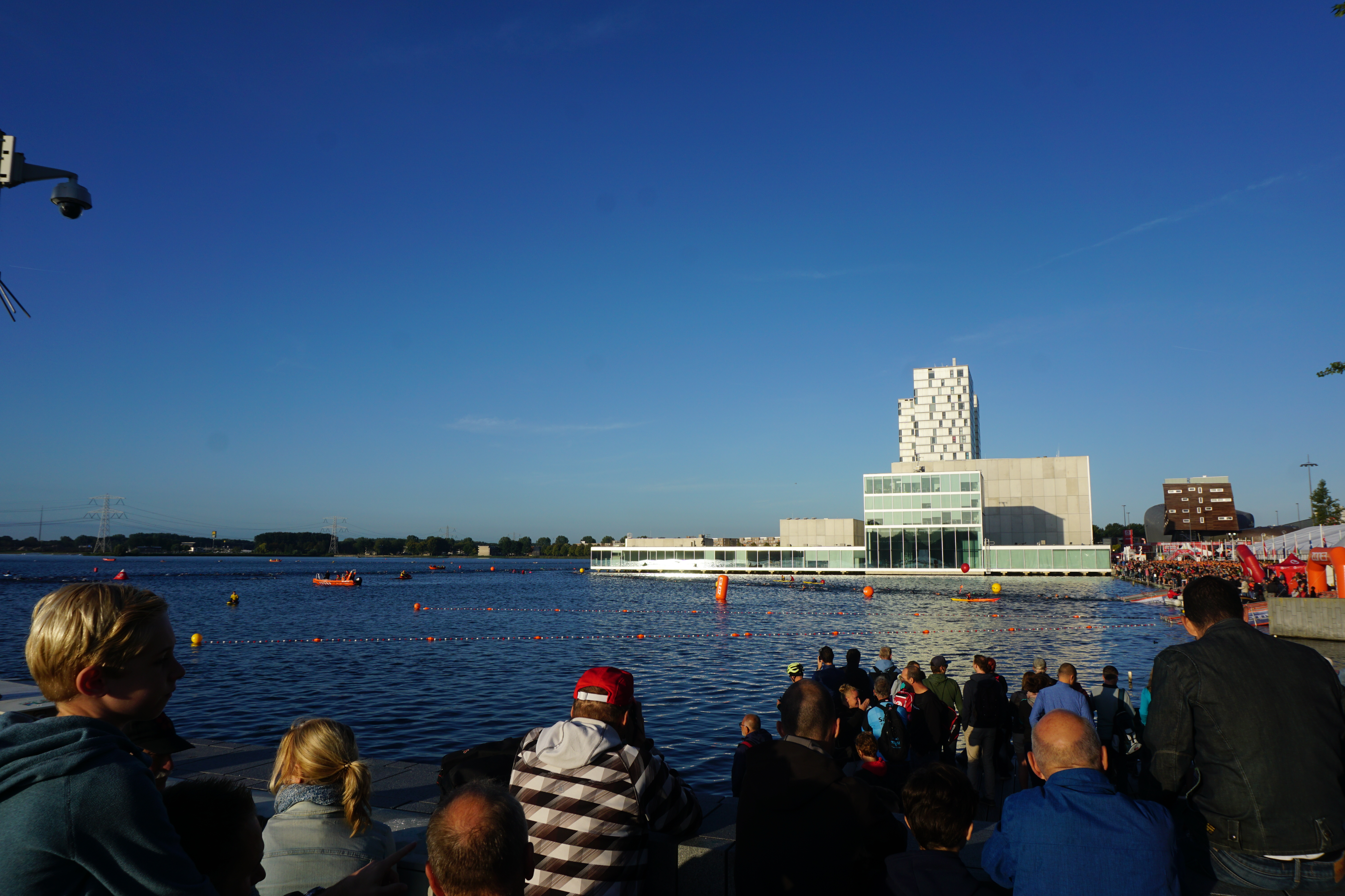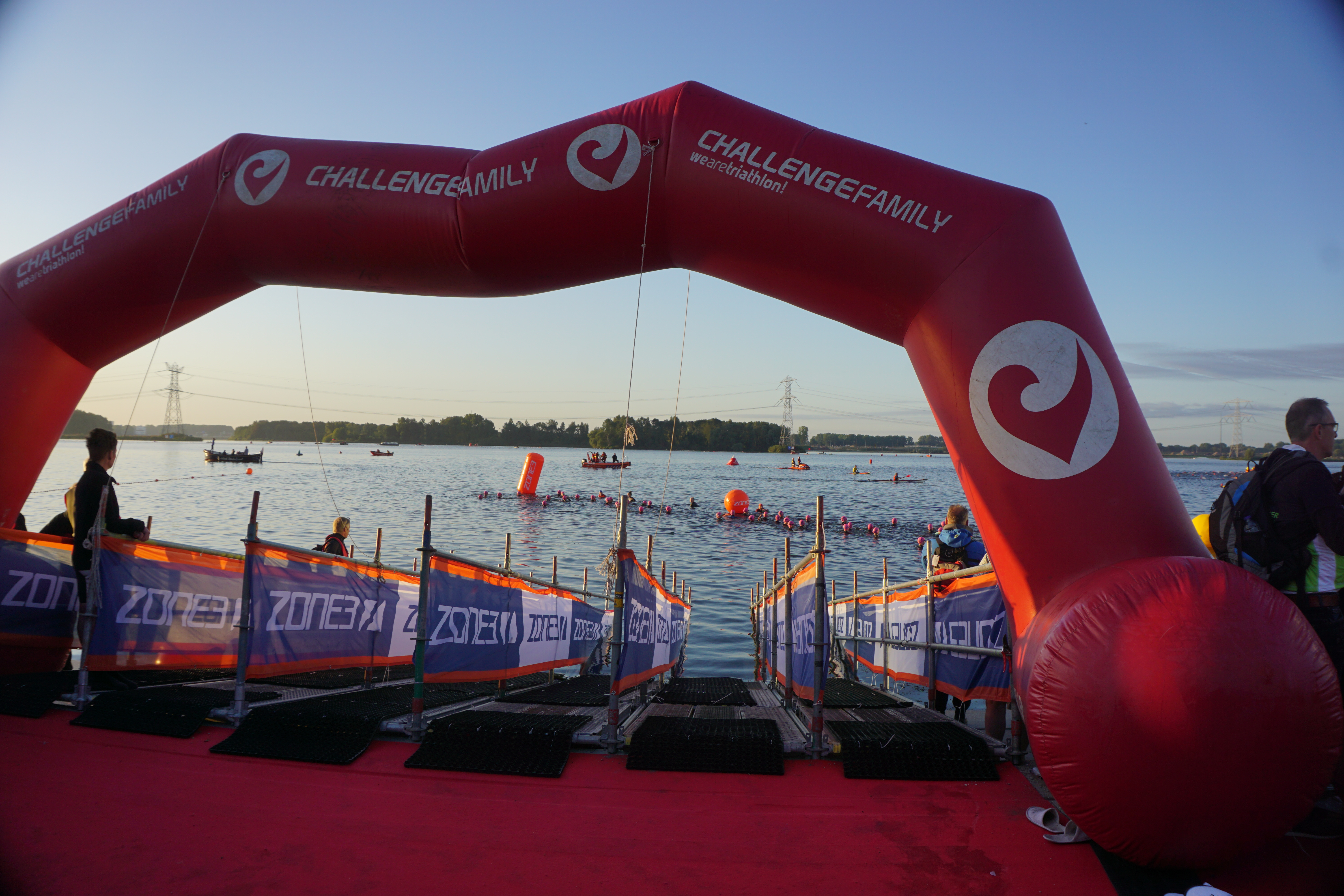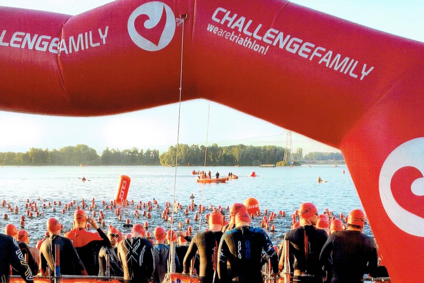 Startbogen des Triathlons über Wasser, mit Teilnehmern in Neoprenanzügen und roten Bojen erkennbar.