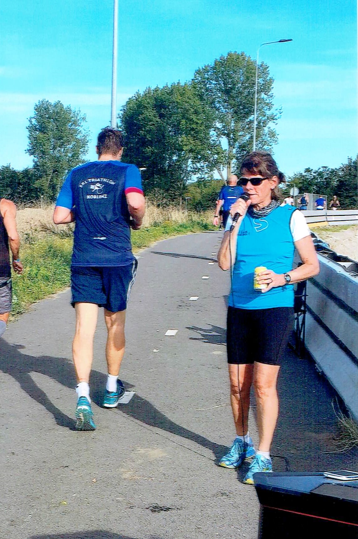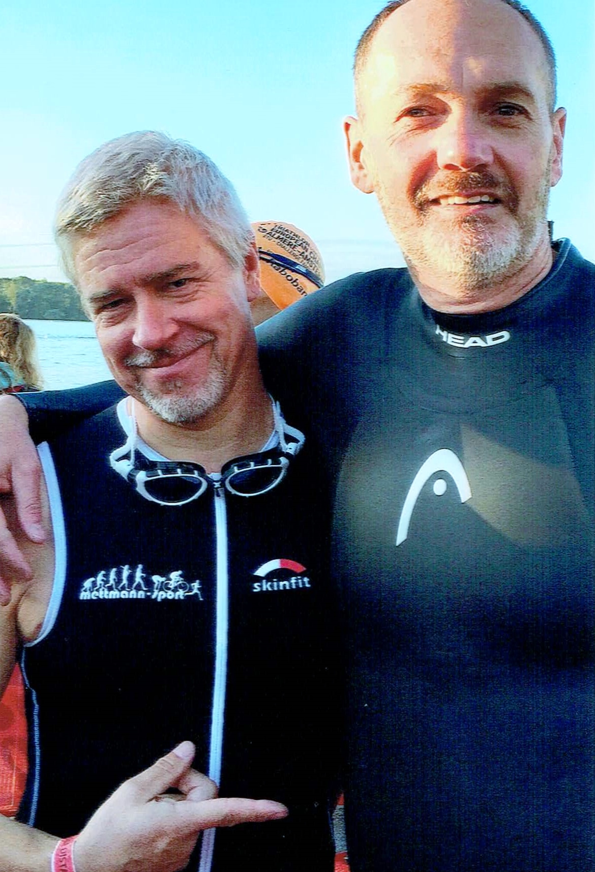 Zwei Männer in Sportanzügen stehen nebeneinander am Seeufer, lächeln und posieren für ein Foto.