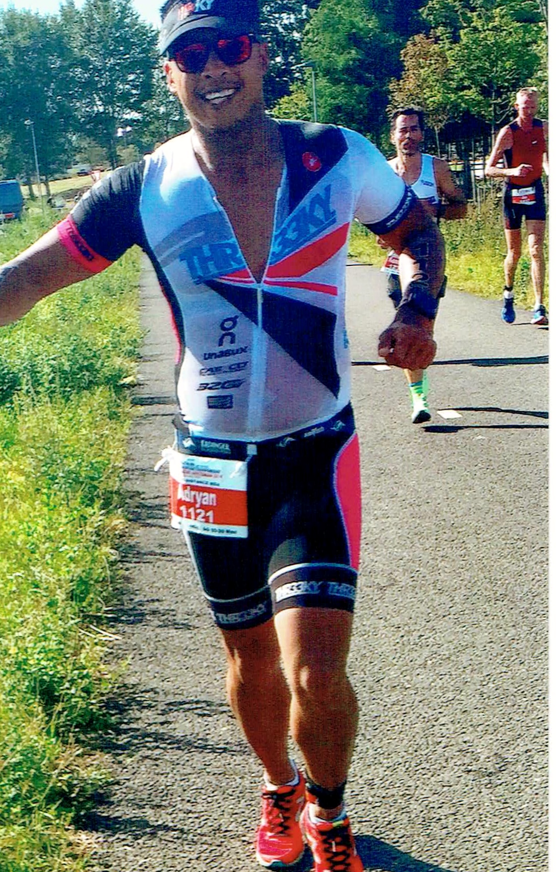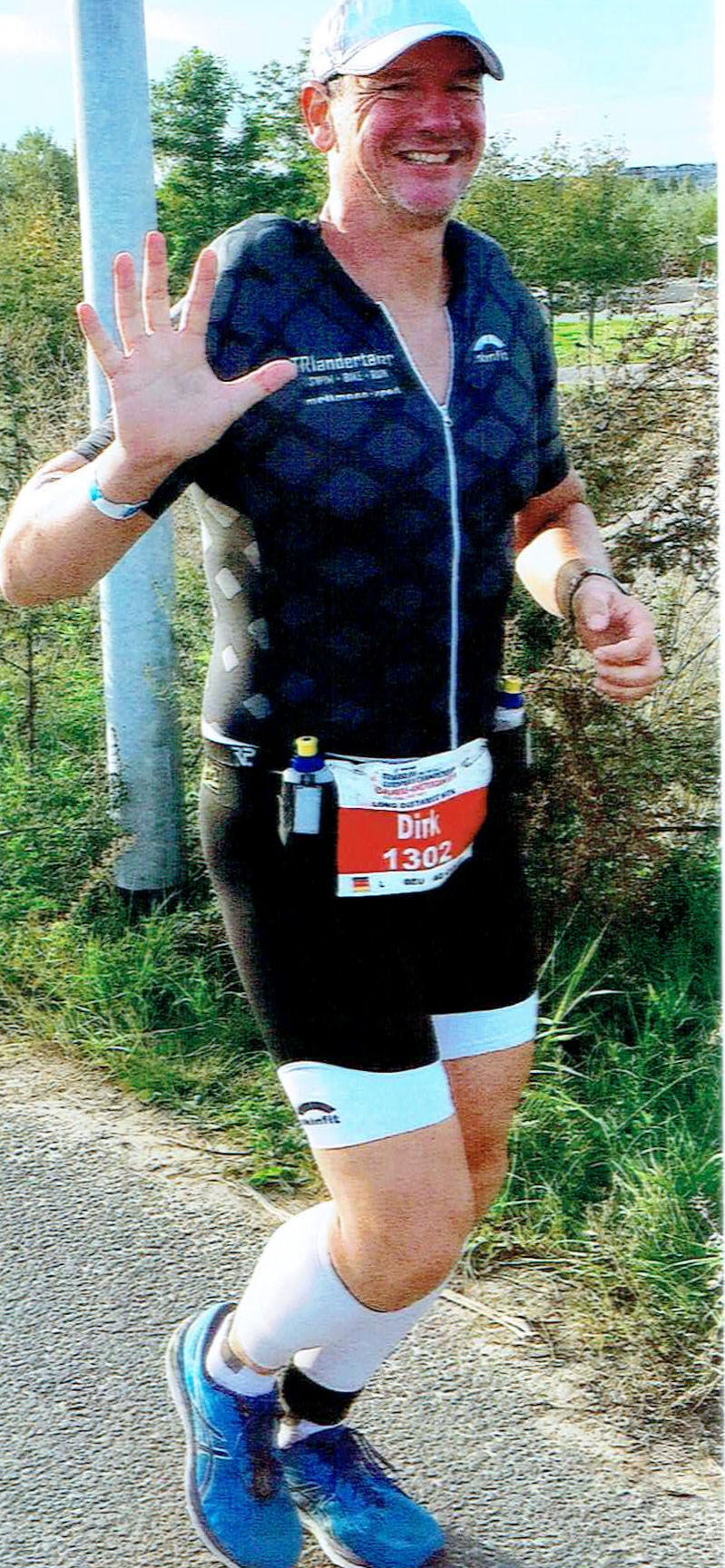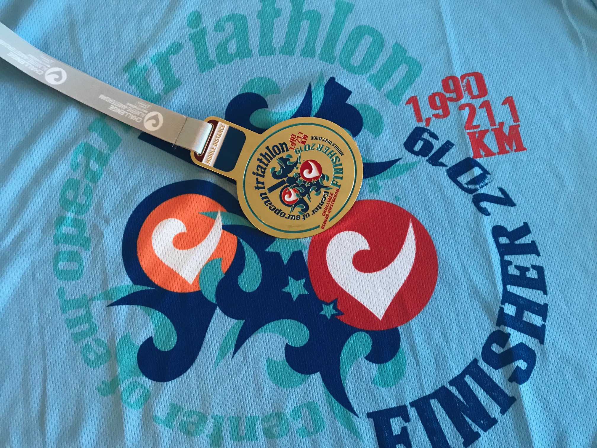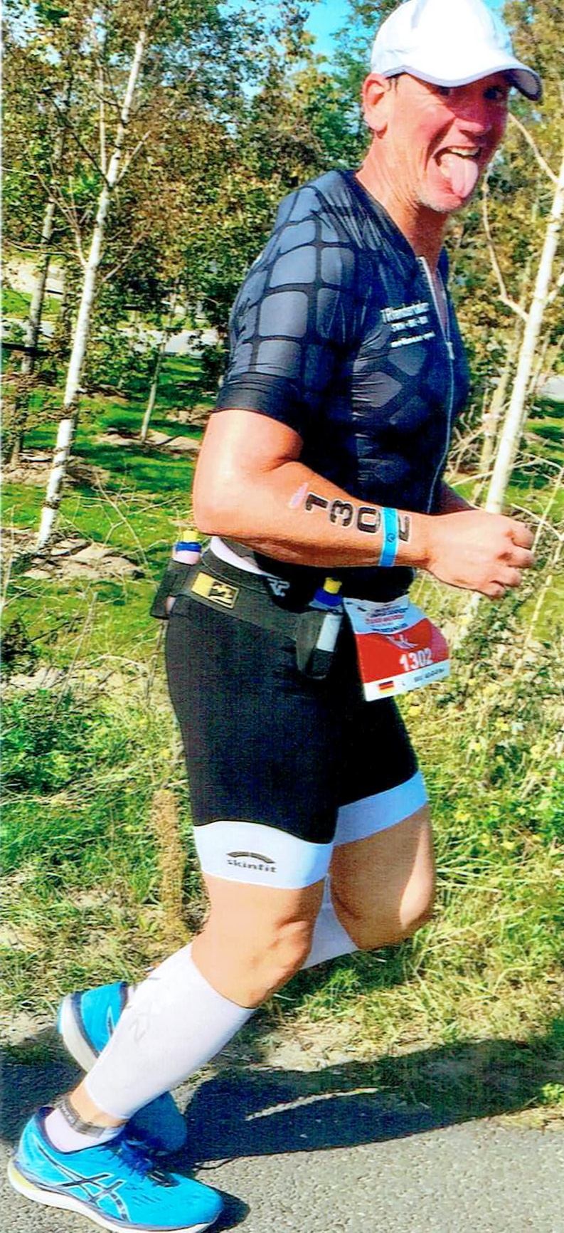 Sammlung von Triathlon-Ausrüstung: Startnummer, Gels, Flyer und bunte Taschen auf einem Tisch.