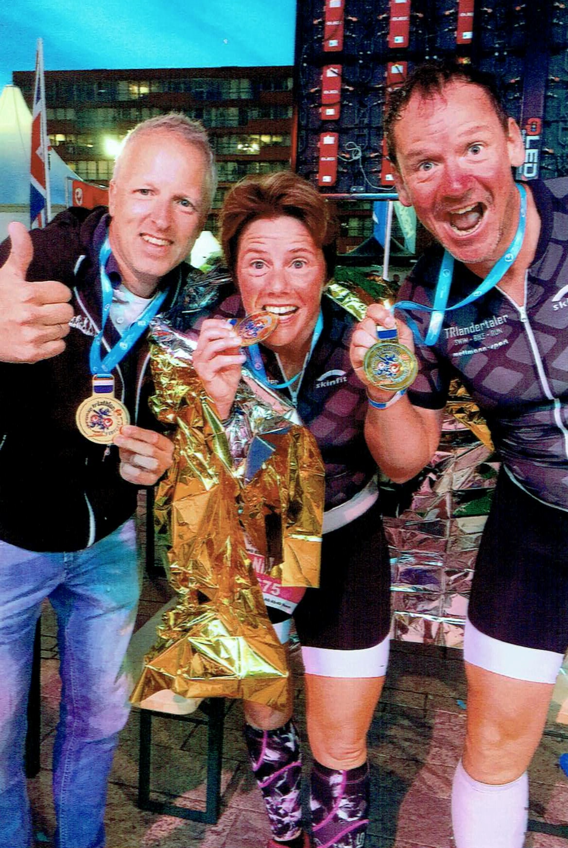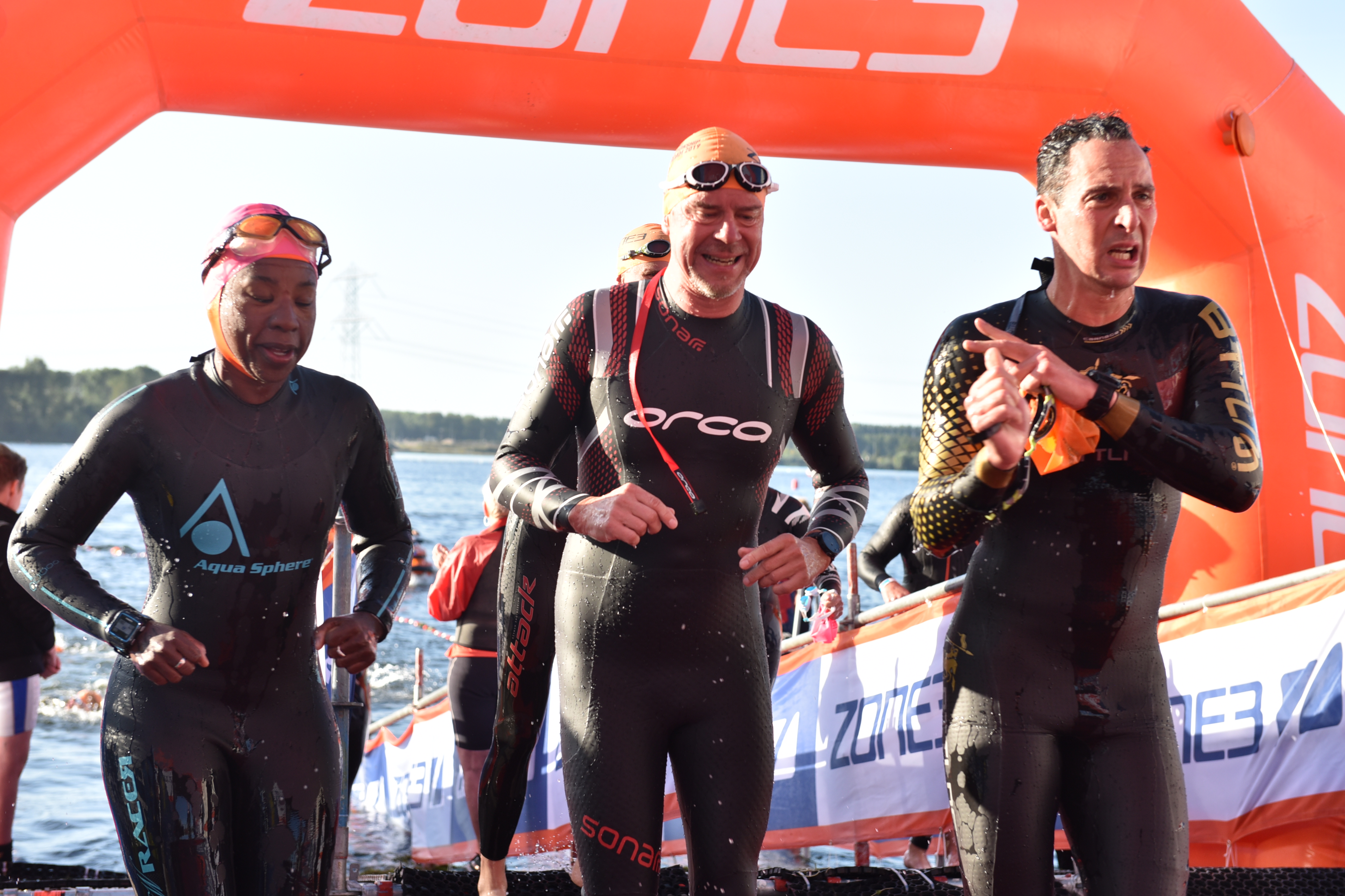 Drei Schwimmer in Neoprenanzügen stehen am Ufer, hinter ihnen ist ein orangefarbener Zielbogen sichtbar.
