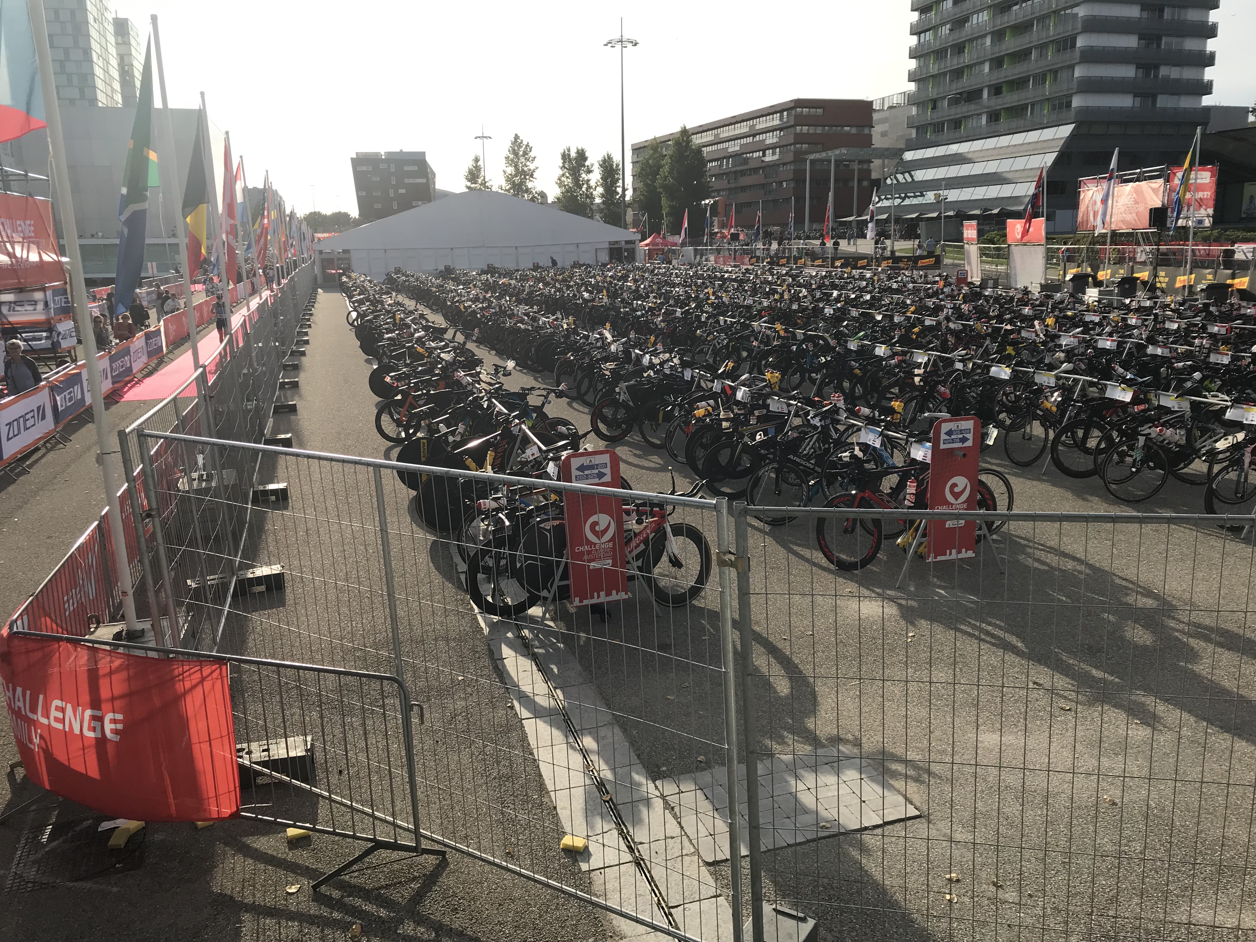 Große Fahrradabstellfläche mit vielen Fahrrädern, umgeben von Absperrungen und Fahnen, unter klarem Himmel.