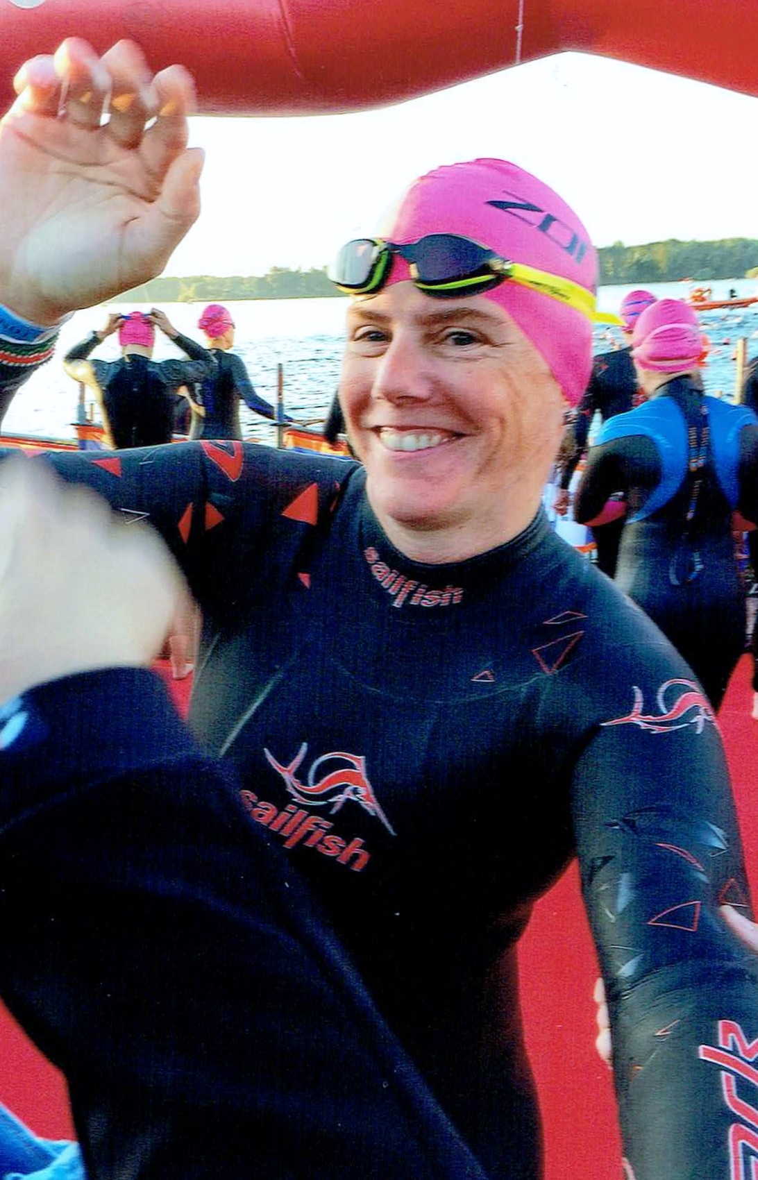 Lächelnde Person in einem Neoprenanzug, mit rosa Badekappe, an einem Wasserstartpunkt mit Schwimmern im Hintergrund.