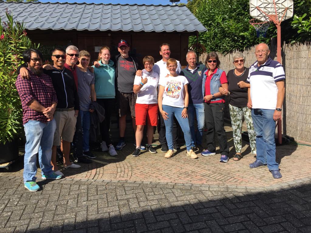 Menschen stehen an einem Registrierungsstand mit Blick auf einen See und bewölkten Himmel im Hintergrund.