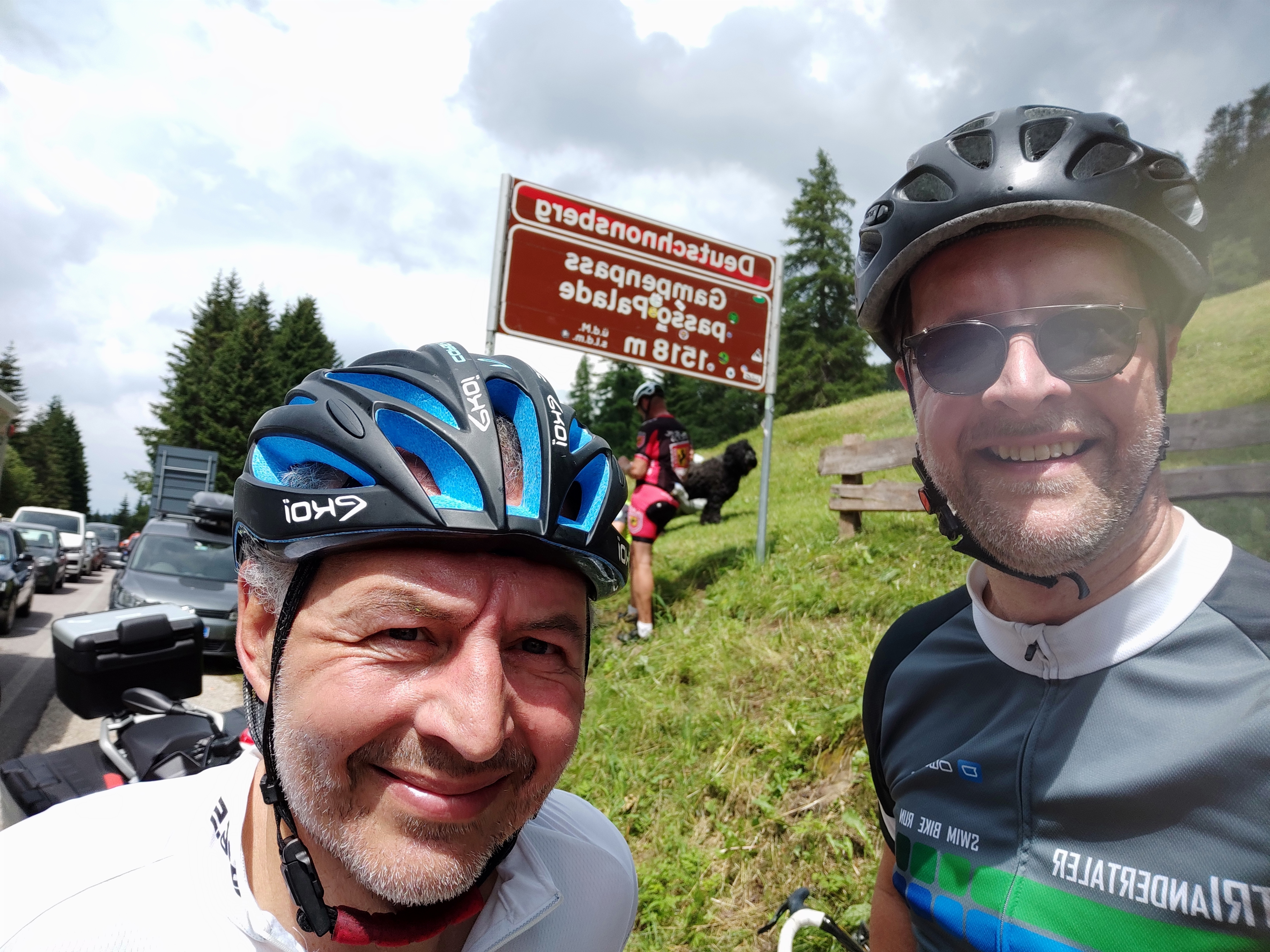 Selbstporträt von zwei Radfahrern mit Helmen vor einem Schild, das auf den Deutenhauserpass hinweist. Verkehr im Hintergrund.