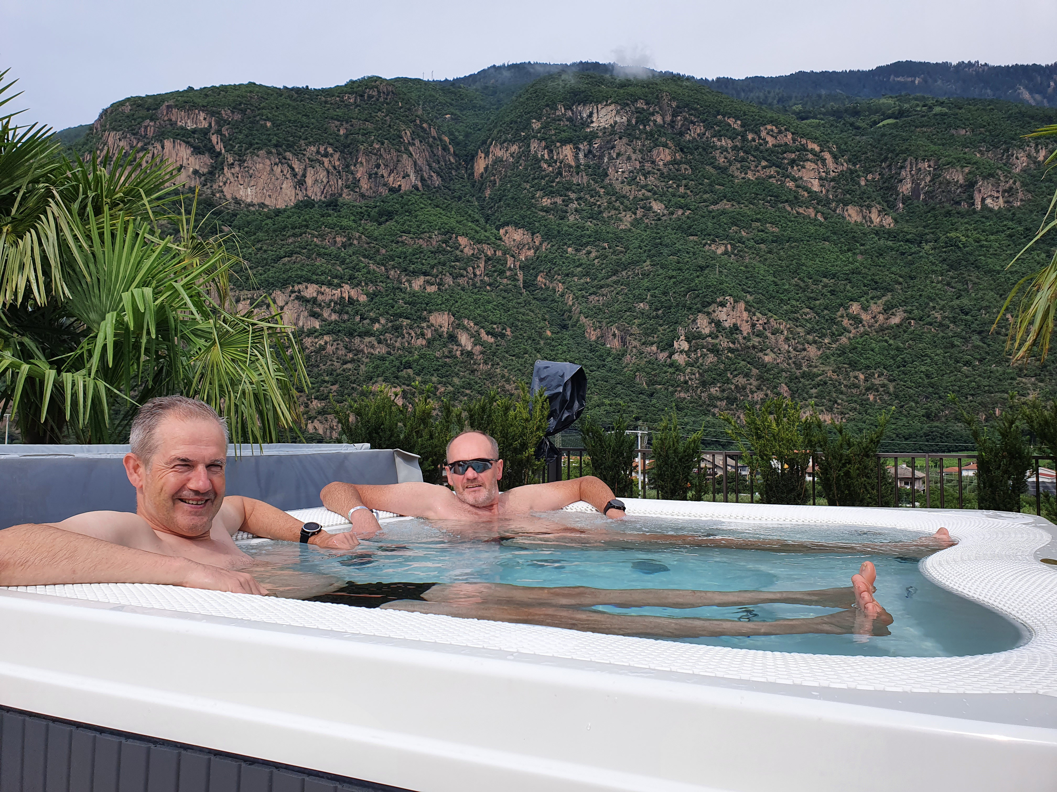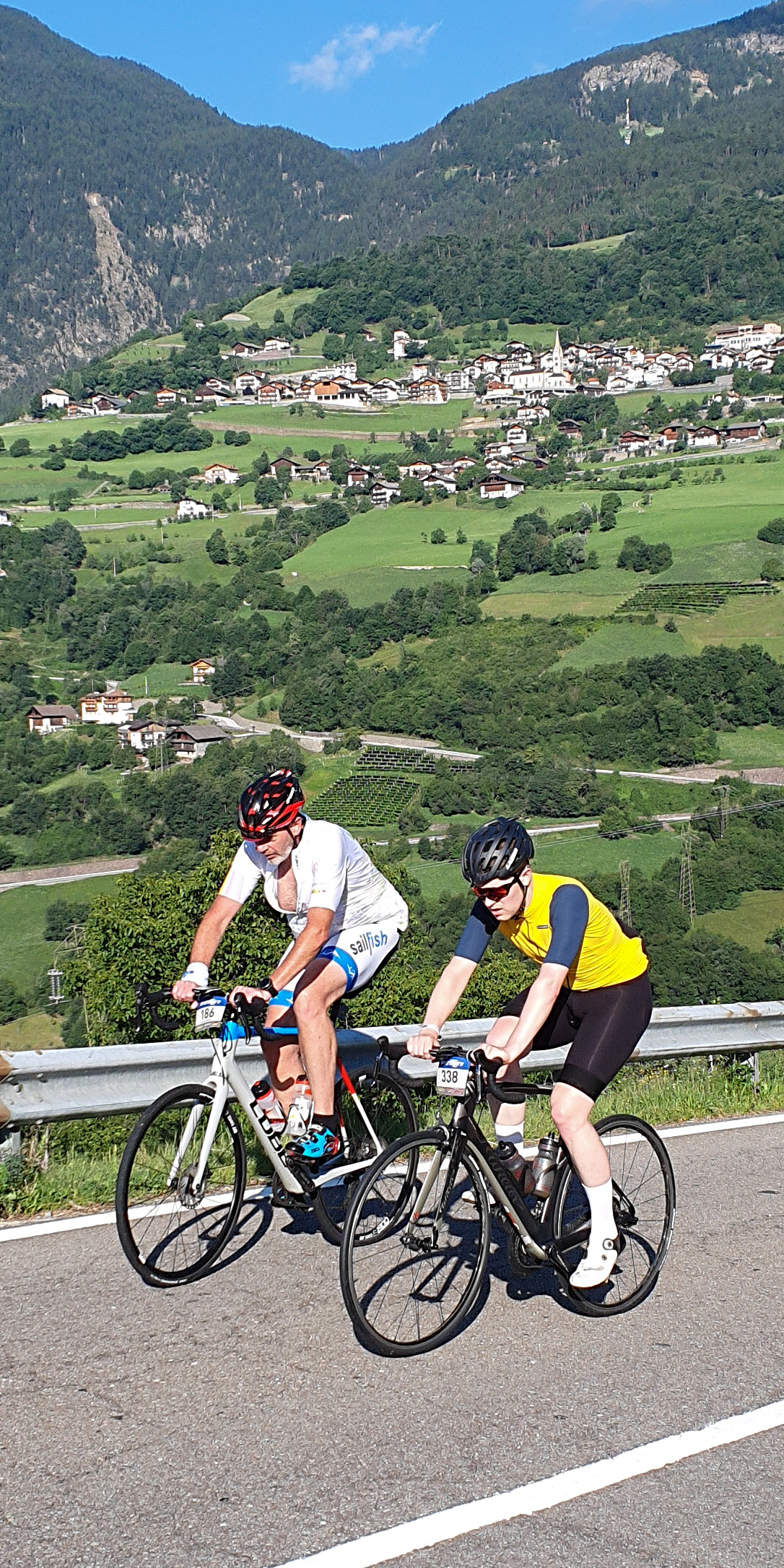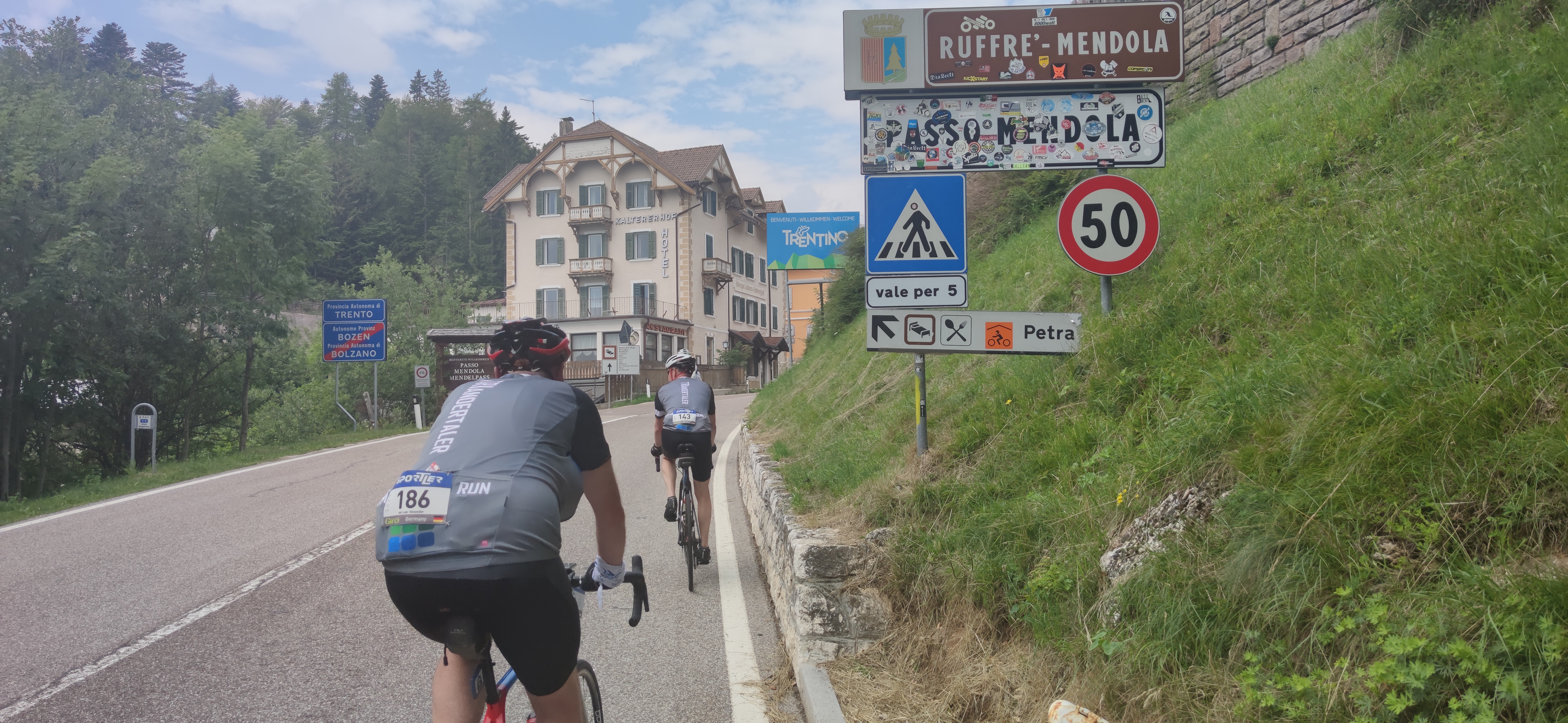 Zwei Radfahrer fahren auf einer Straße vorbei an einem Hotel und Verkehrsschildern zum Pass Mendola.