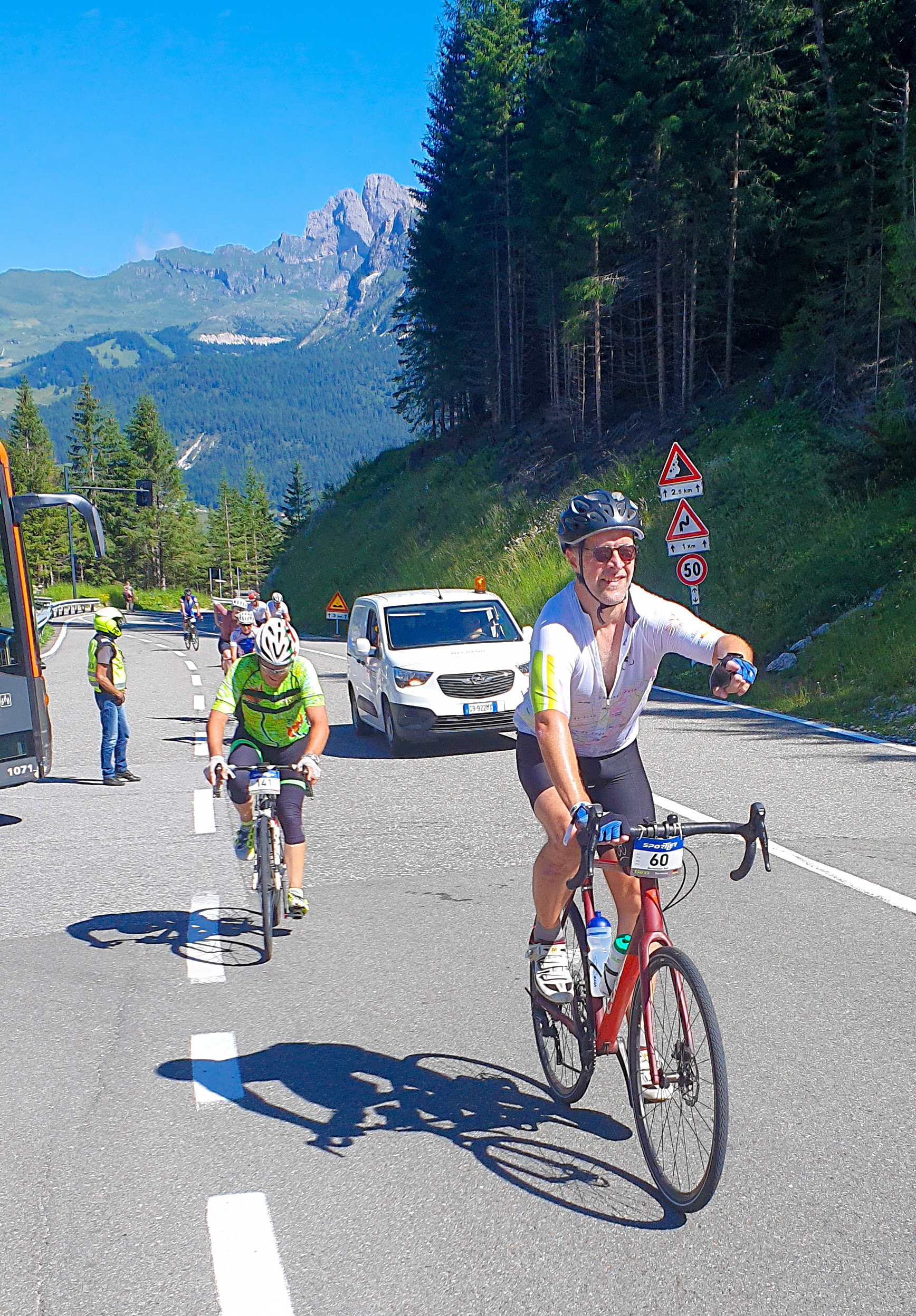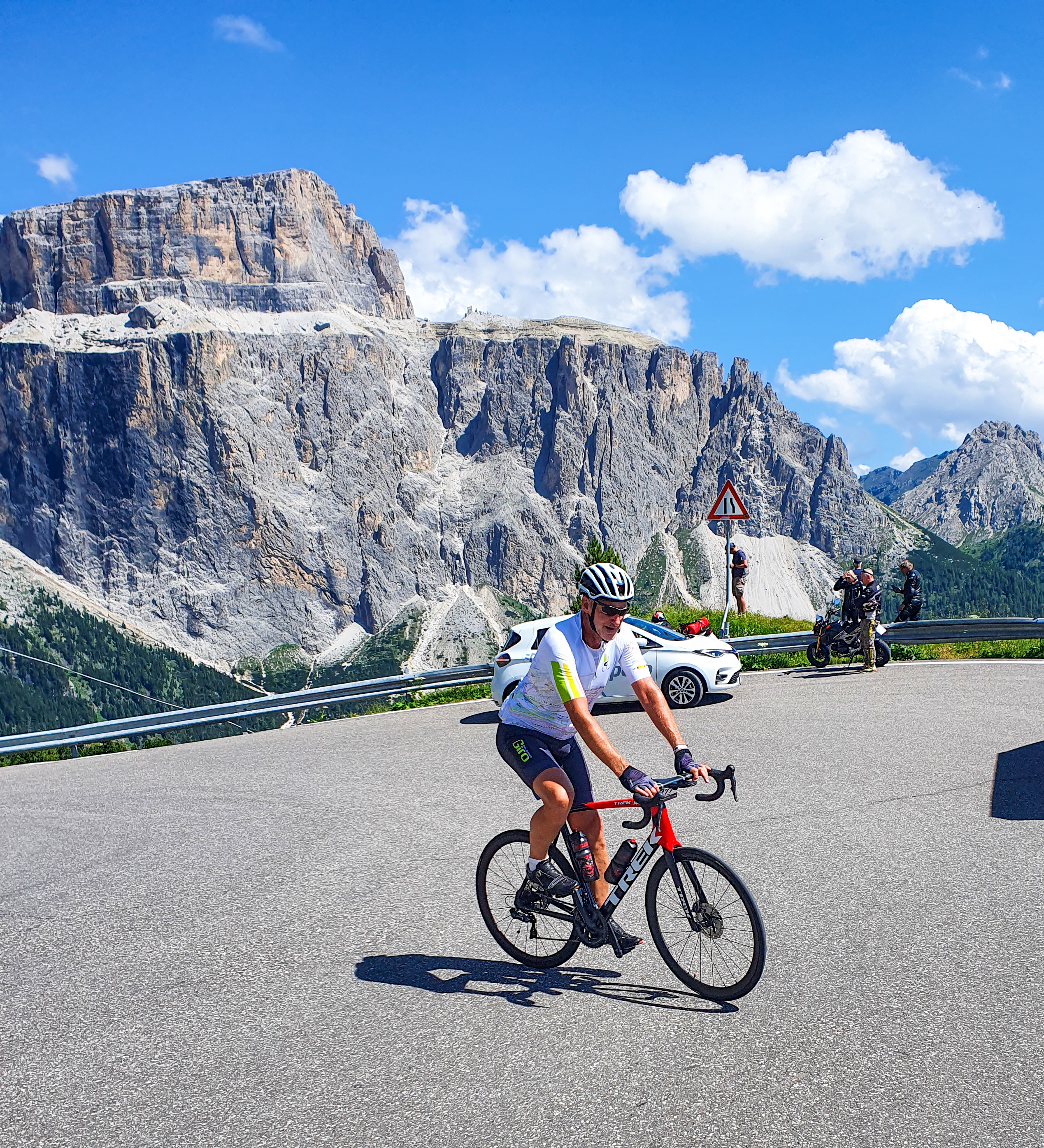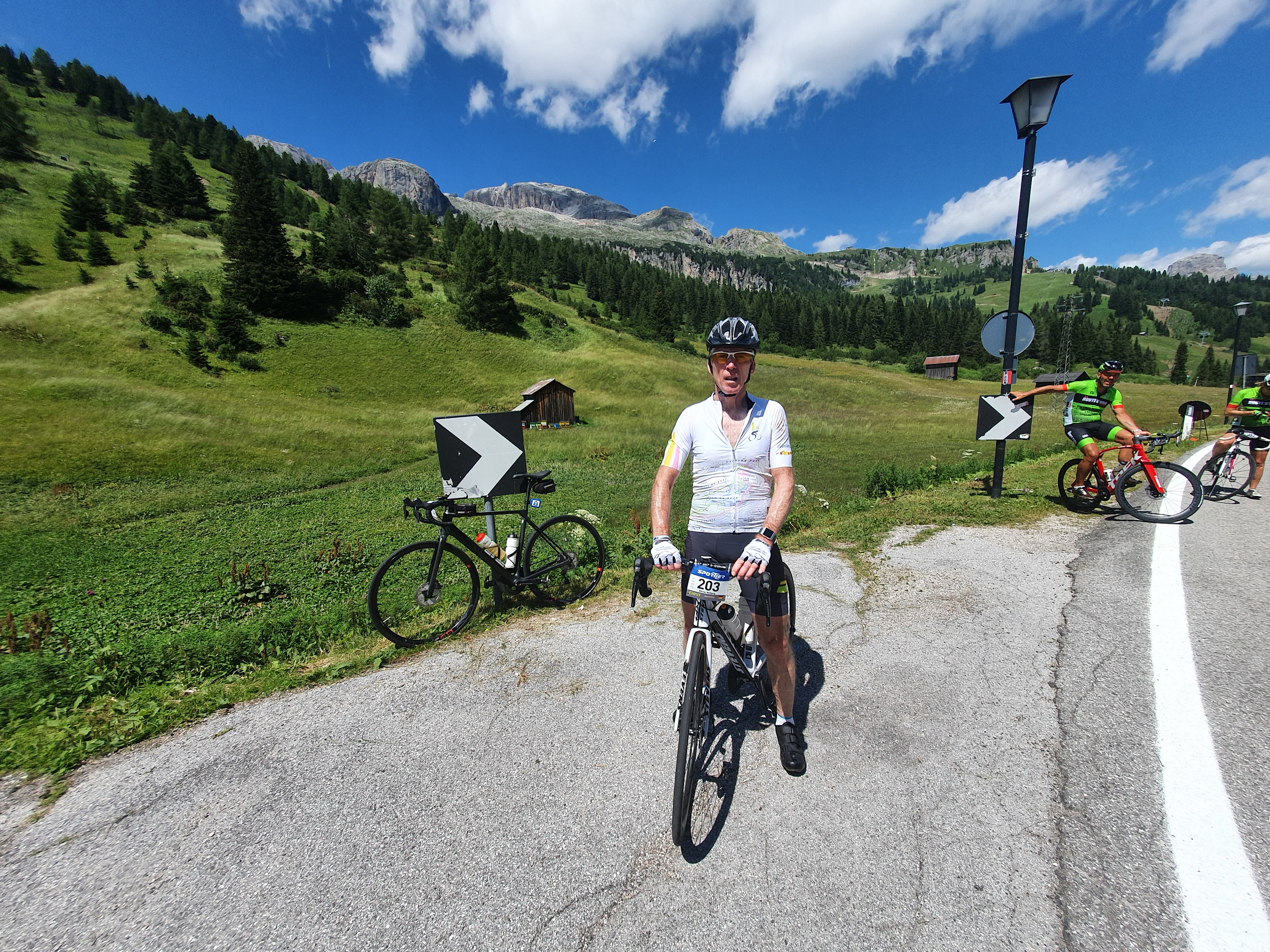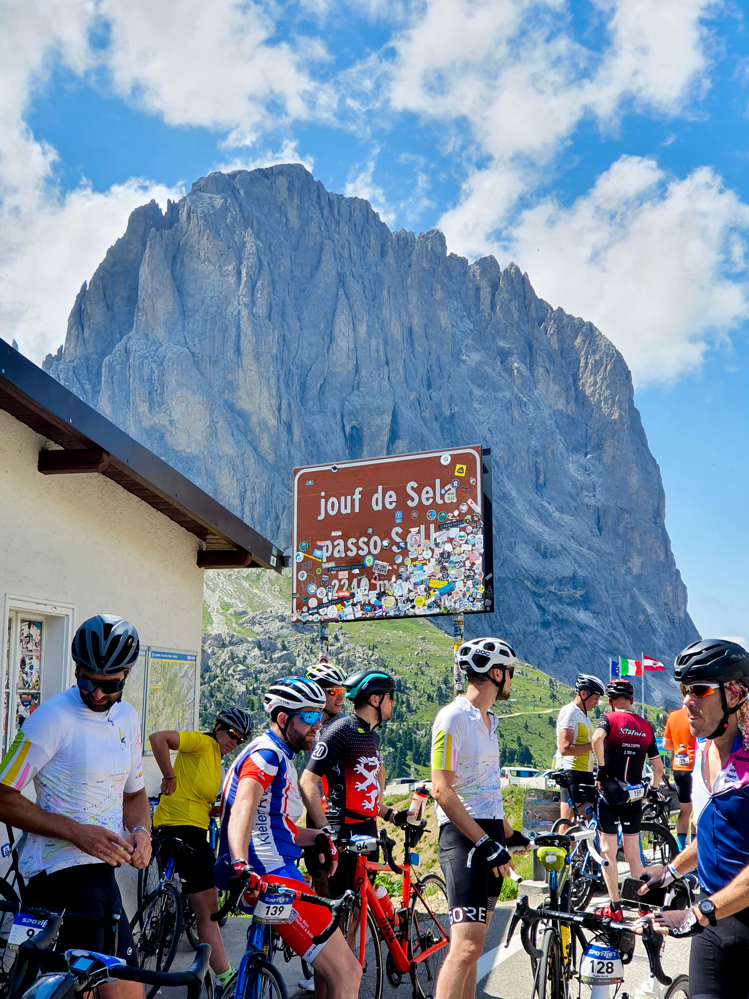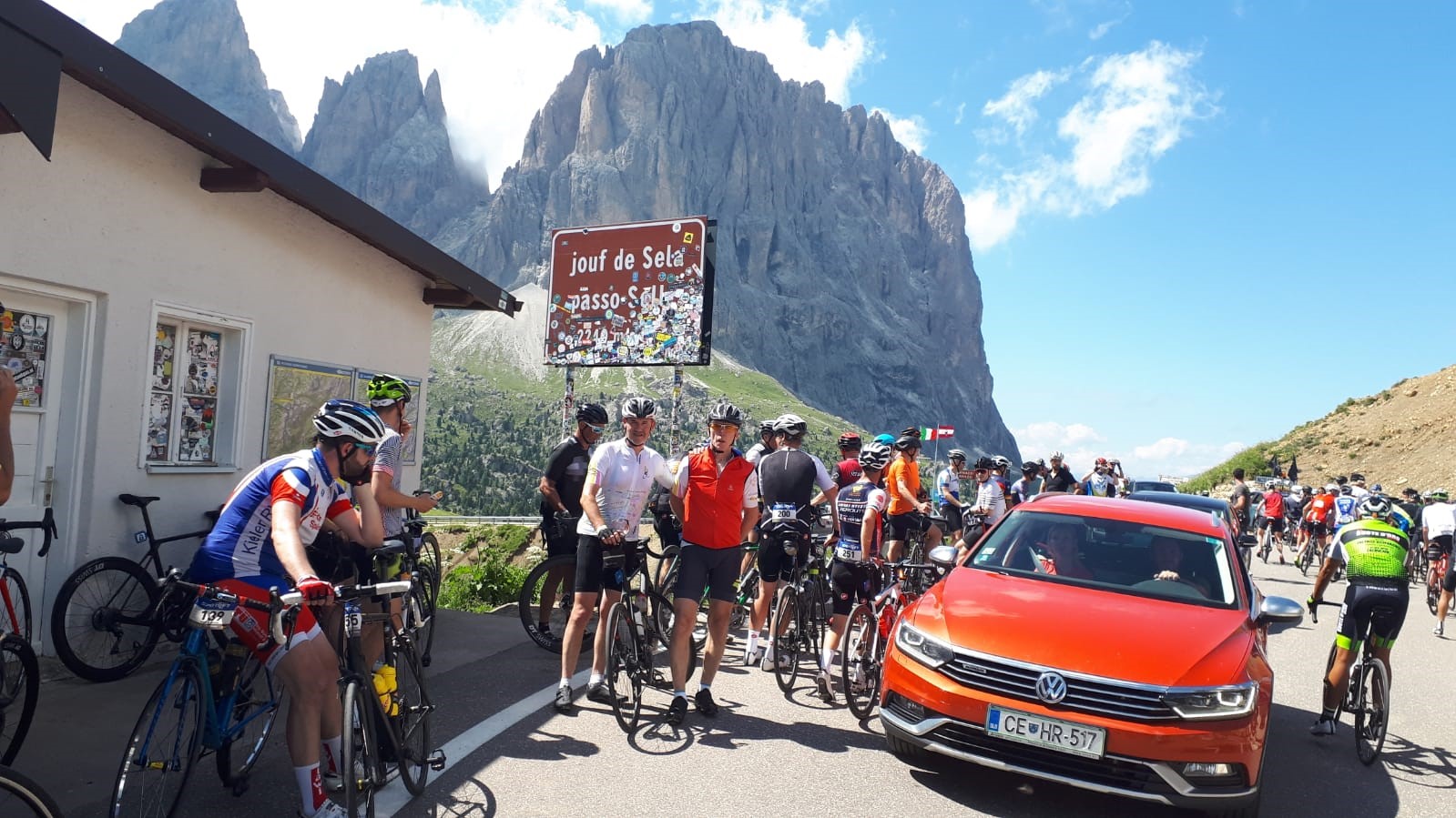 Gruppierung von Radfahrern neben einem Auto vor einer Berglandschaft, beschildert mit "passo Sella".