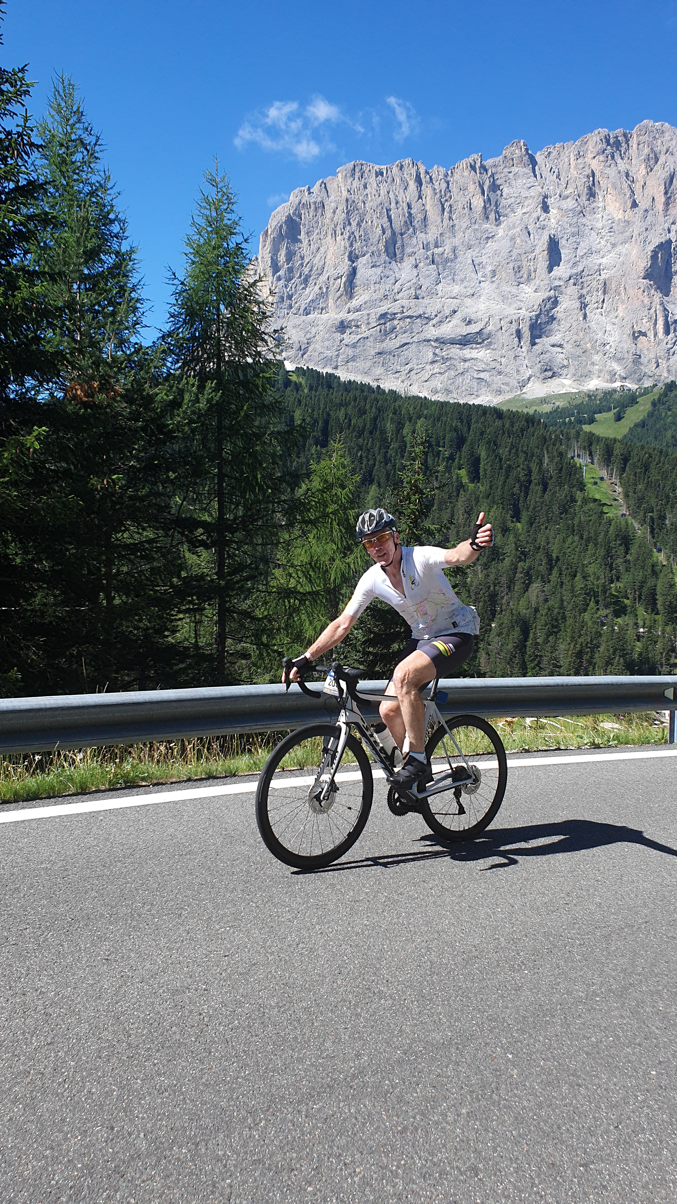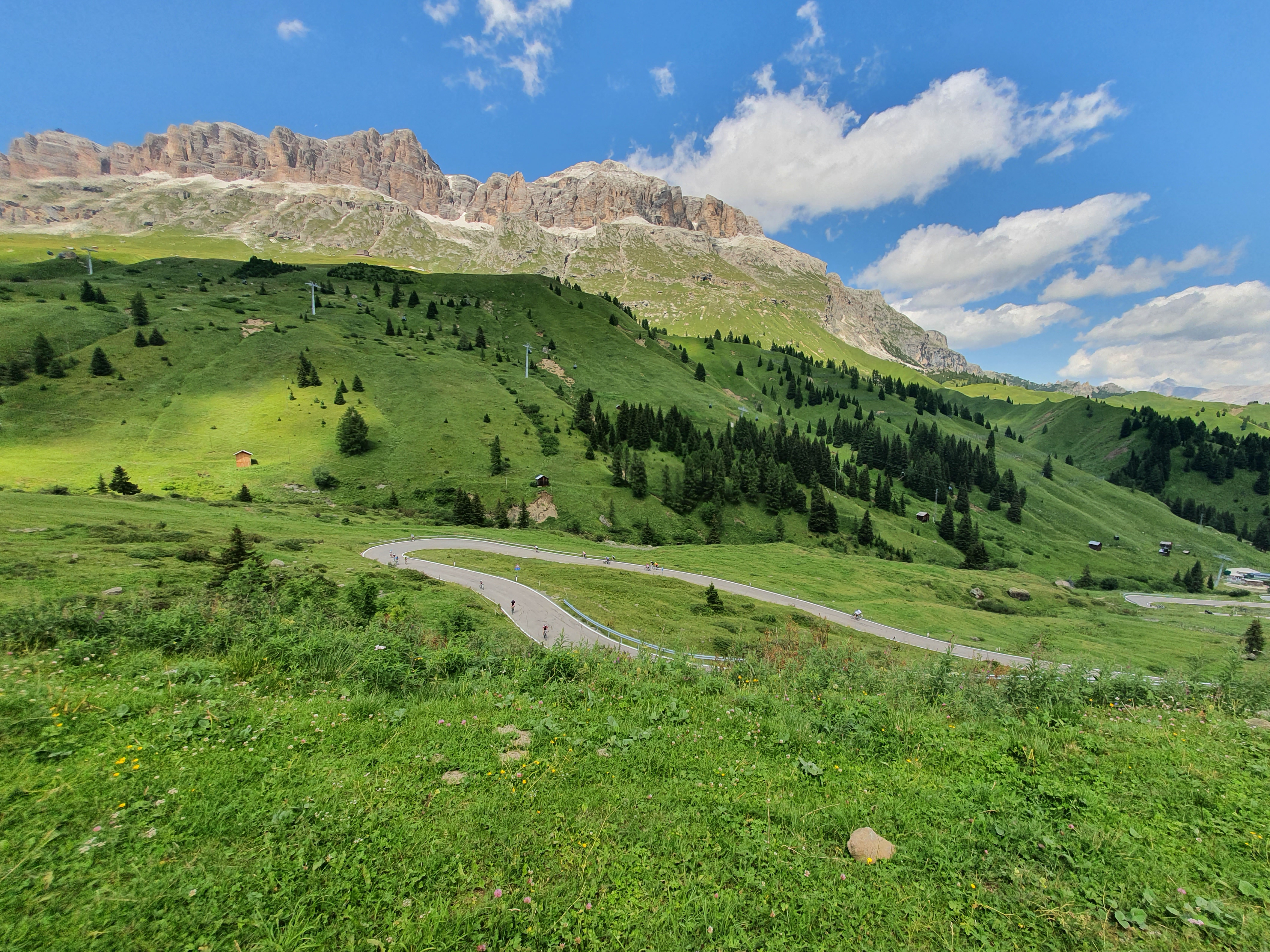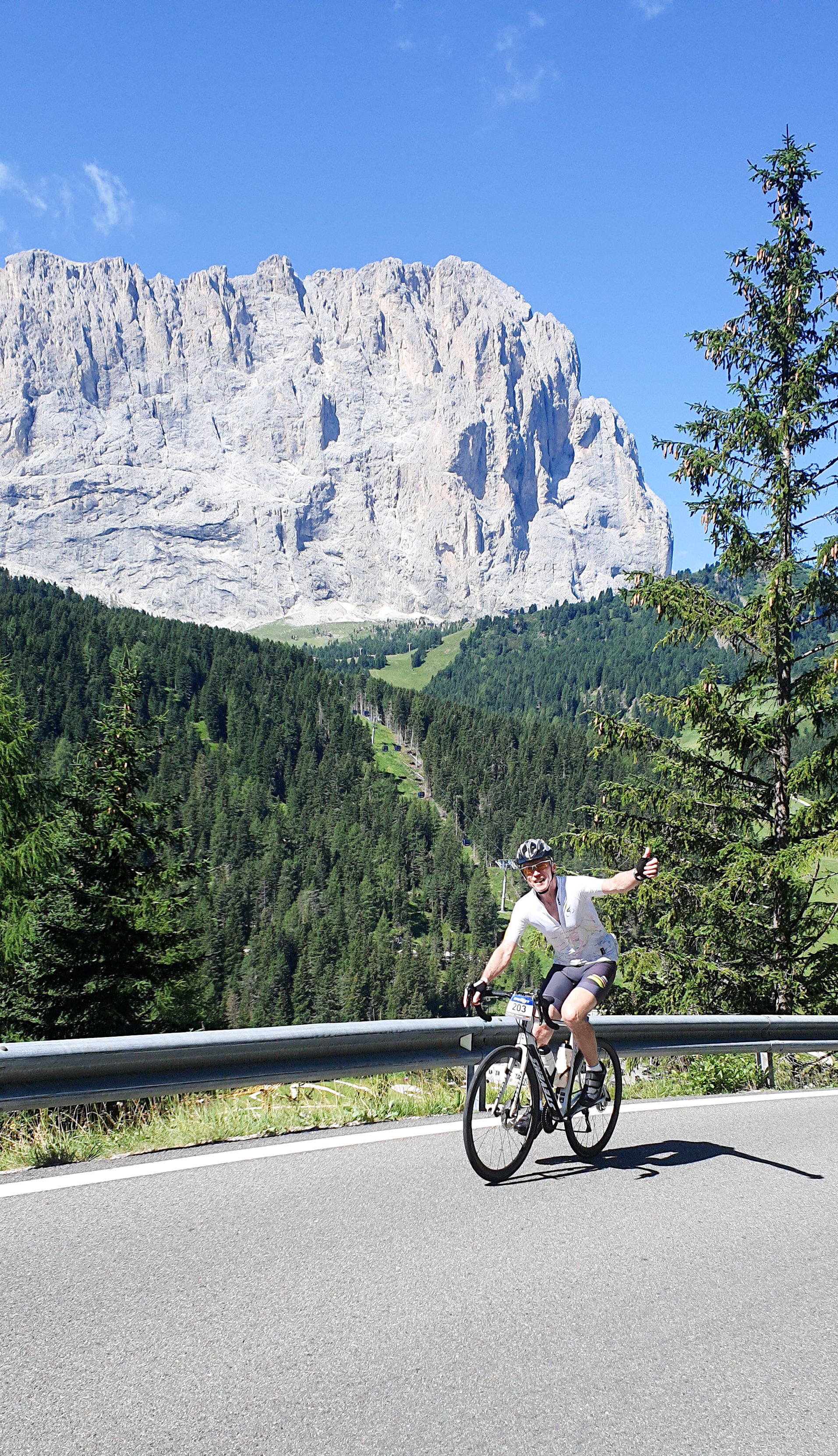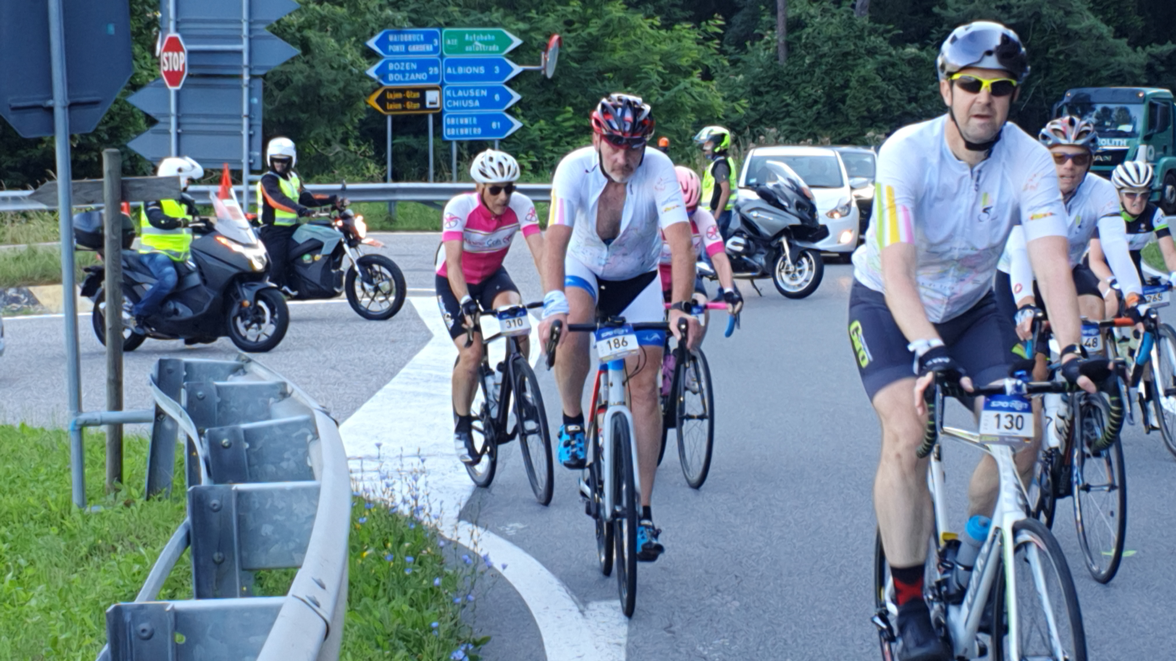 Gruppierung von Radfahrern neben einem Auto vor einer Berglandschaft, beschildert mit "passo Sella".