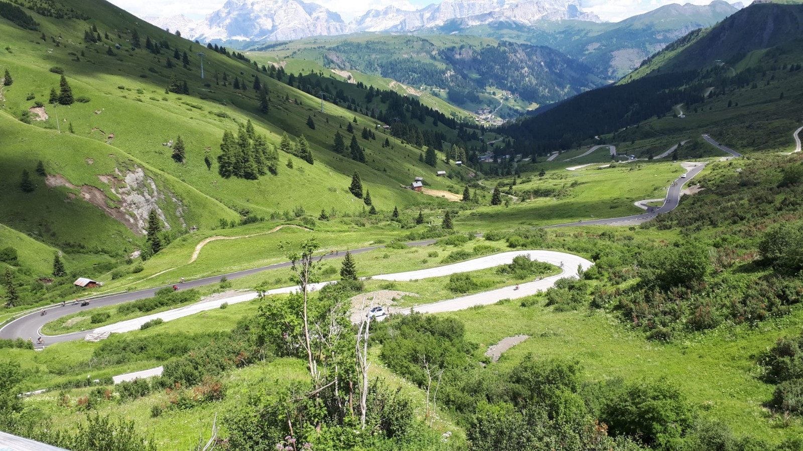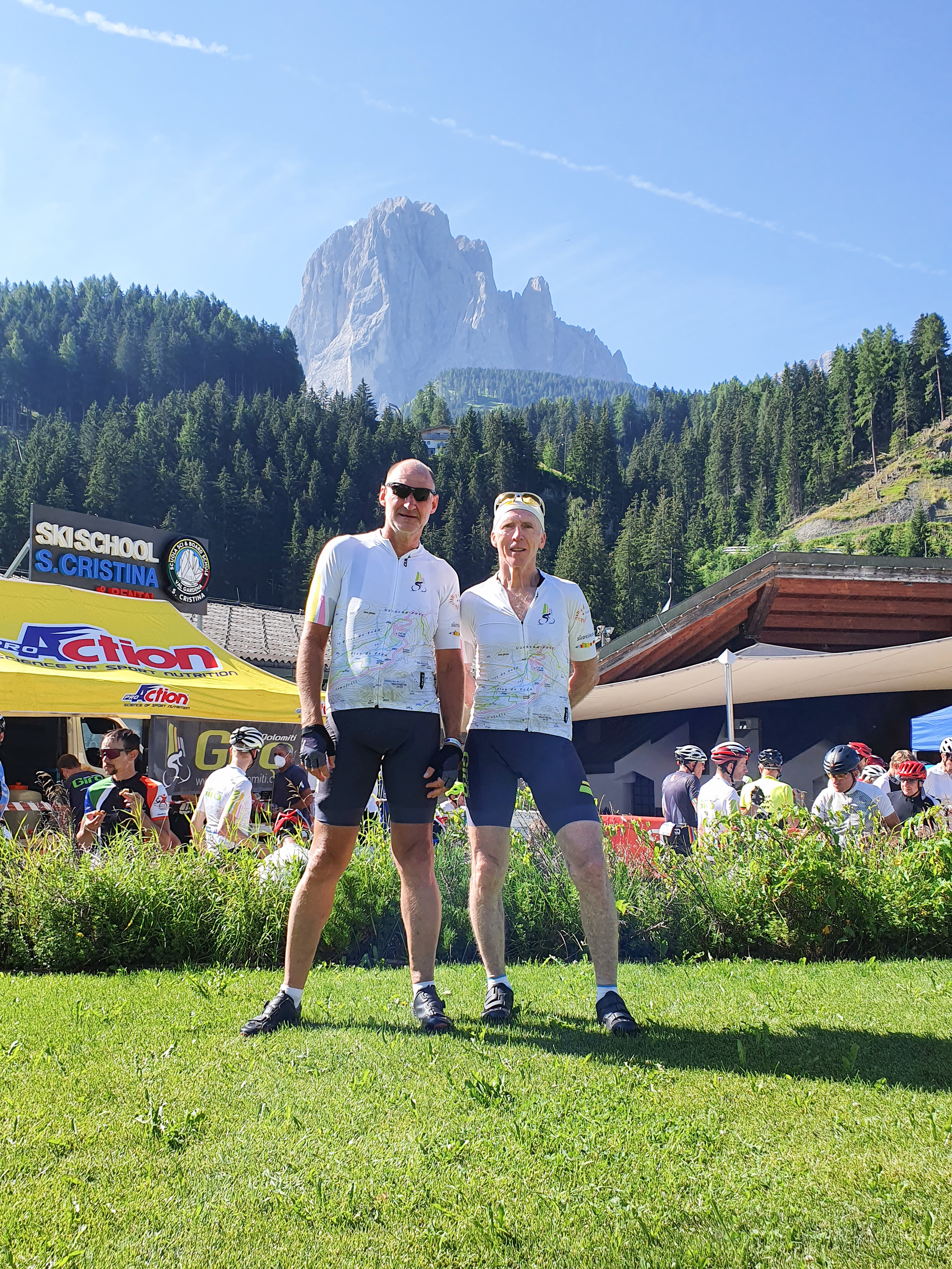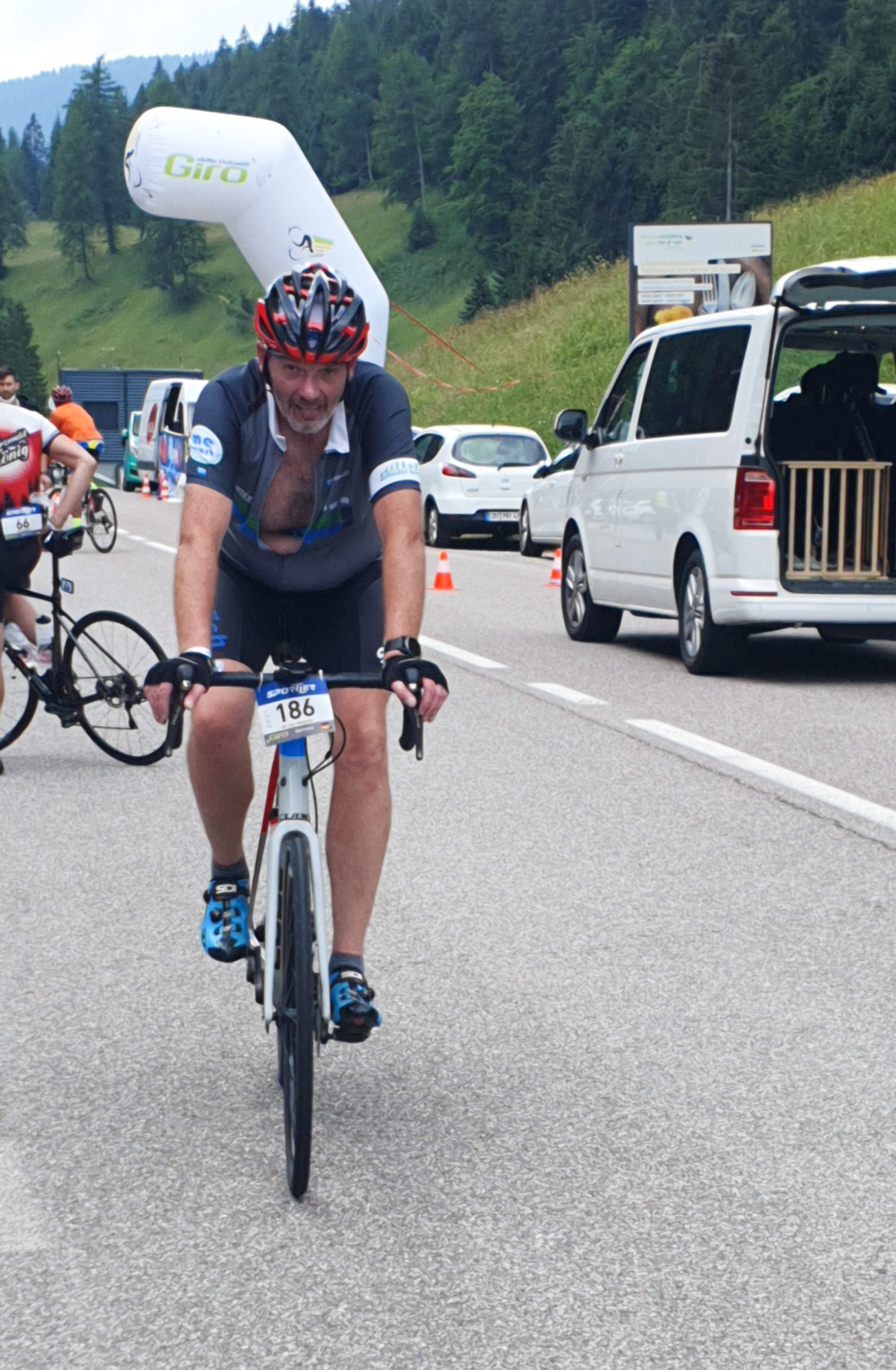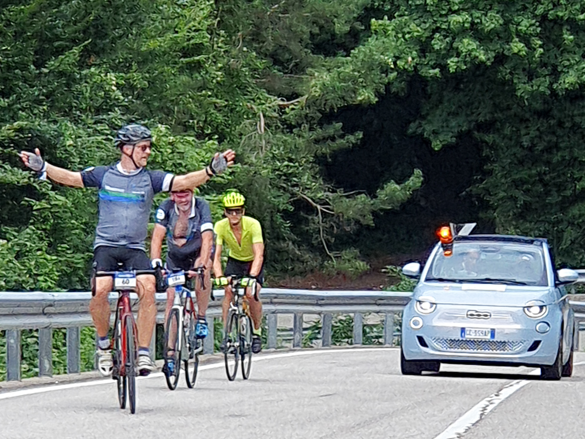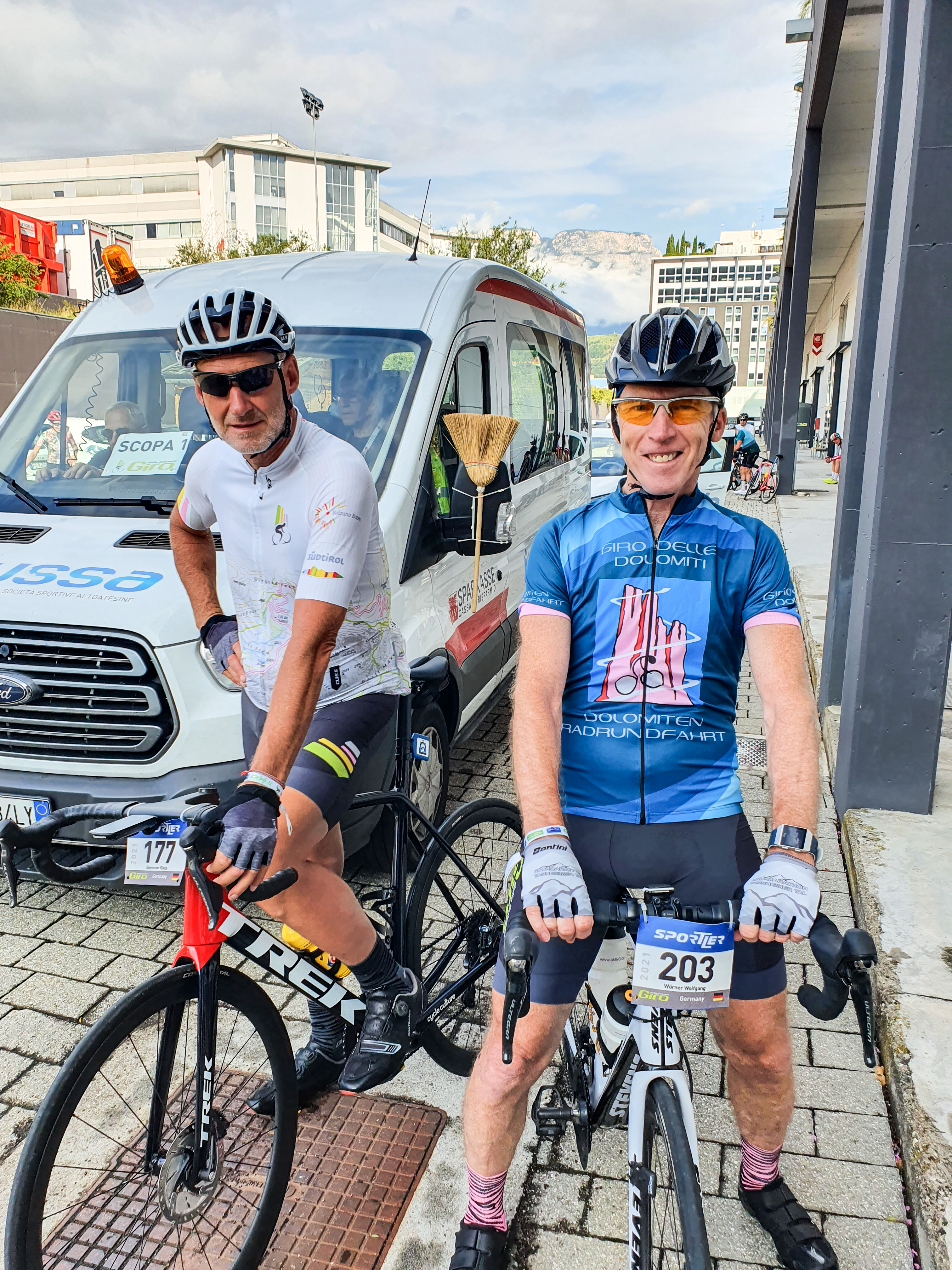 Gruppierung von Radfahrern neben einem Auto vor einer Berglandschaft, beschildert mit "passo Sella".