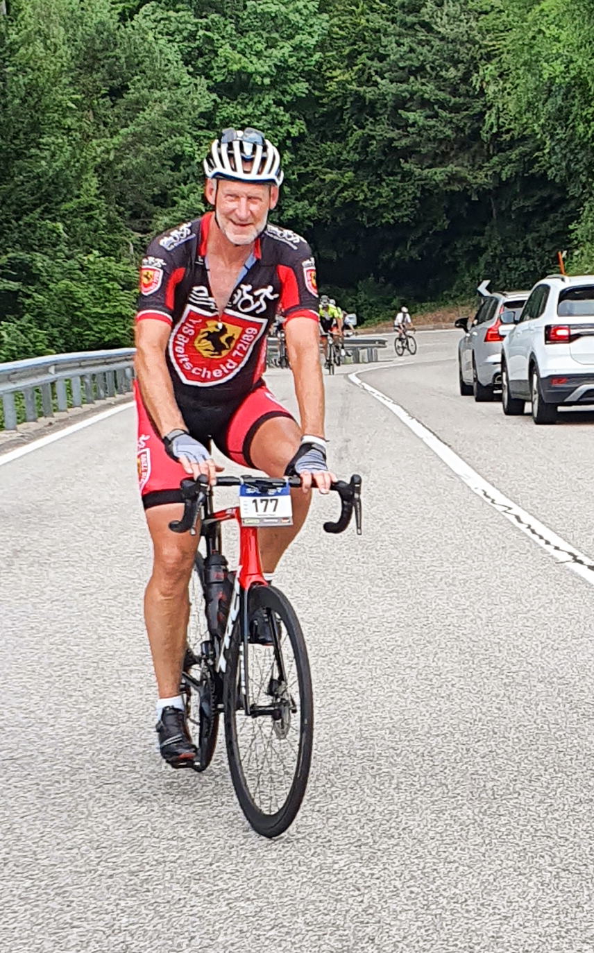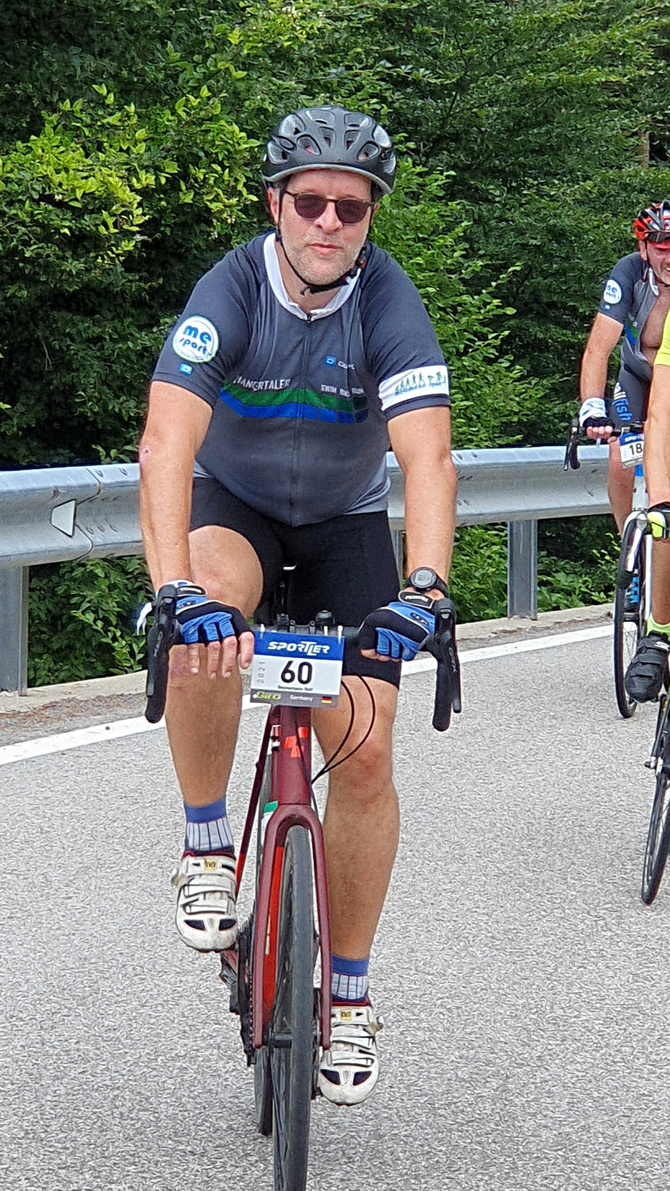 Selbstporträt eines Radfahrers mit Helm und Brille, anderen Radfahrern im Hintergrund und Weinreben unterhalb der Berge.
