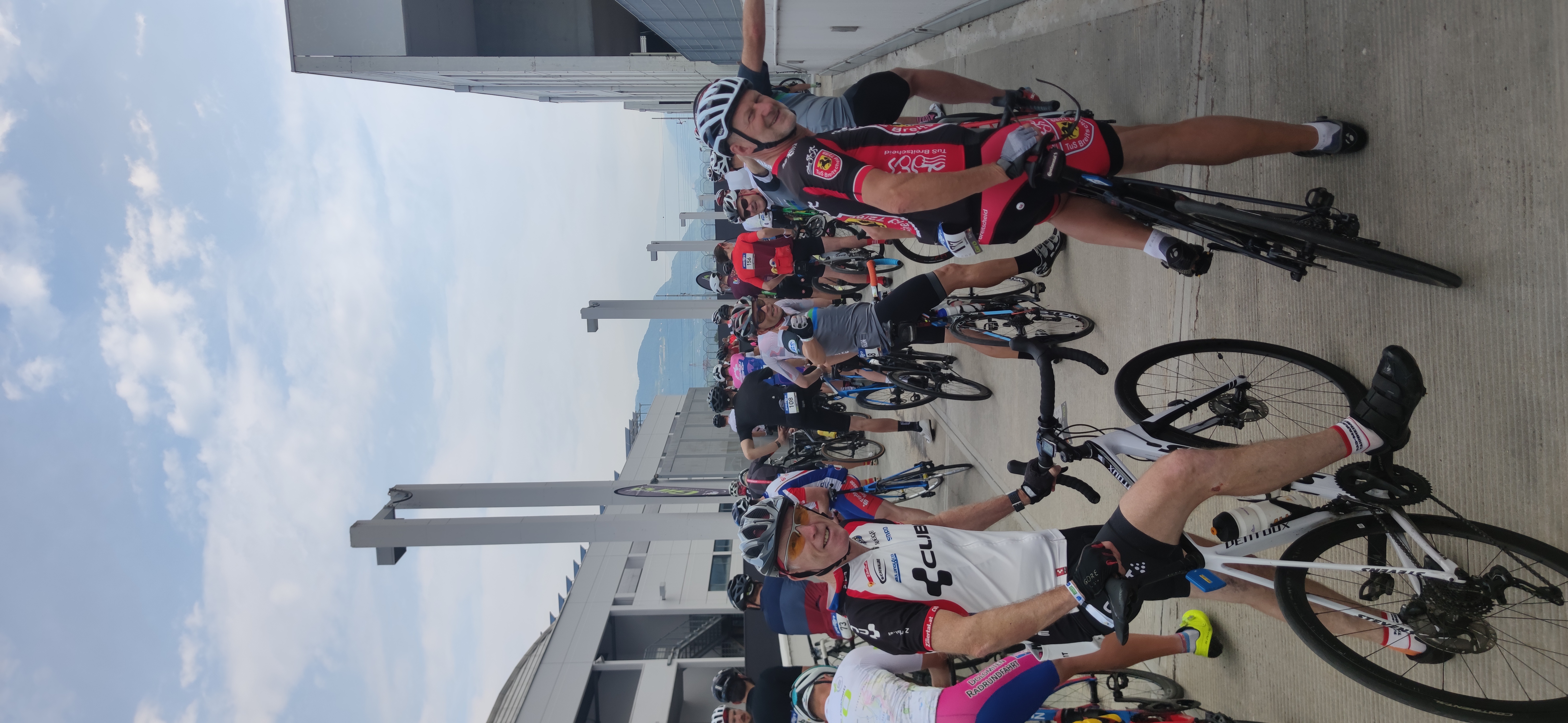 Gruppierung von Radfahrern in Sportkleidung, die auf einem Gehweg vor einem Gebäude warten.