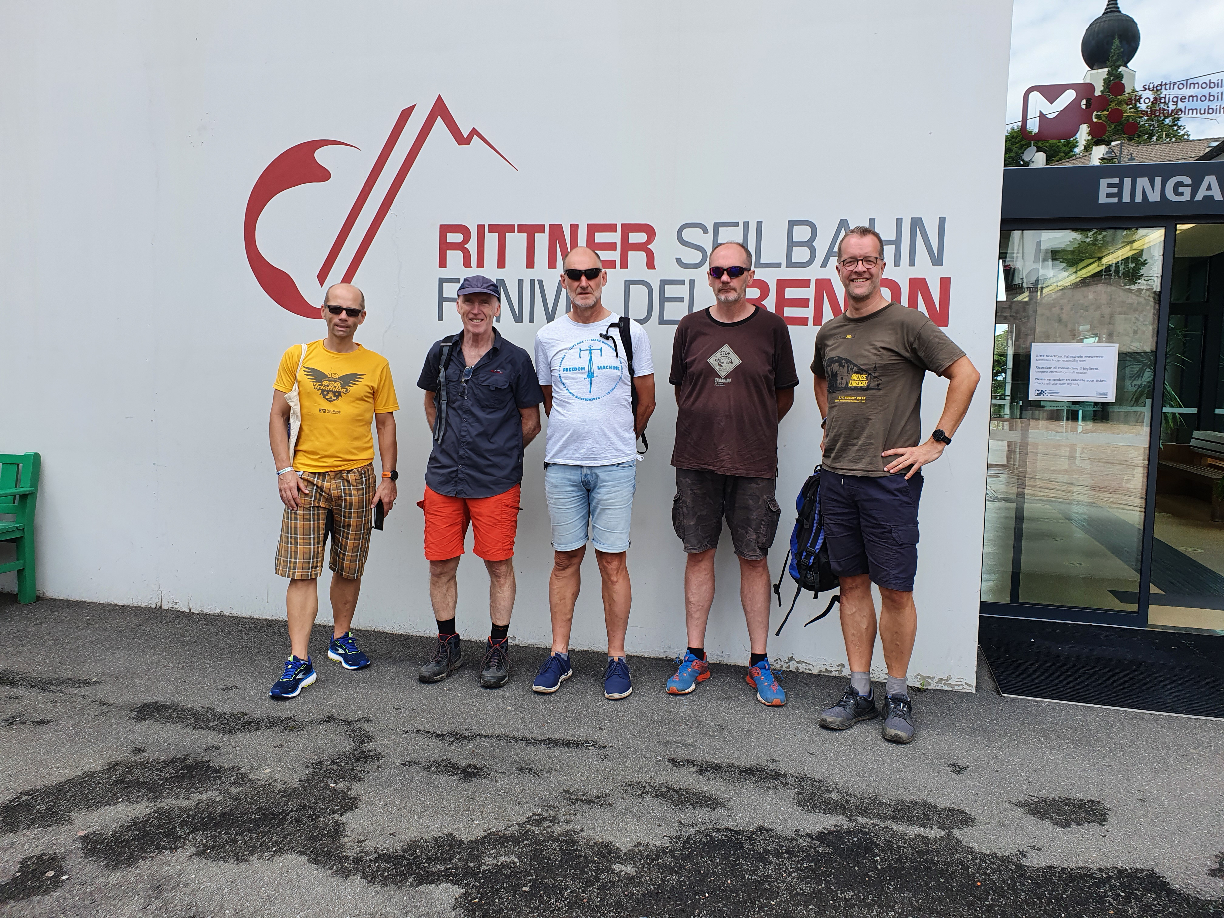 Fünf Personen stehen neben einem Wegweiser in der Natur, umgeben von Bäumen und einer Steinwand.