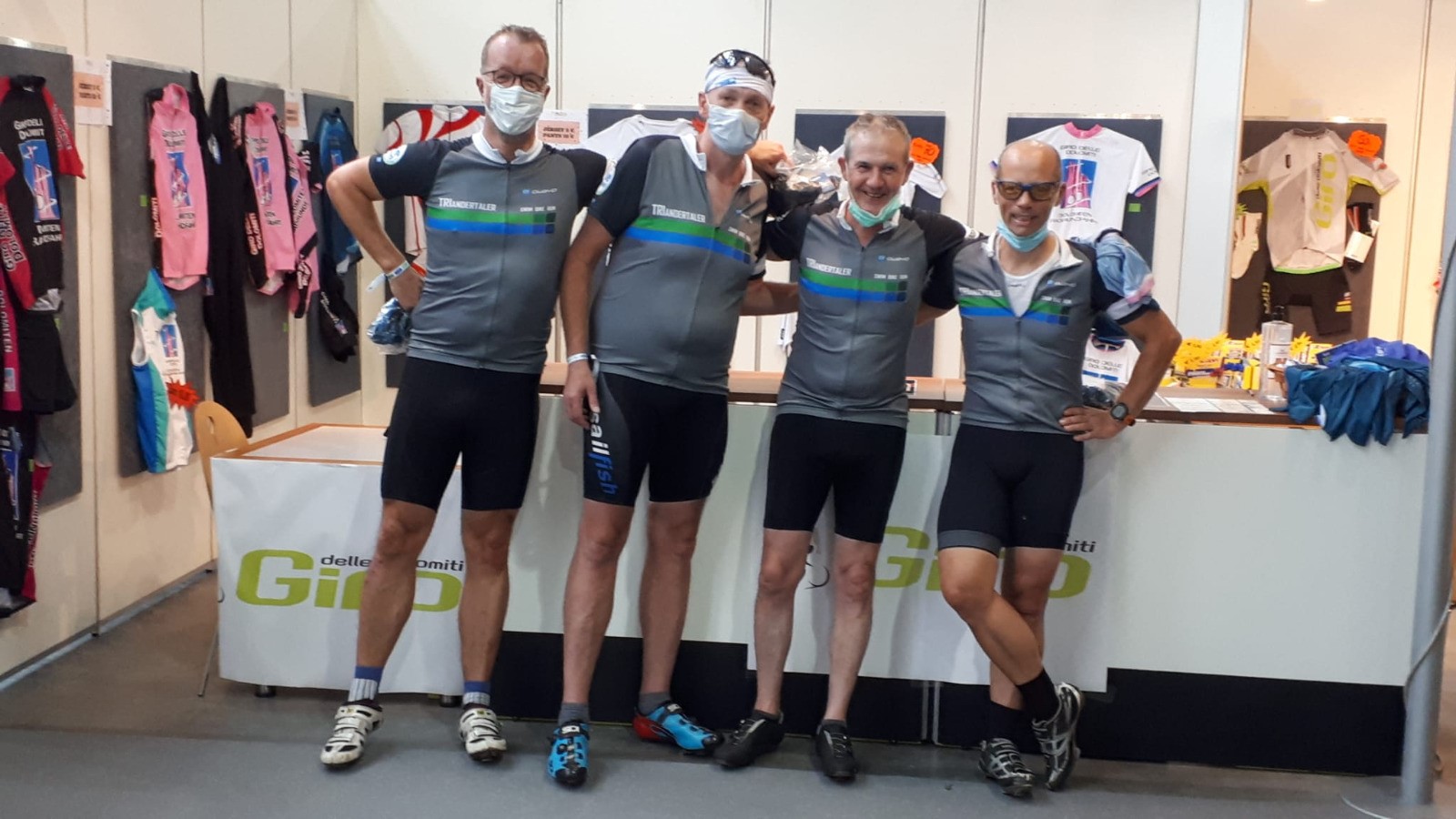 Drei Radfahrer stehen in einer Sportveranstaltung unter einem blauen Zelt und lächeln in die Kamera.